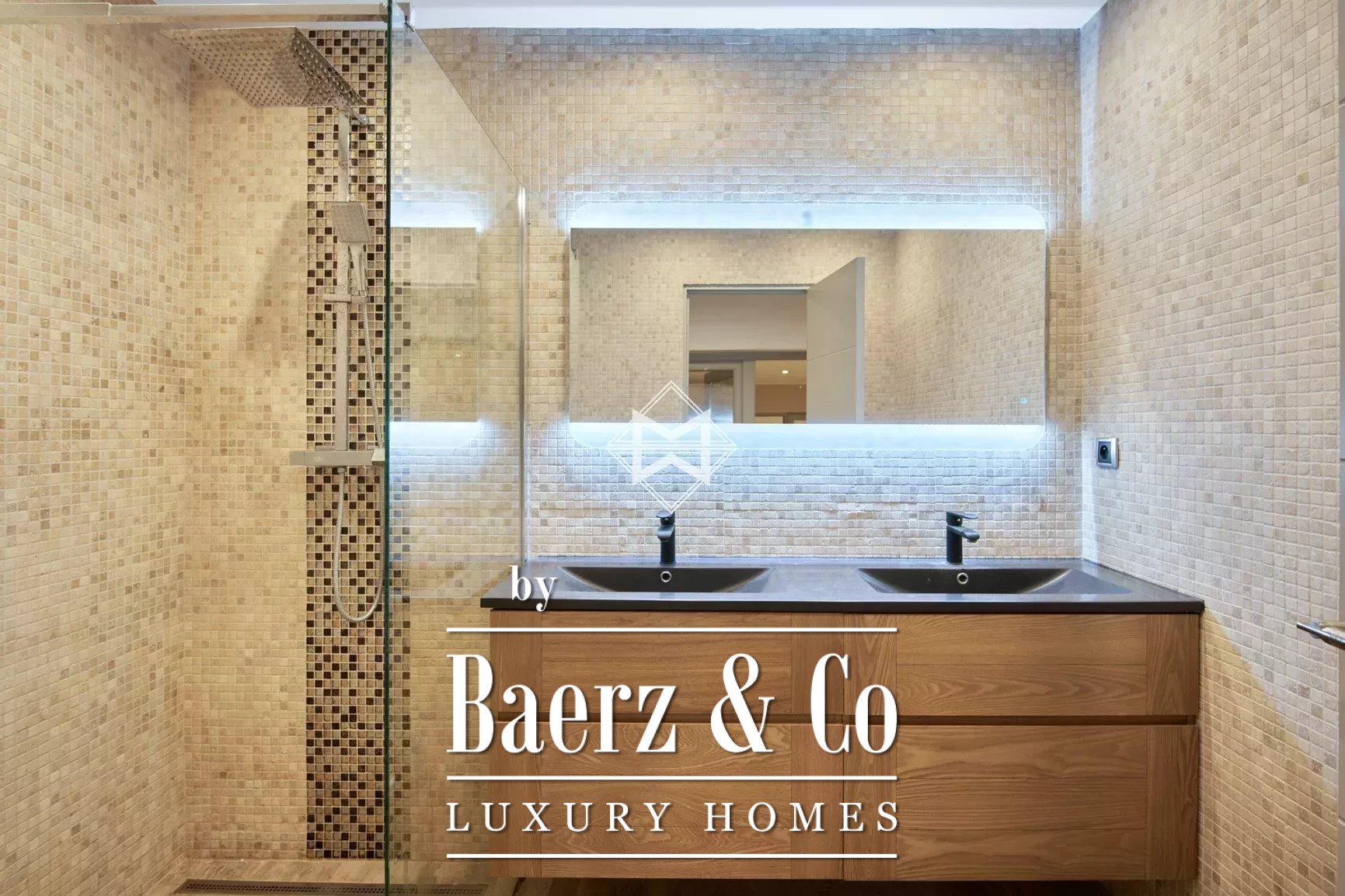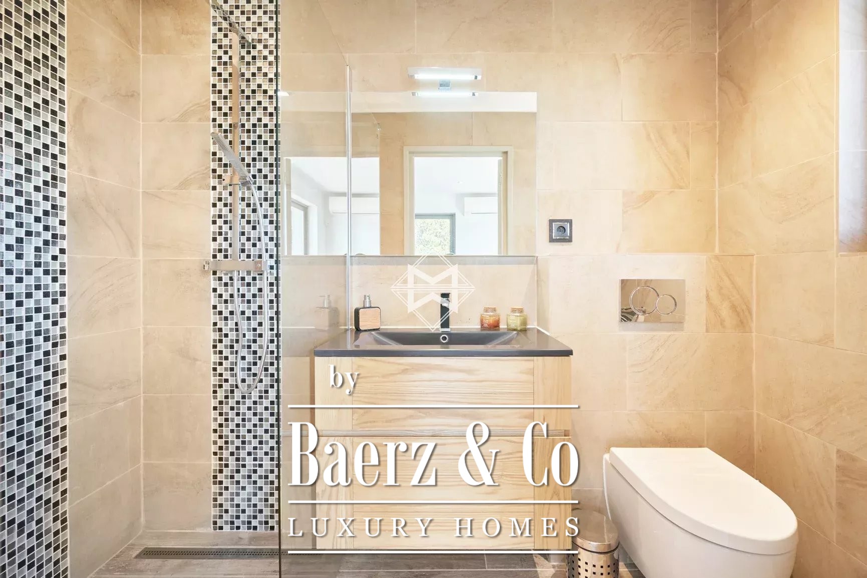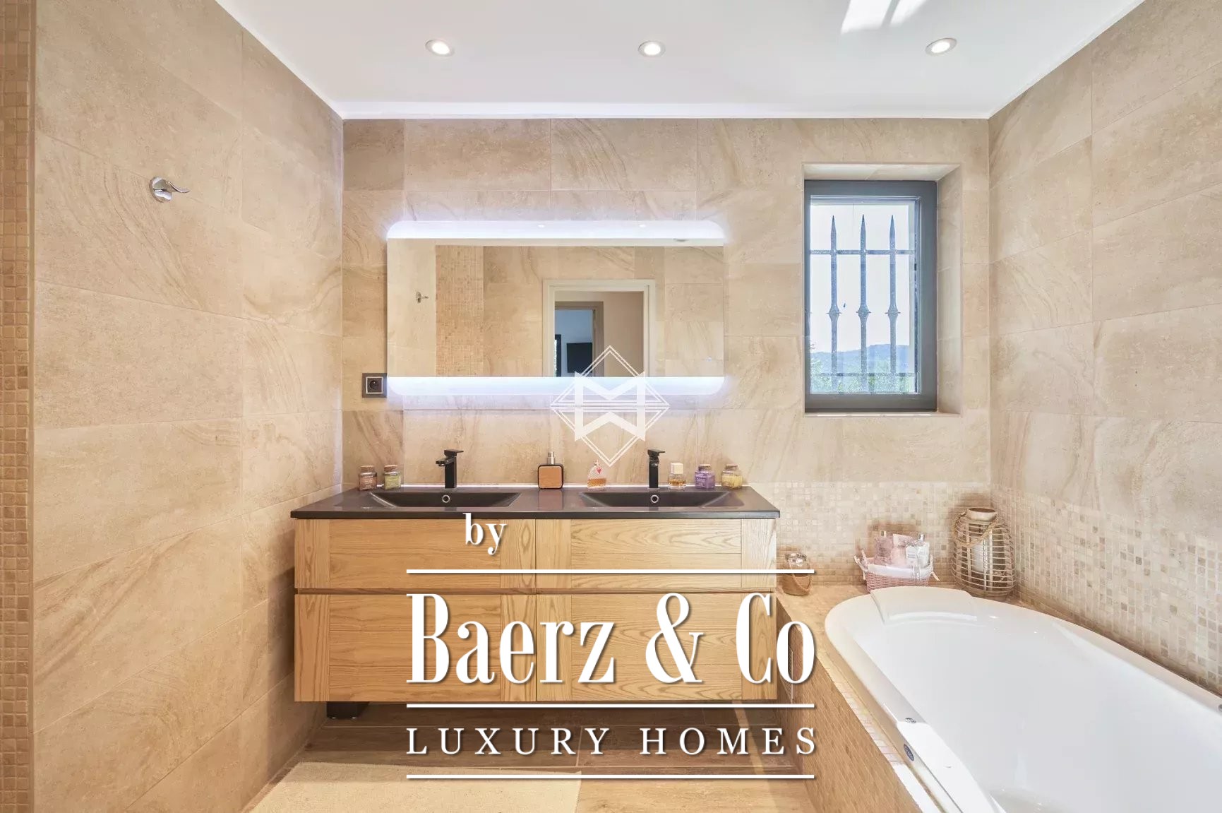 Five ensuite bedrooms assure privacy, including a notably generous parental suite. The main living, dining, and kitchen area offers a spacious rhythm for gatherings, complemented by a luminous office. Two contemporary rooftop terraces—one accessed from the suite, the other from the office—feature sun loungers and a jacuzzi, allowing for serene views of the sea and hills.