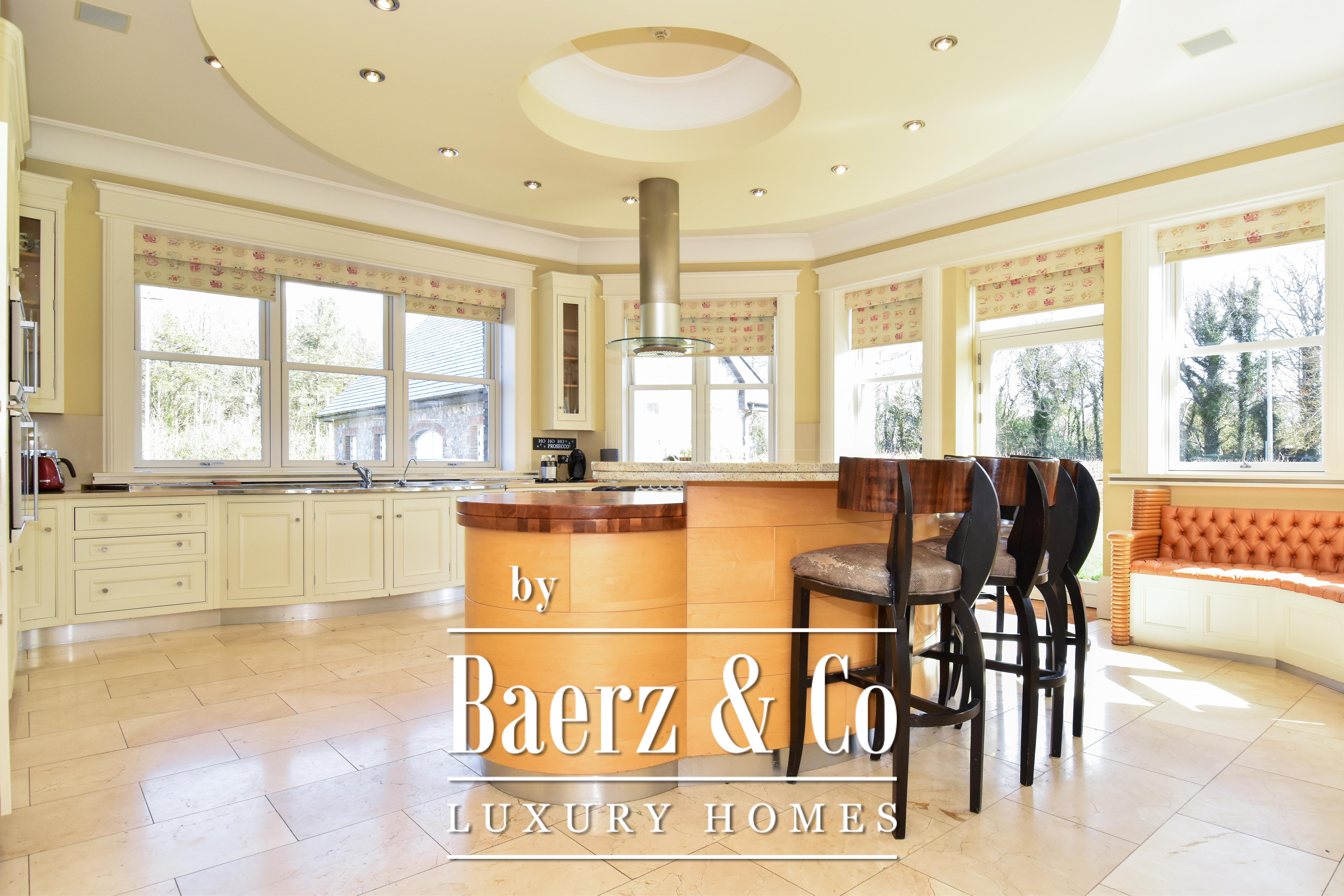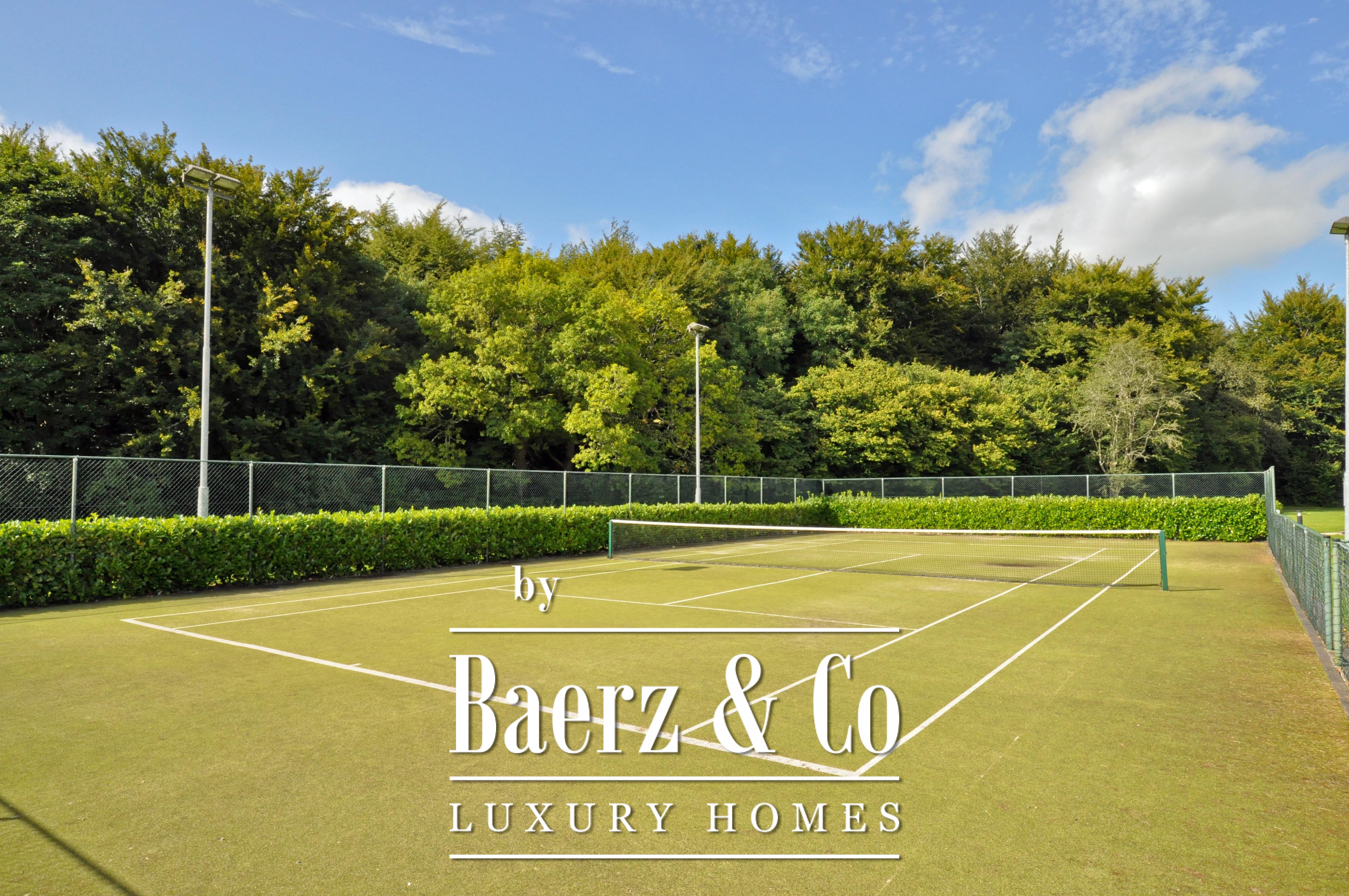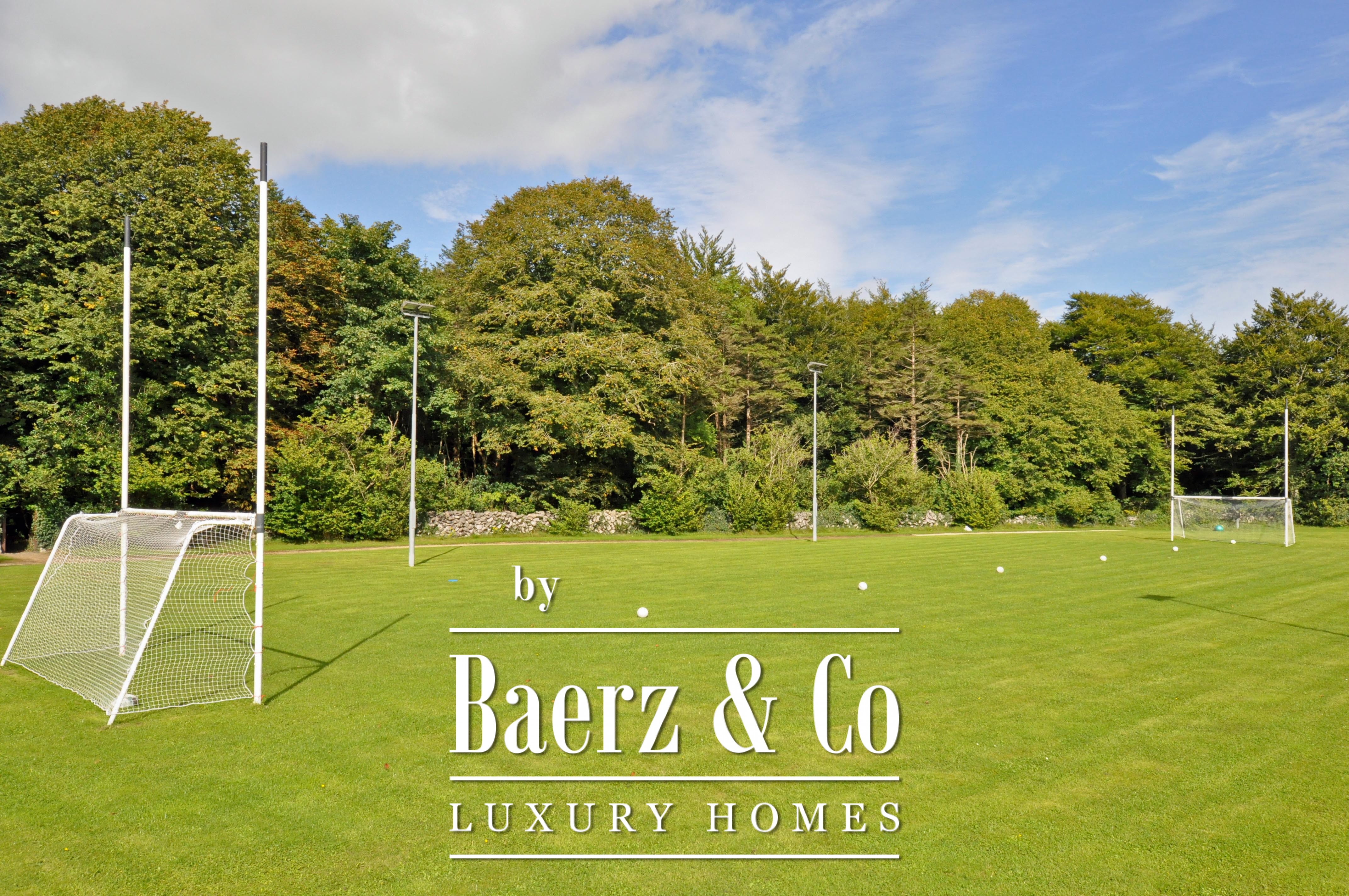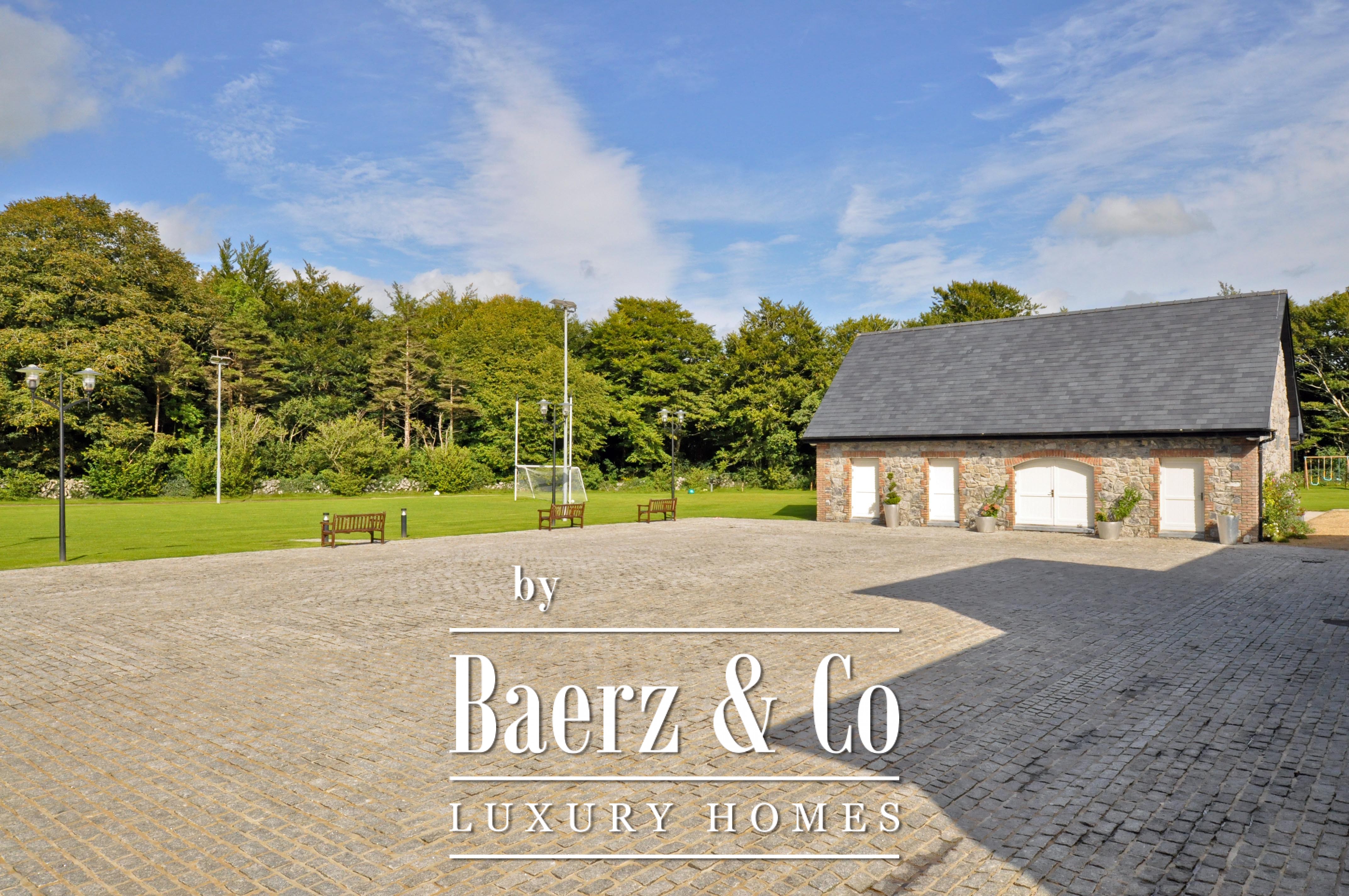 Light, proportion and craft echo throughout, from ornate coving to quality tiling, doors and flooring. Spaces for leisure, such as a games room, gym, pool room and billiards room, allow options regardless of season. Outdoors, amenities include a hot tub with television, floodlit tennis court, quarter-size football pitch, four stables, post and rail paddocks, and a 4 km garden trail, with a cobblestone yard for ample parking.