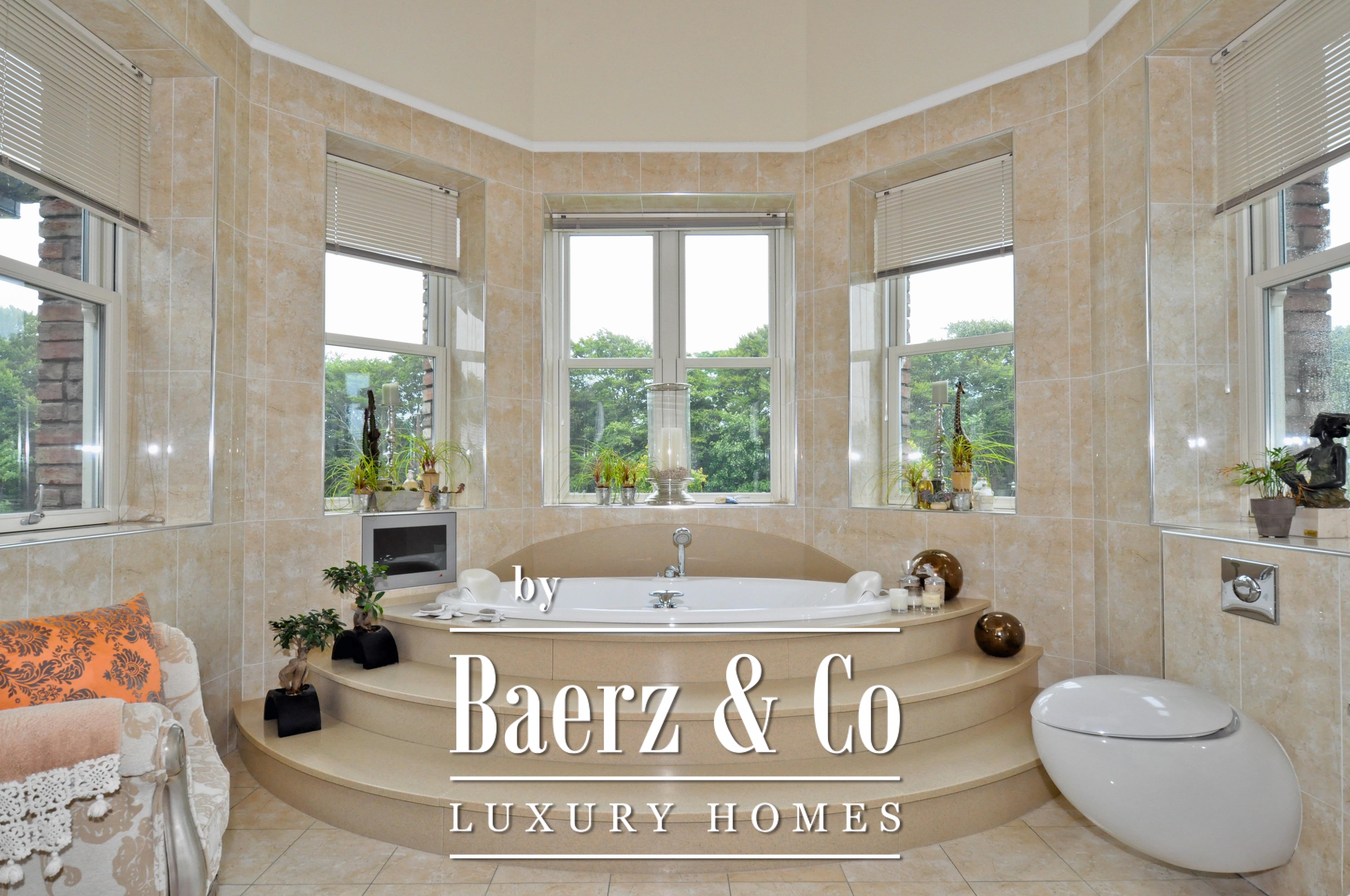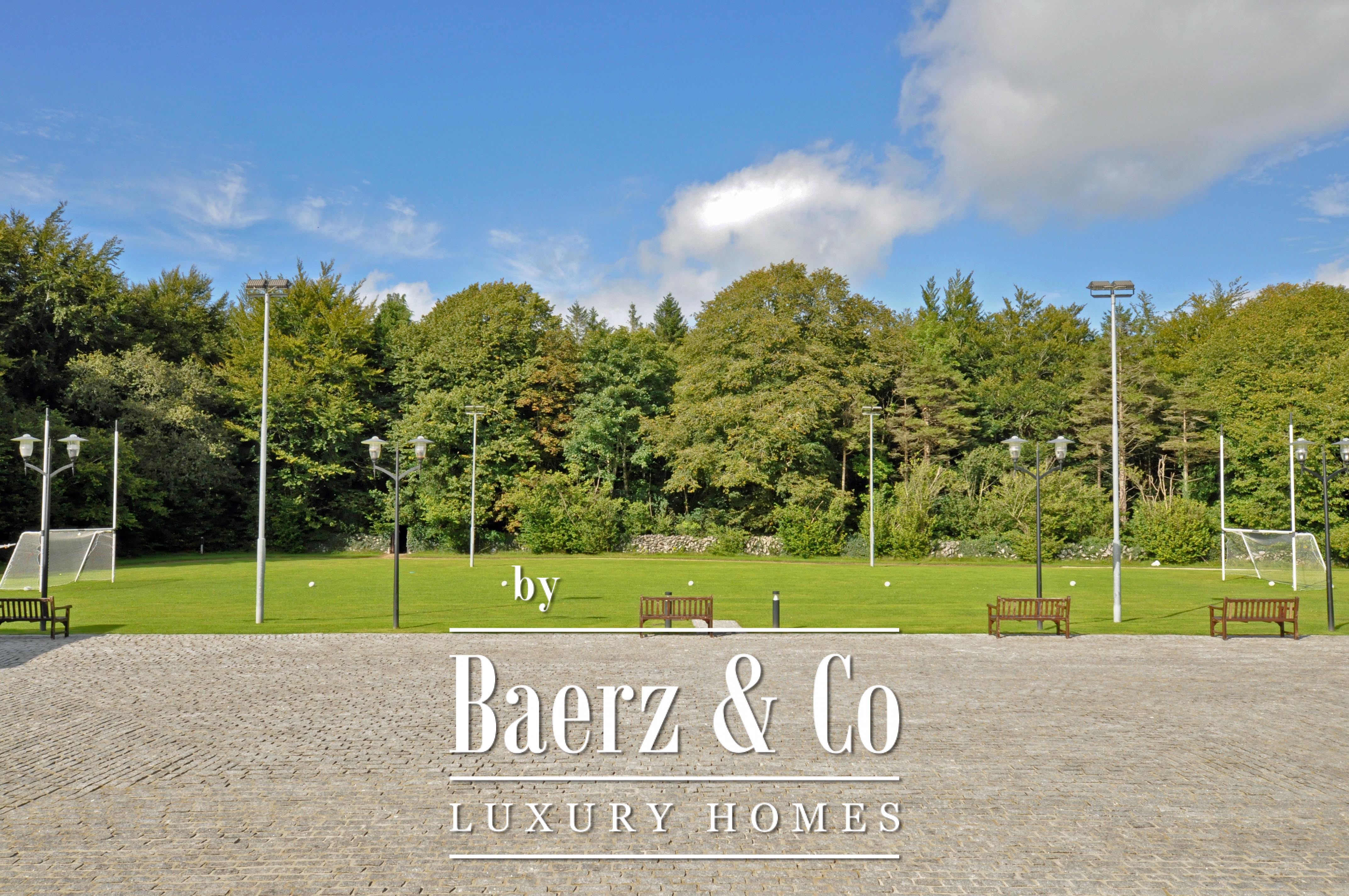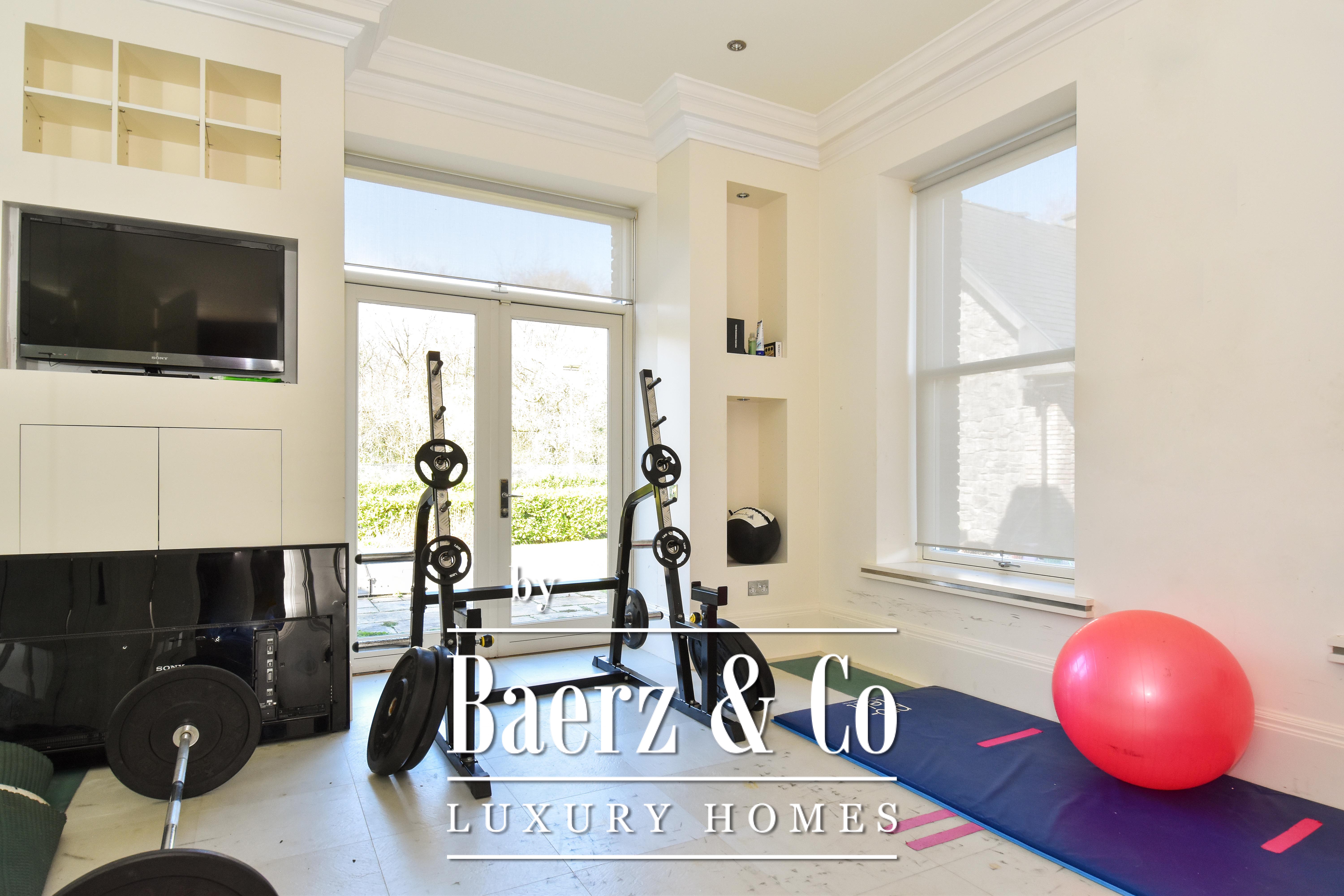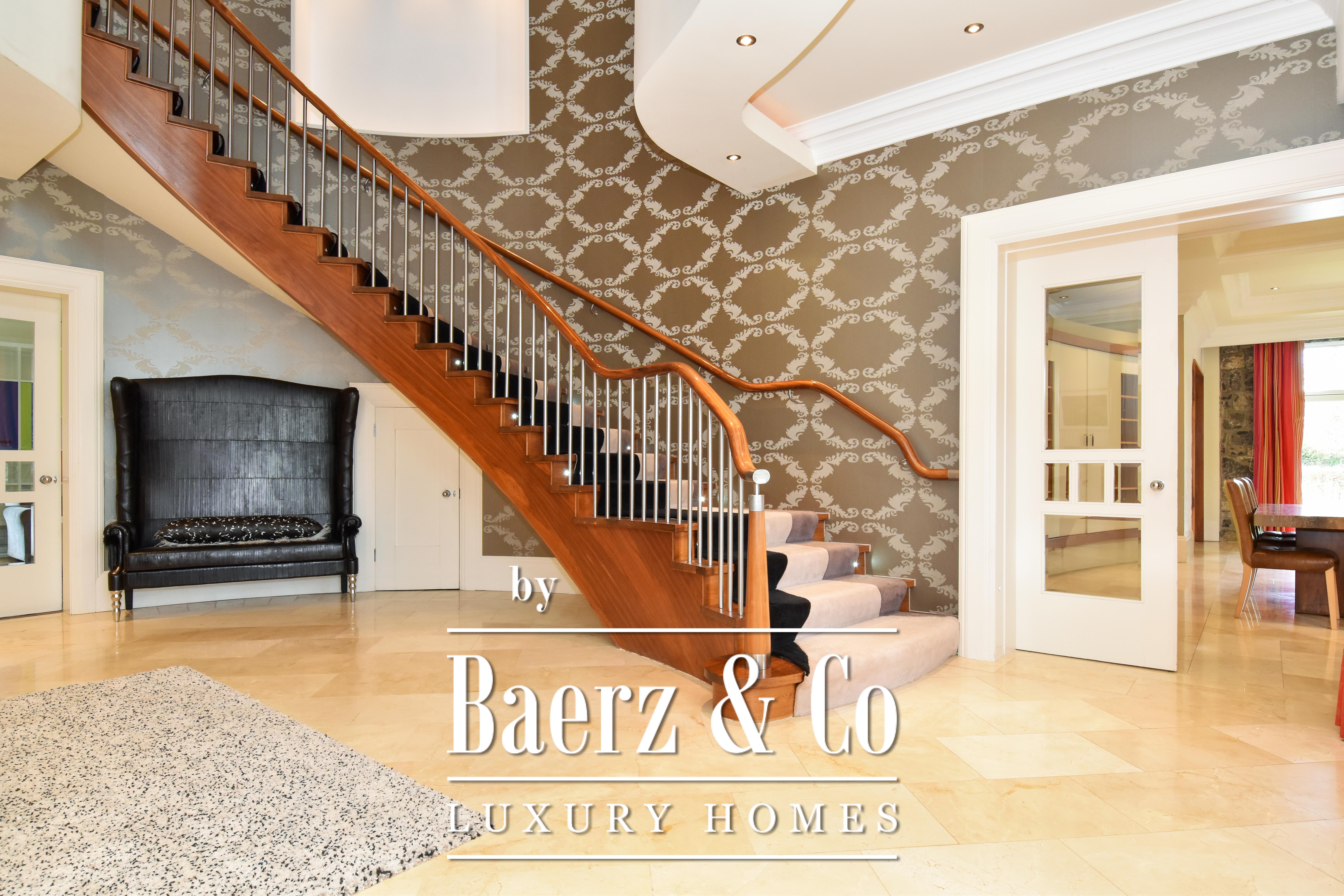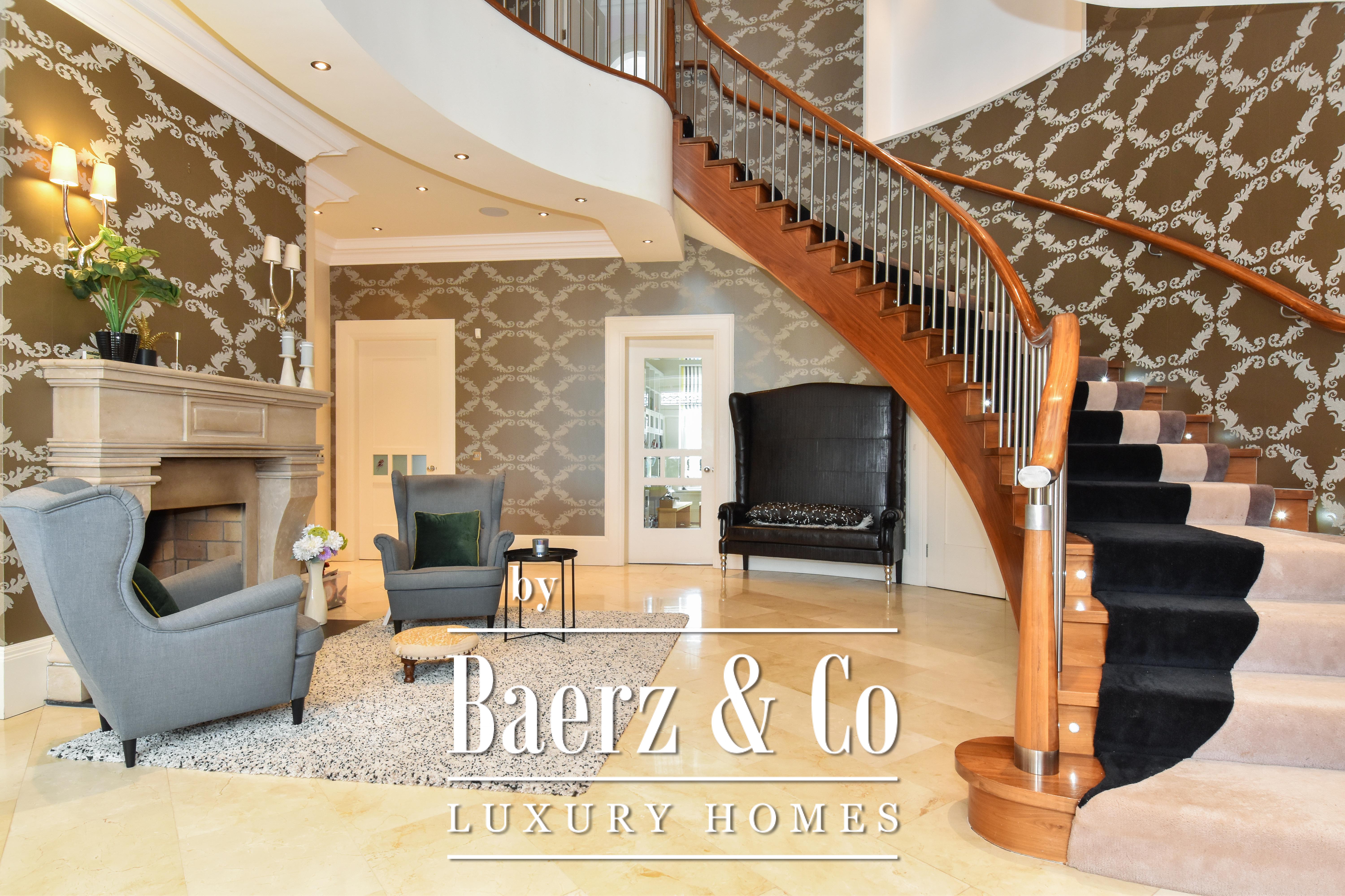 Light, proportion and craft echo throughout, from ornate coving to quality tiling, doors and flooring. Spaces for leisure, such as a games room, gym, pool room and billiards room, allow options regardless of season. Outdoors, amenities include a hot tub with television, floodlit tennis court, quarter-size football pitch, four stables, post and rail paddocks, and a 4 km garden trail, with a cobblestone yard for ample parking.