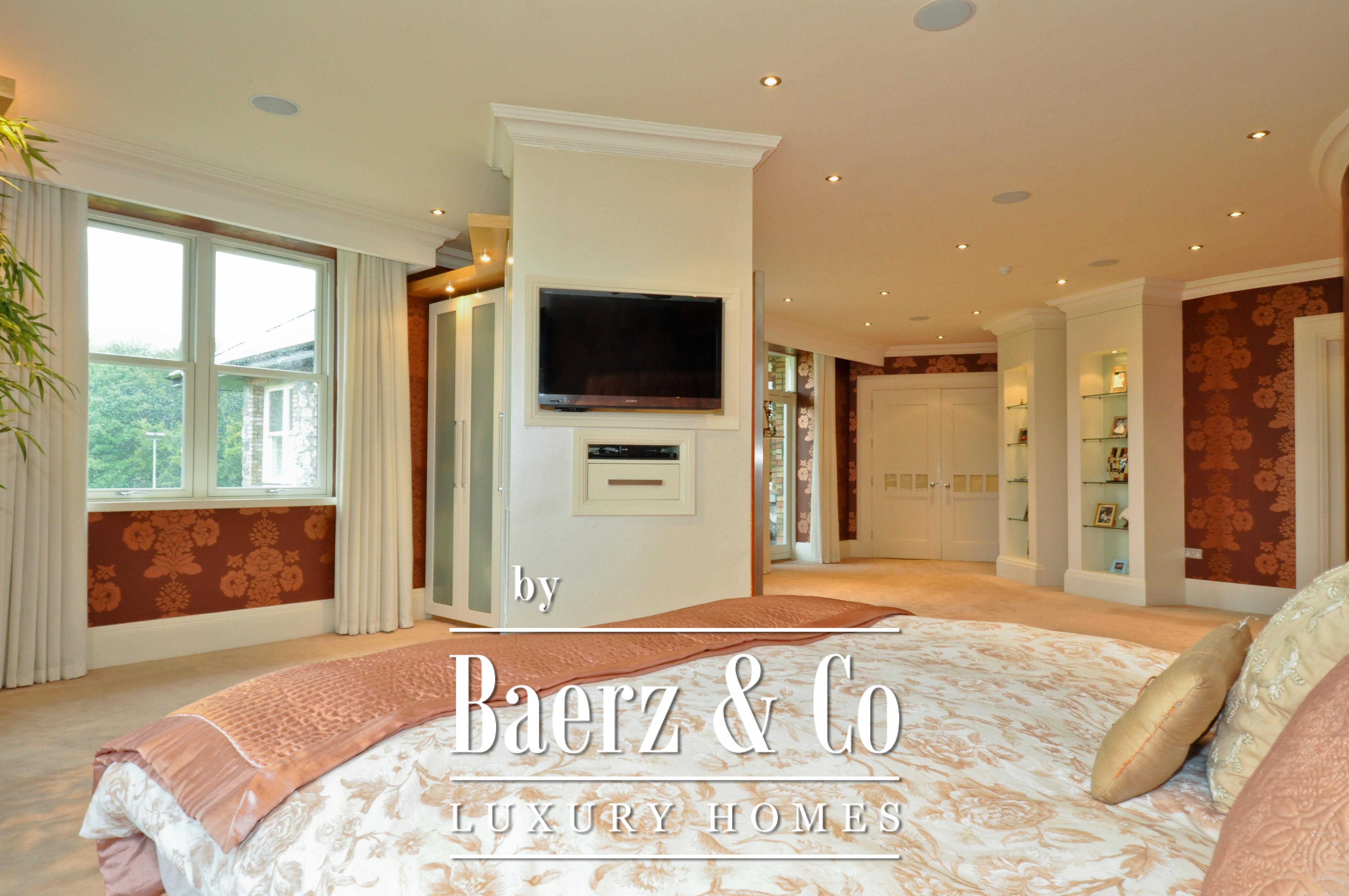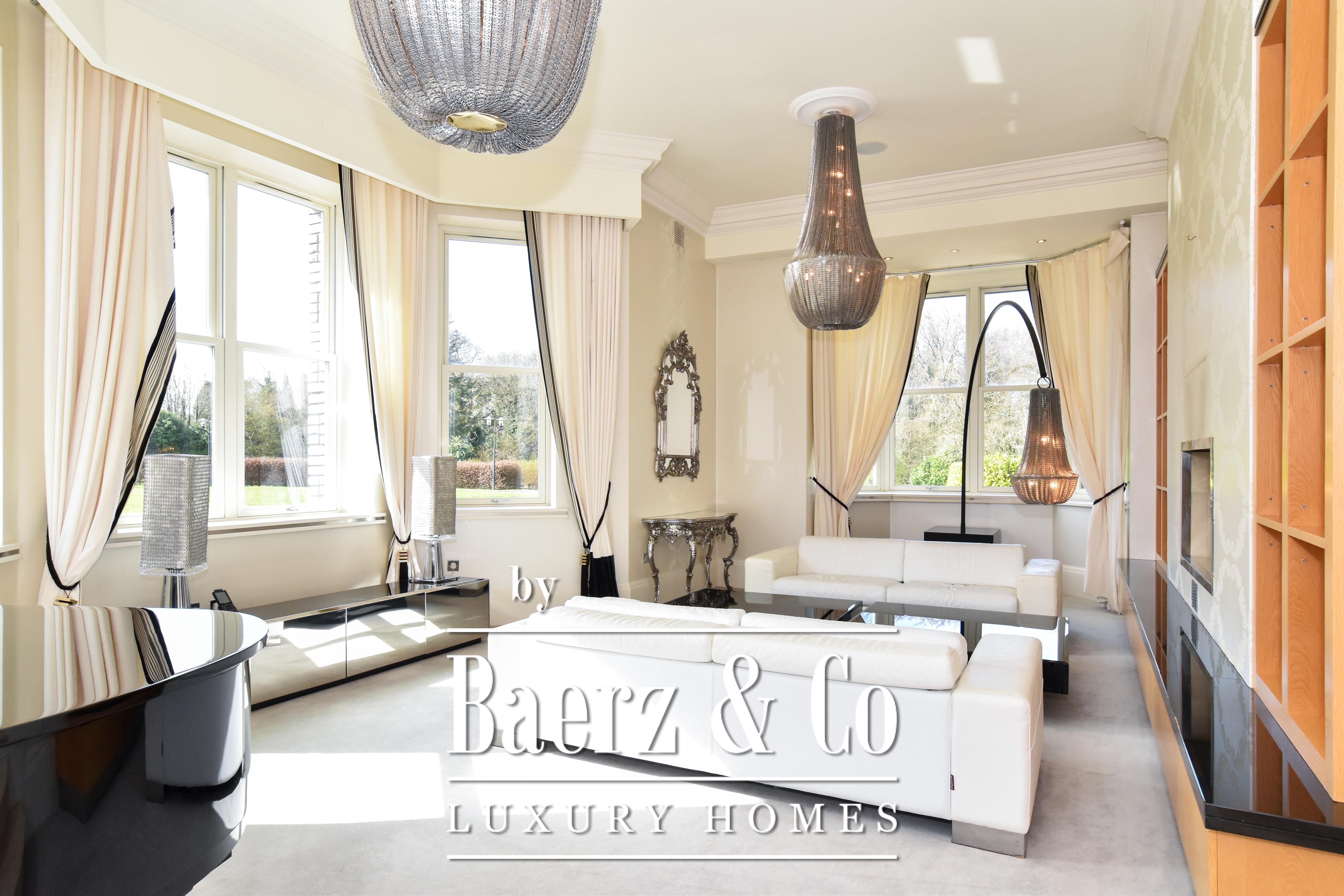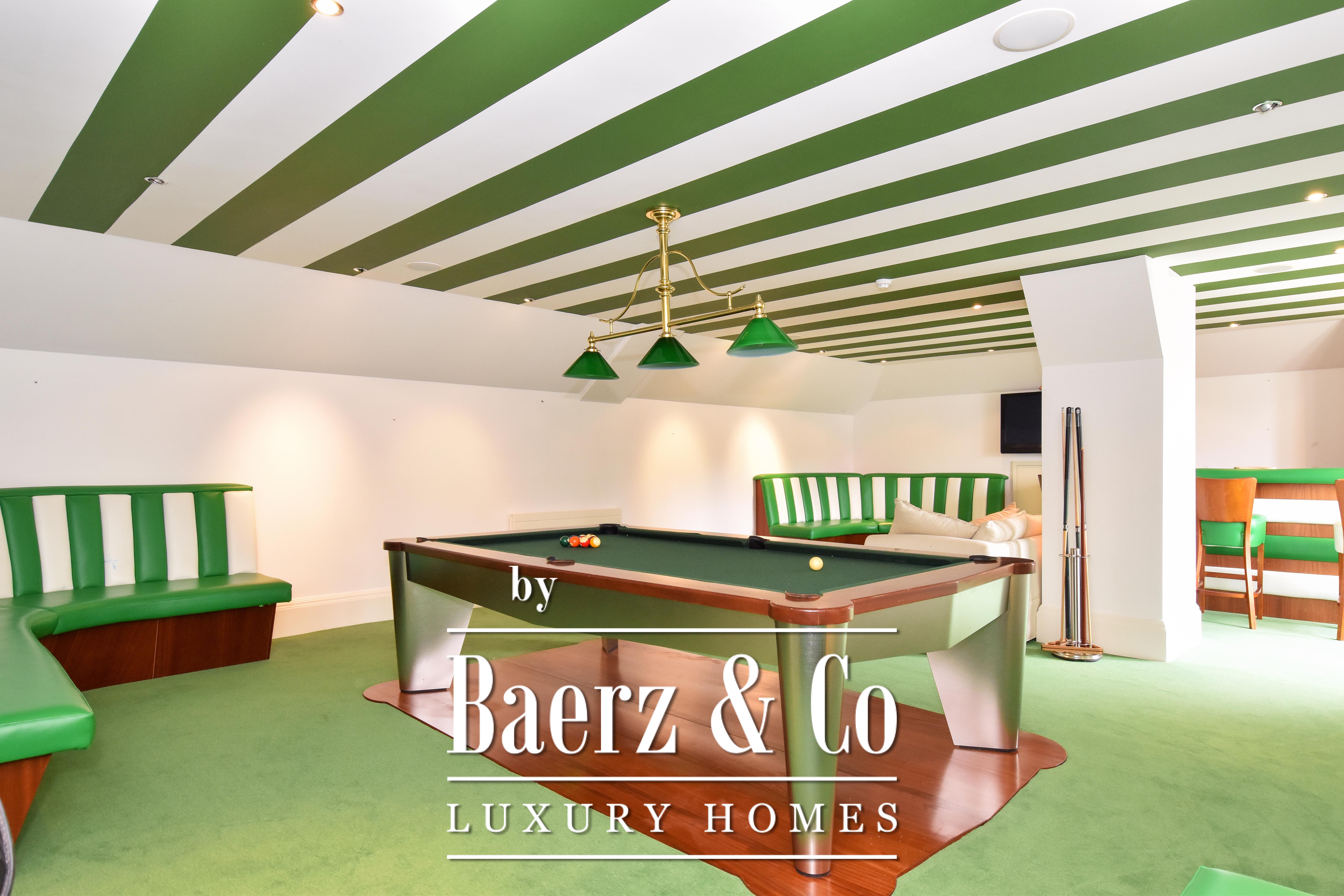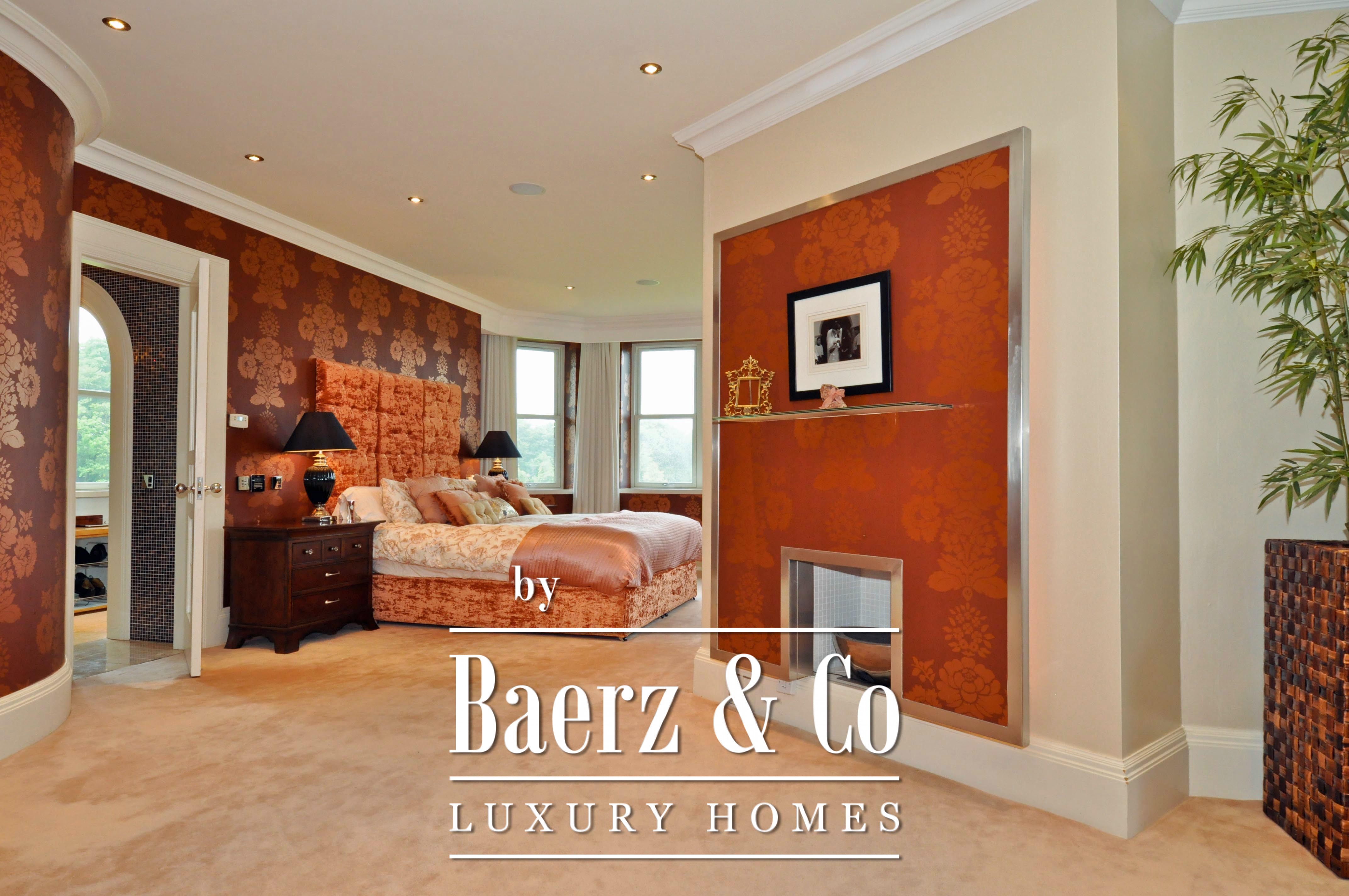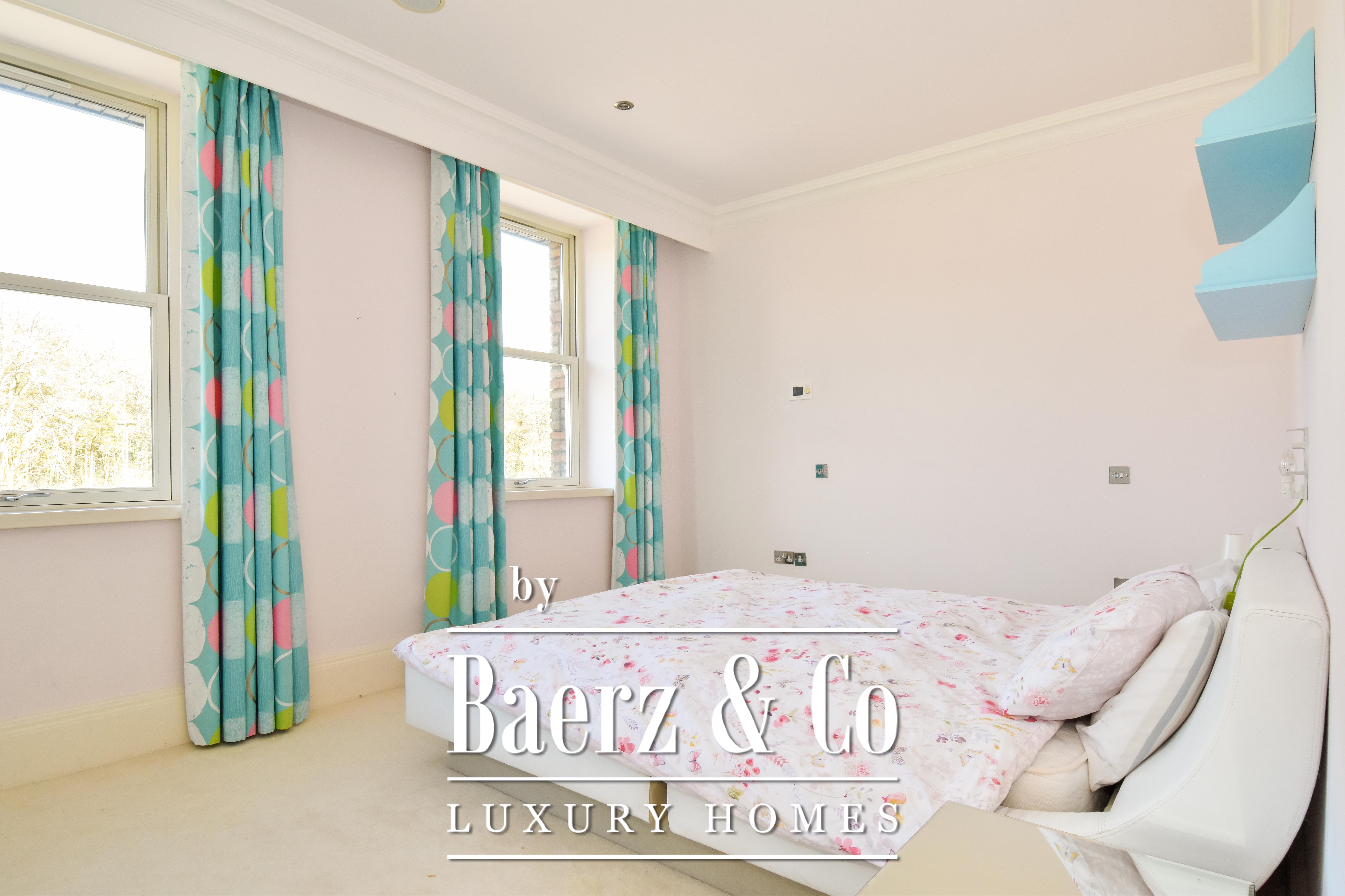 Inside, the sequence of reception rooms, including three living areas, a generous kitchen fitted with Gaggenau appliances and an Aga, and a dedicated lounge with bar, facilitates large family gatherings or private entertaining. Four bedrooms in the main house have ensuite shower rooms; the principal suite adds two walk-in wardrobes, a master bathroom with Jacuzzi bath, and a private balcony overlooking manicured gardens.