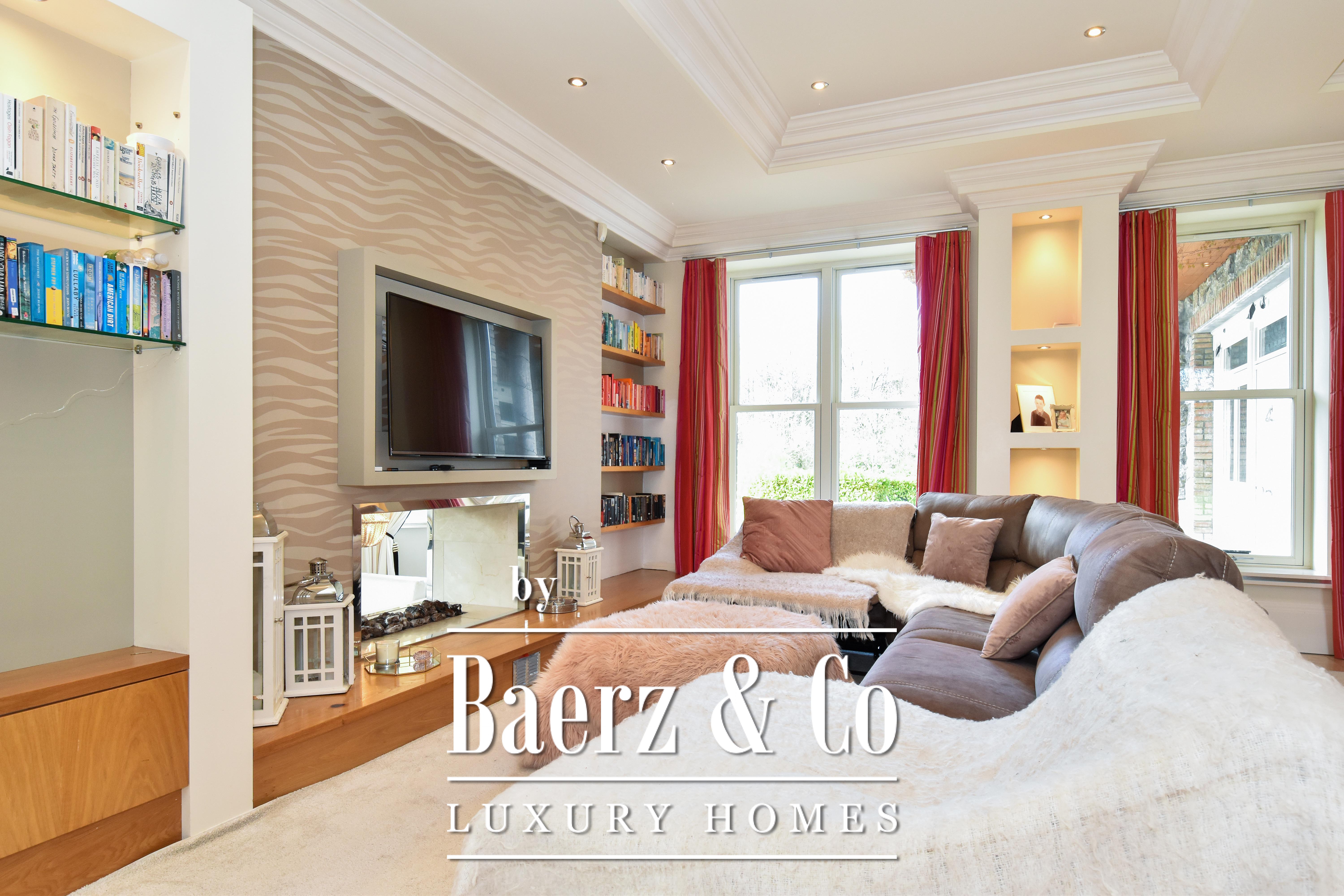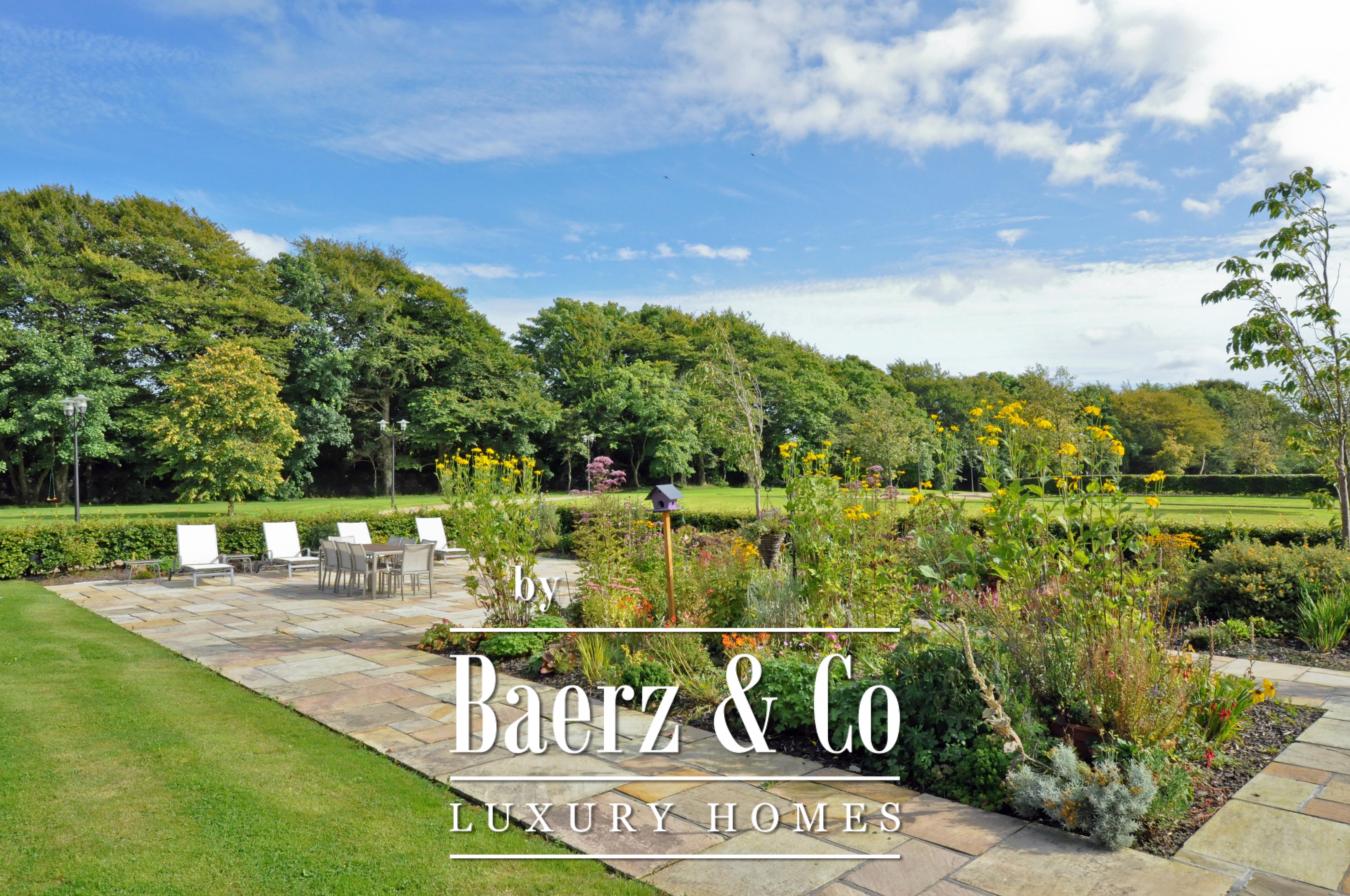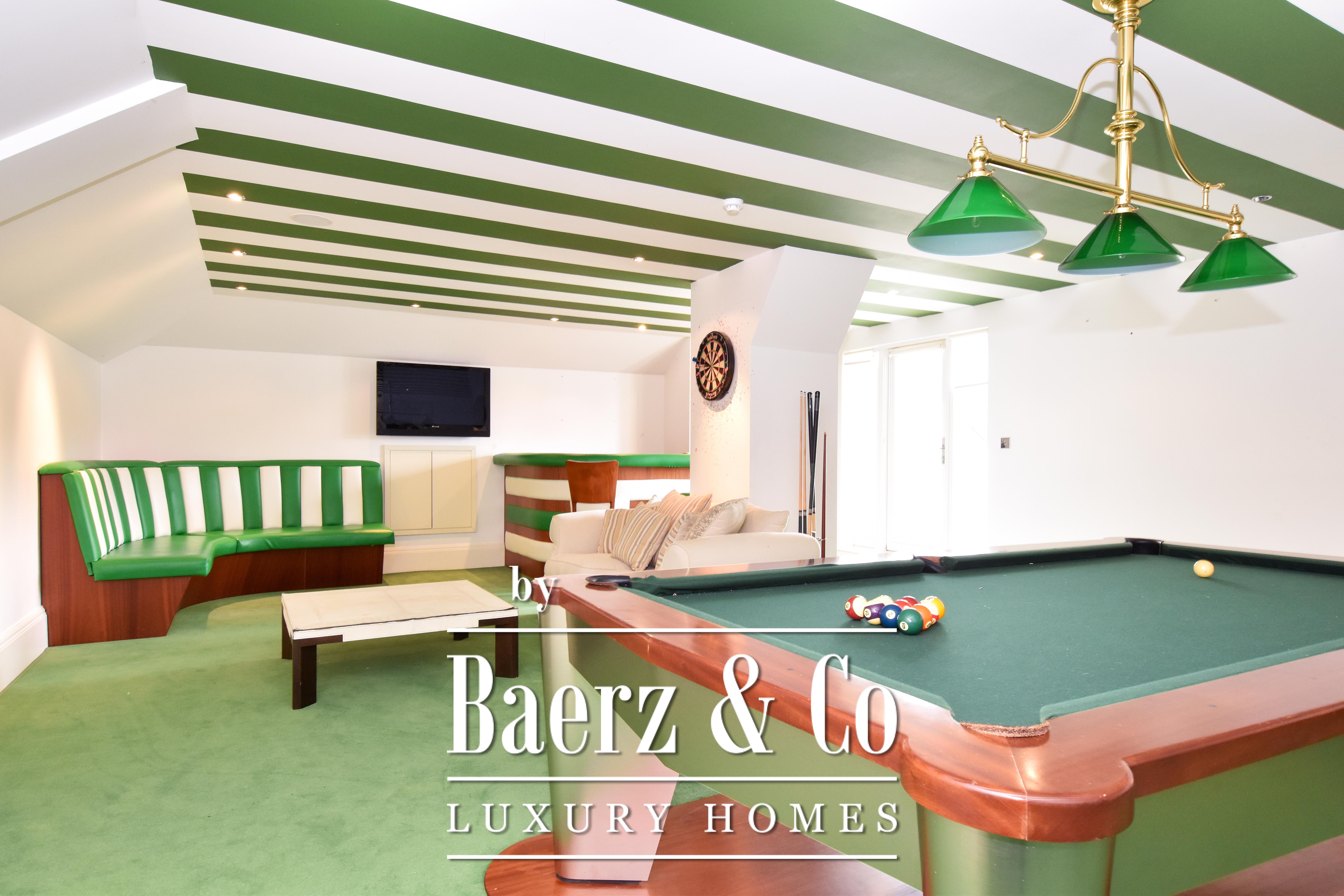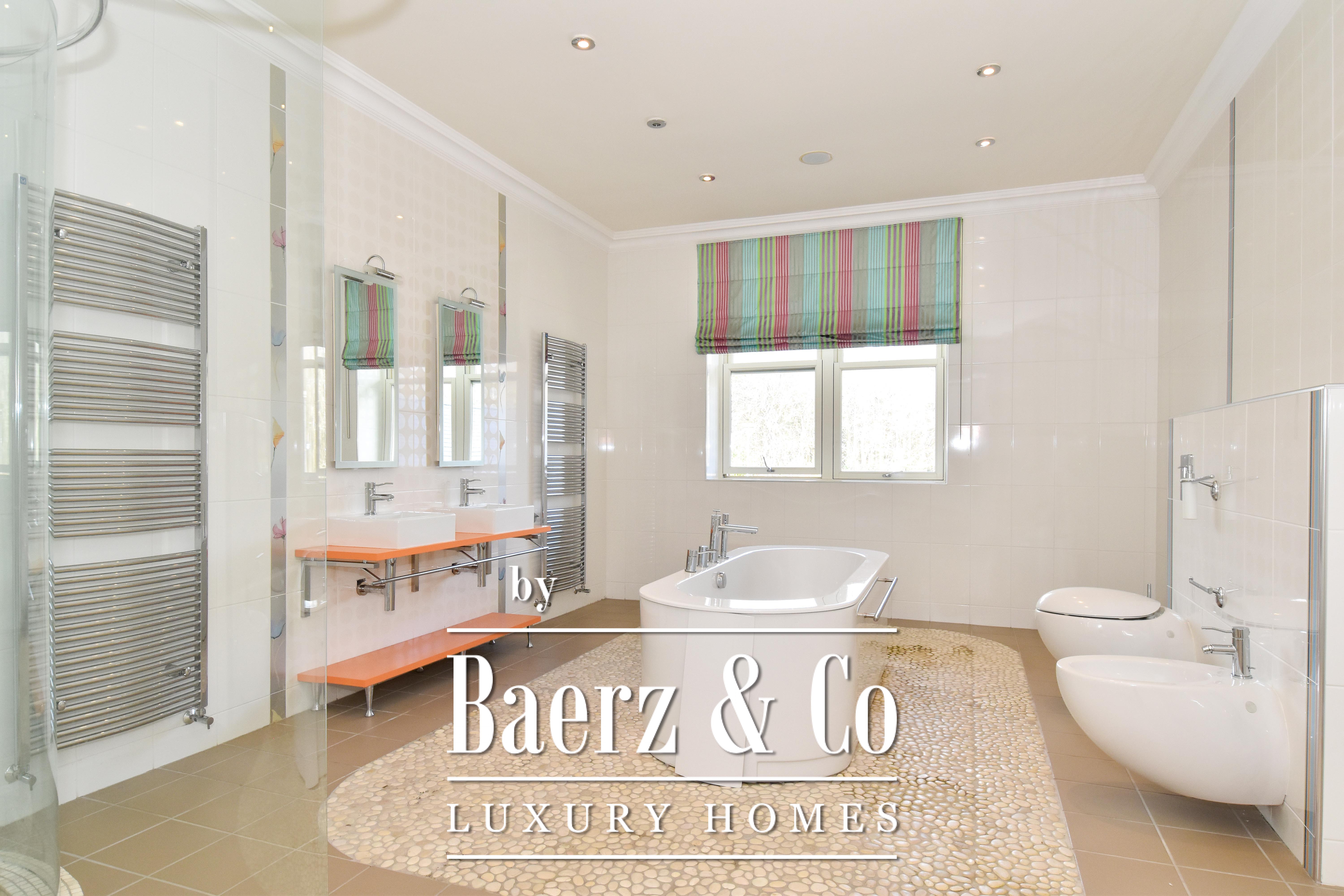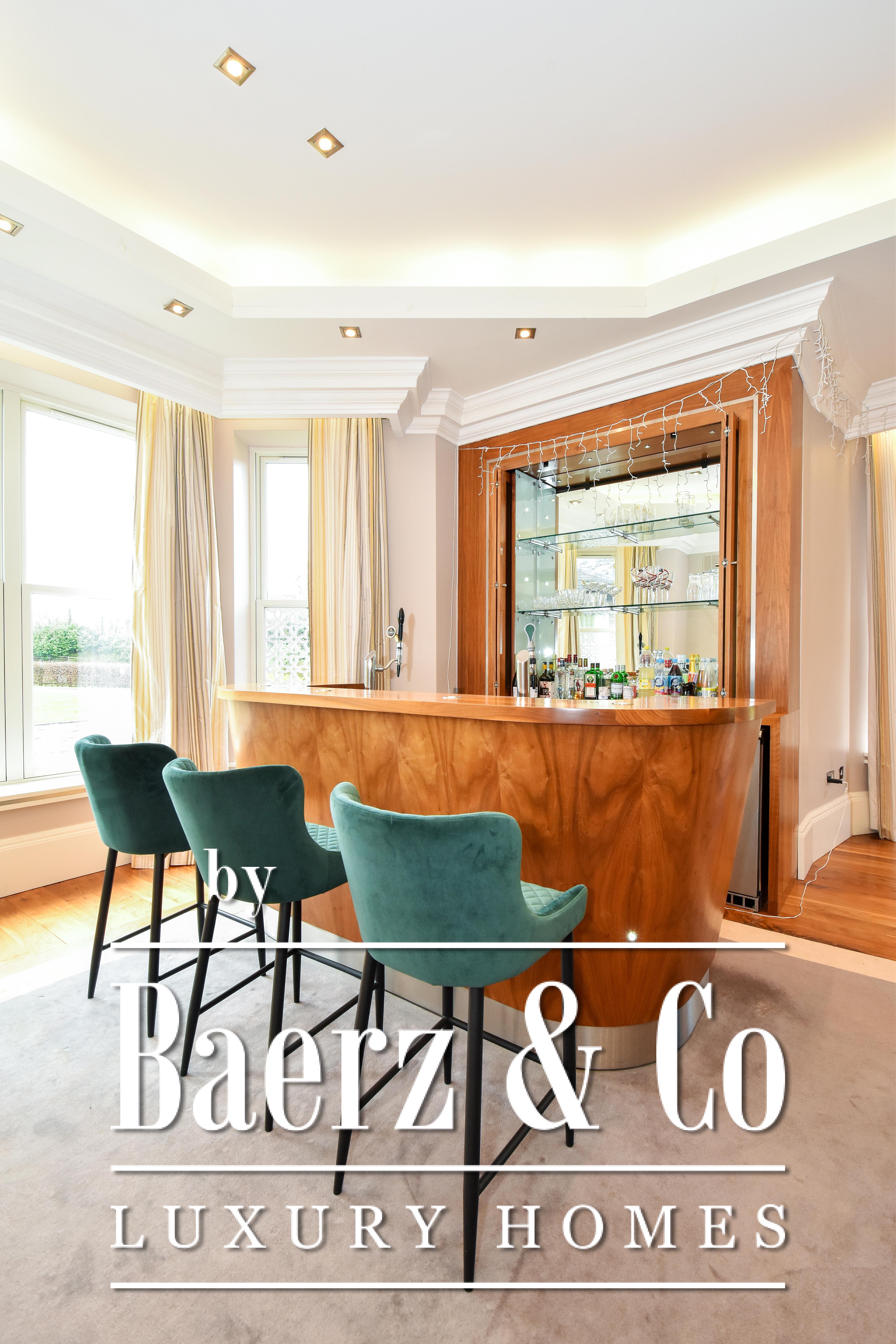 Inside, the sequence of reception rooms, including three living areas, a generous kitchen fitted with Gaggenau appliances and an Aga, and a dedicated lounge with bar, facilitates large family gatherings or private entertaining. Four bedrooms in the main house have ensuite shower rooms; the principal suite adds two walk-in wardrobes, a master bathroom with Jacuzzi bath, and a private balcony overlooking manicured gardens.