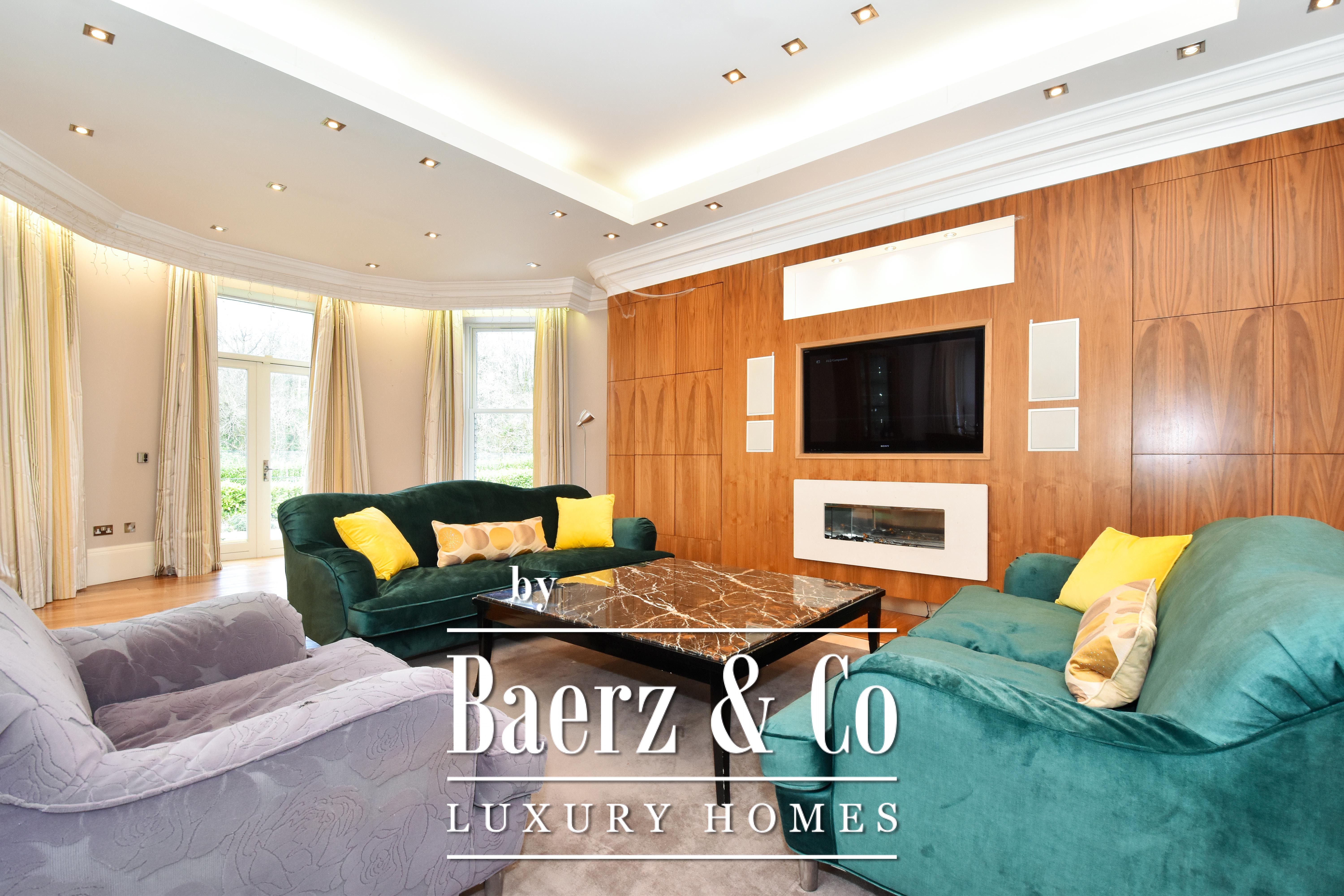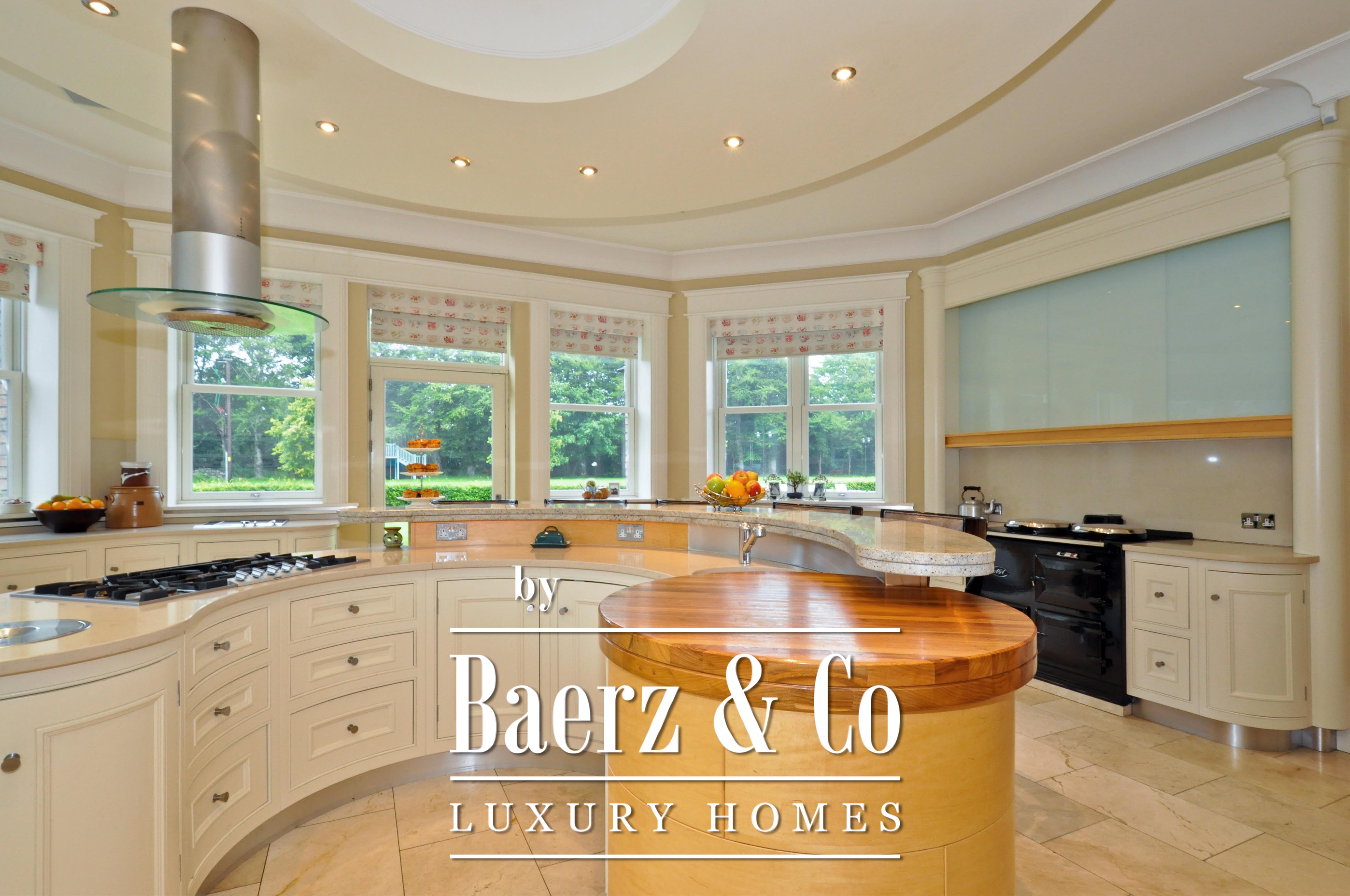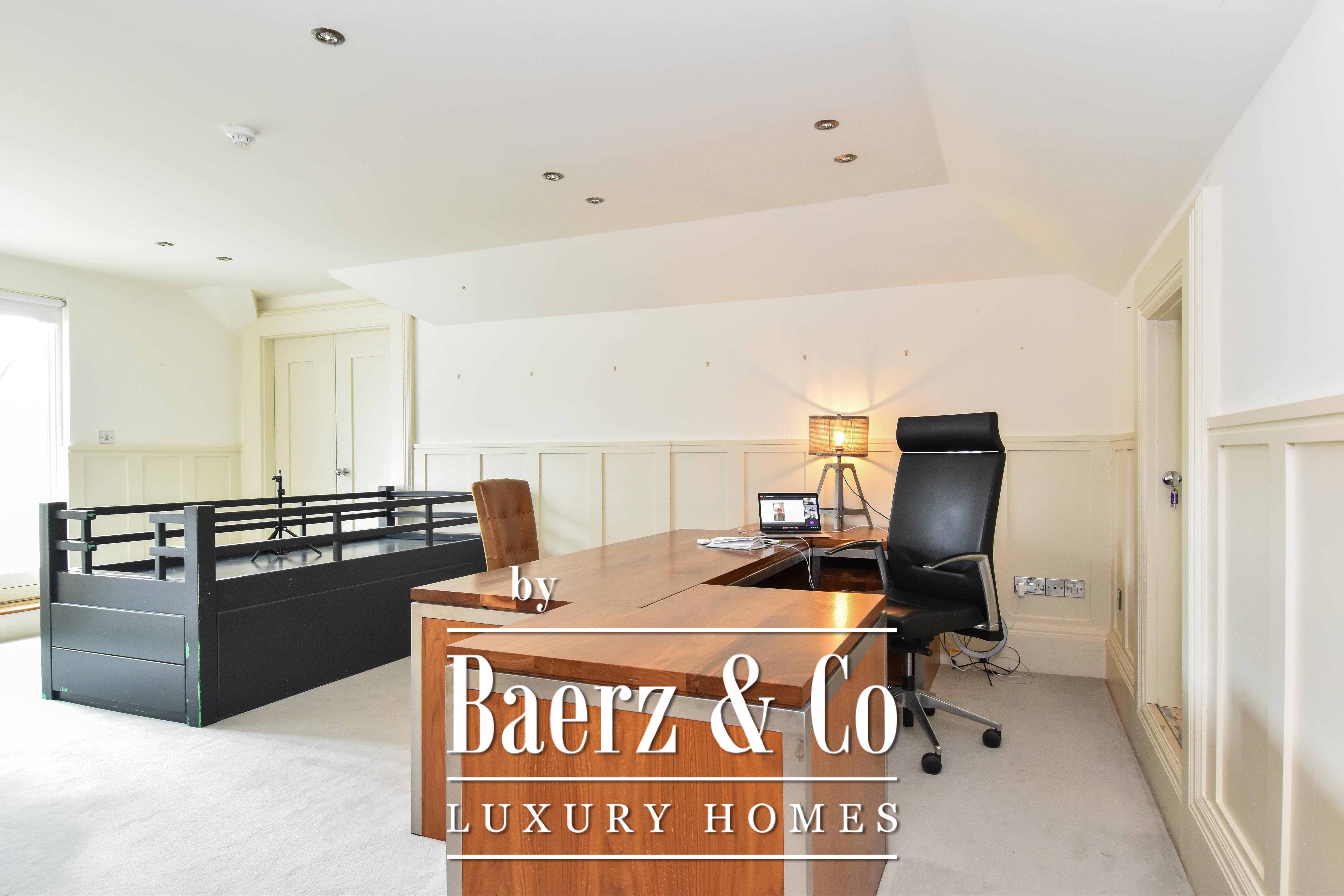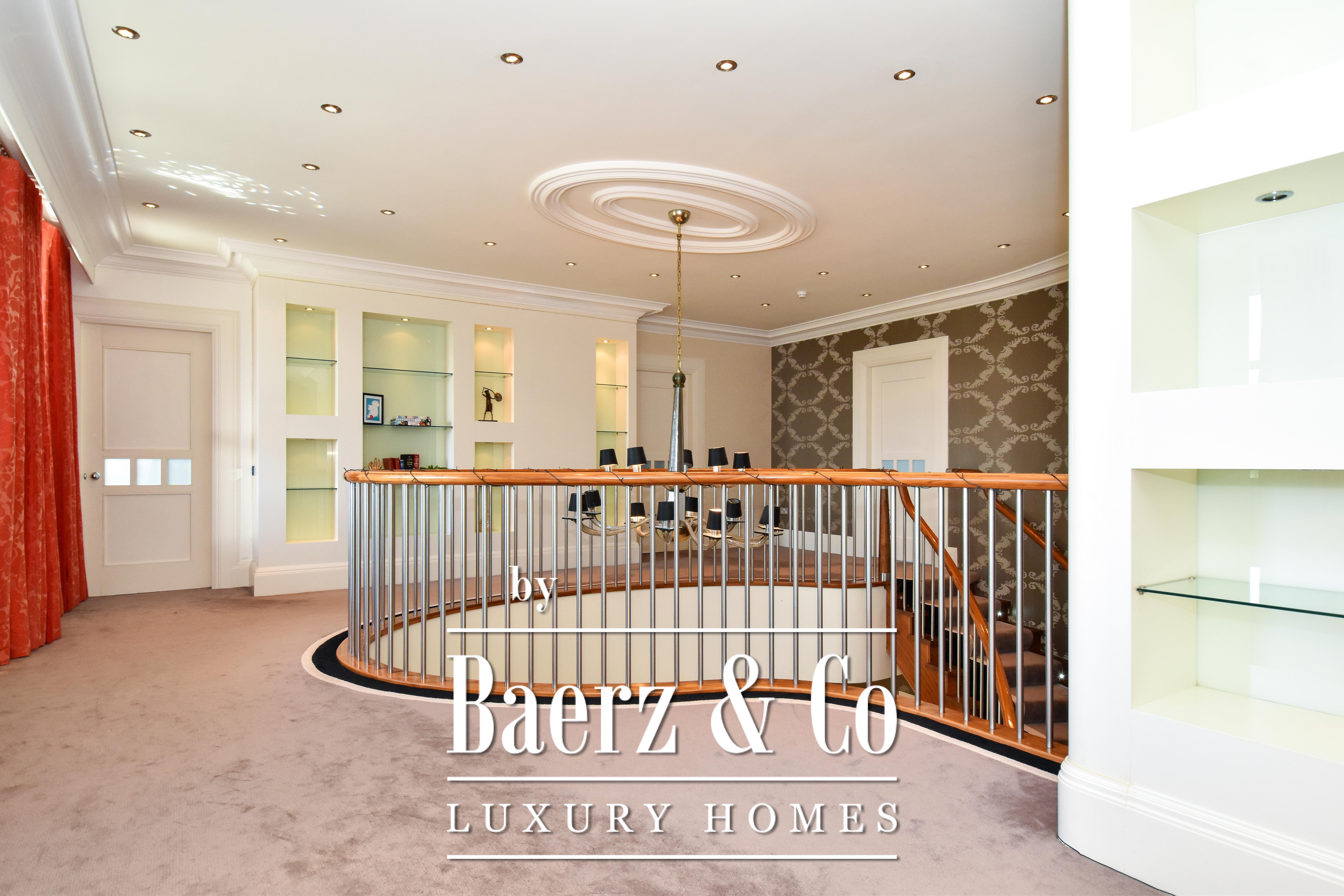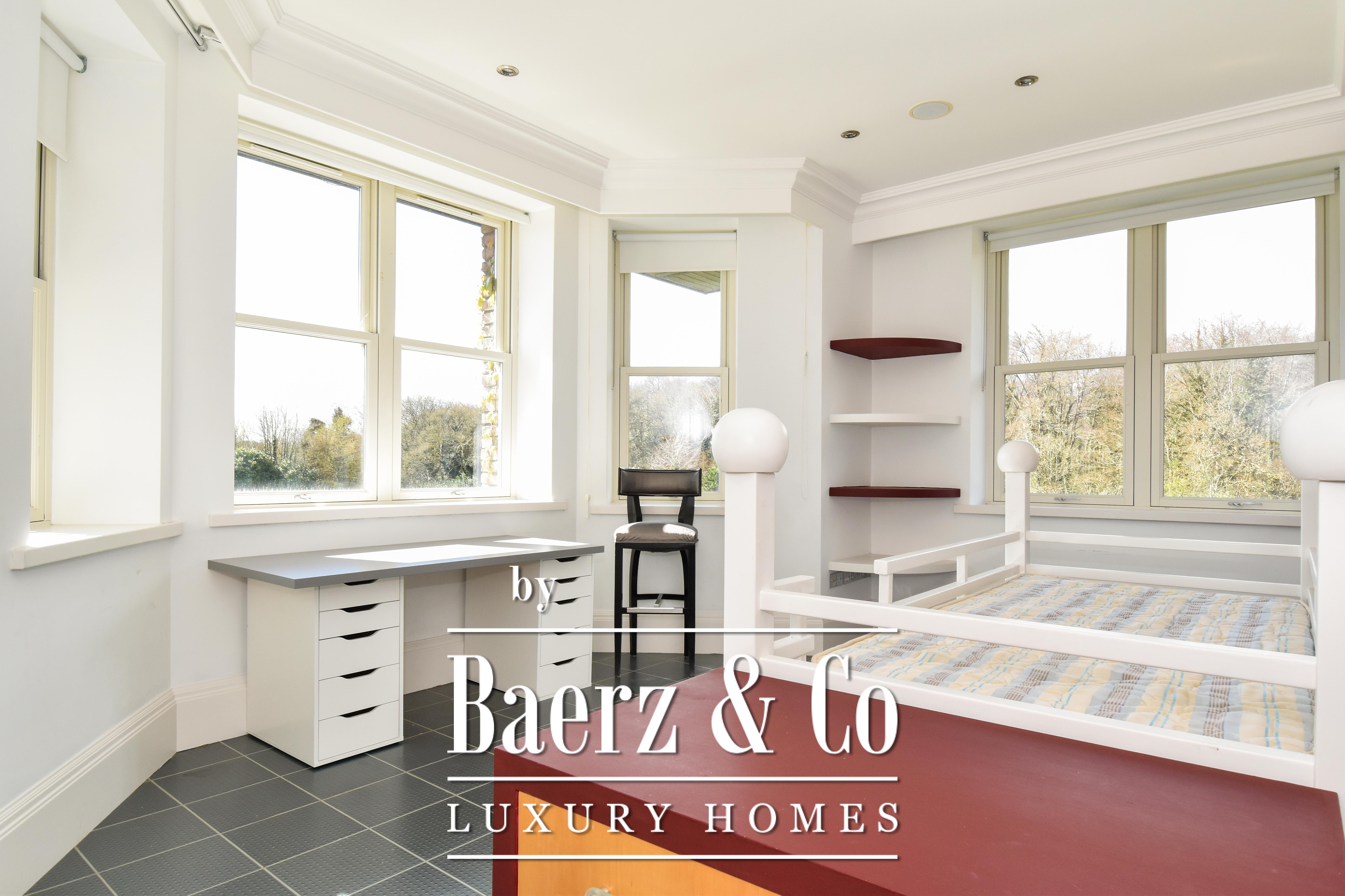 Inside, the sequence of reception rooms, including three living areas, a generous kitchen fitted with Gaggenau appliances and an Aga, and a dedicated lounge with bar, facilitates large family gatherings or private entertaining. Four bedrooms in the main house have ensuite shower rooms; the principal suite adds two walk-in wardrobes, a master bathroom with Jacuzzi bath, and a private balcony overlooking manicured gardens.