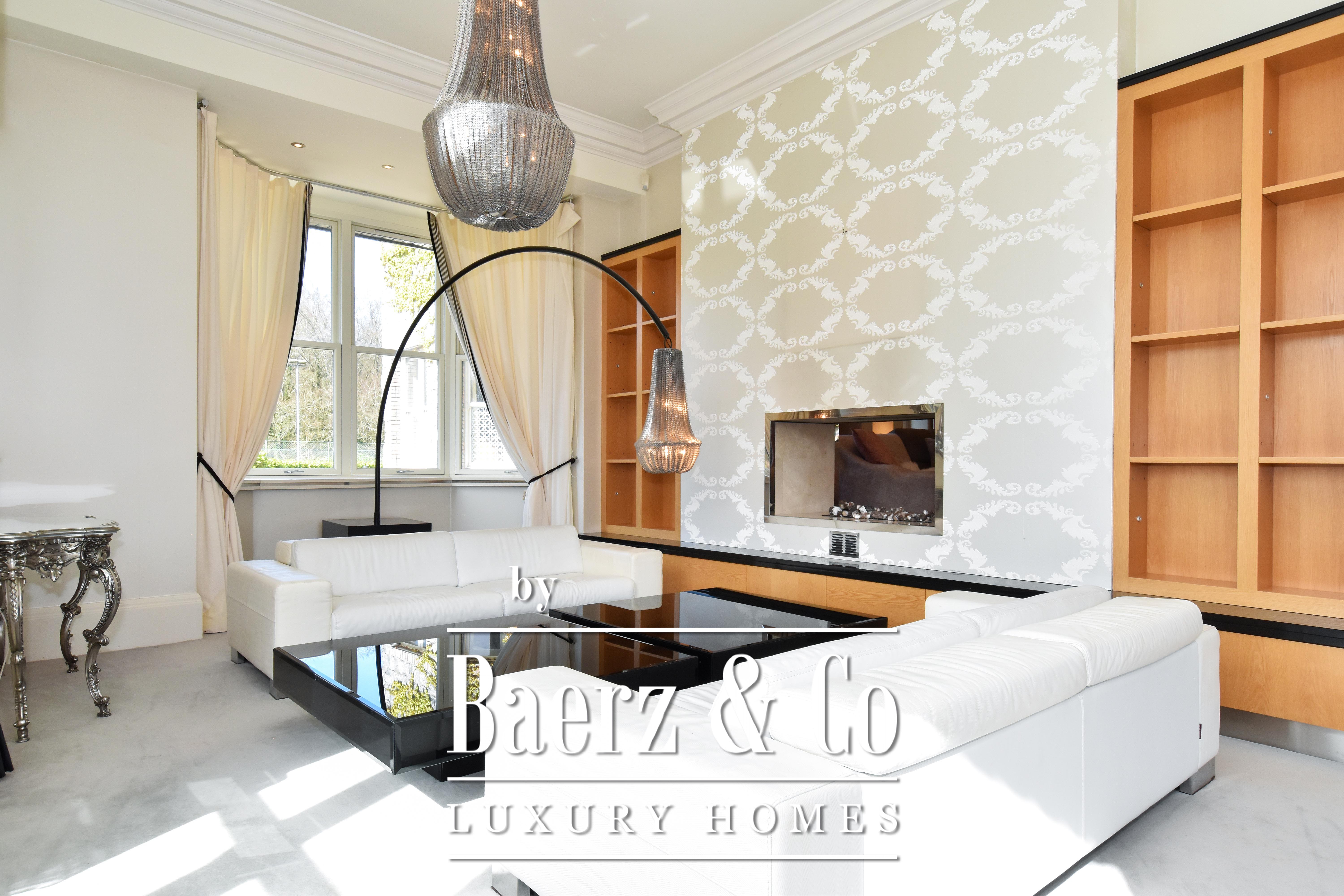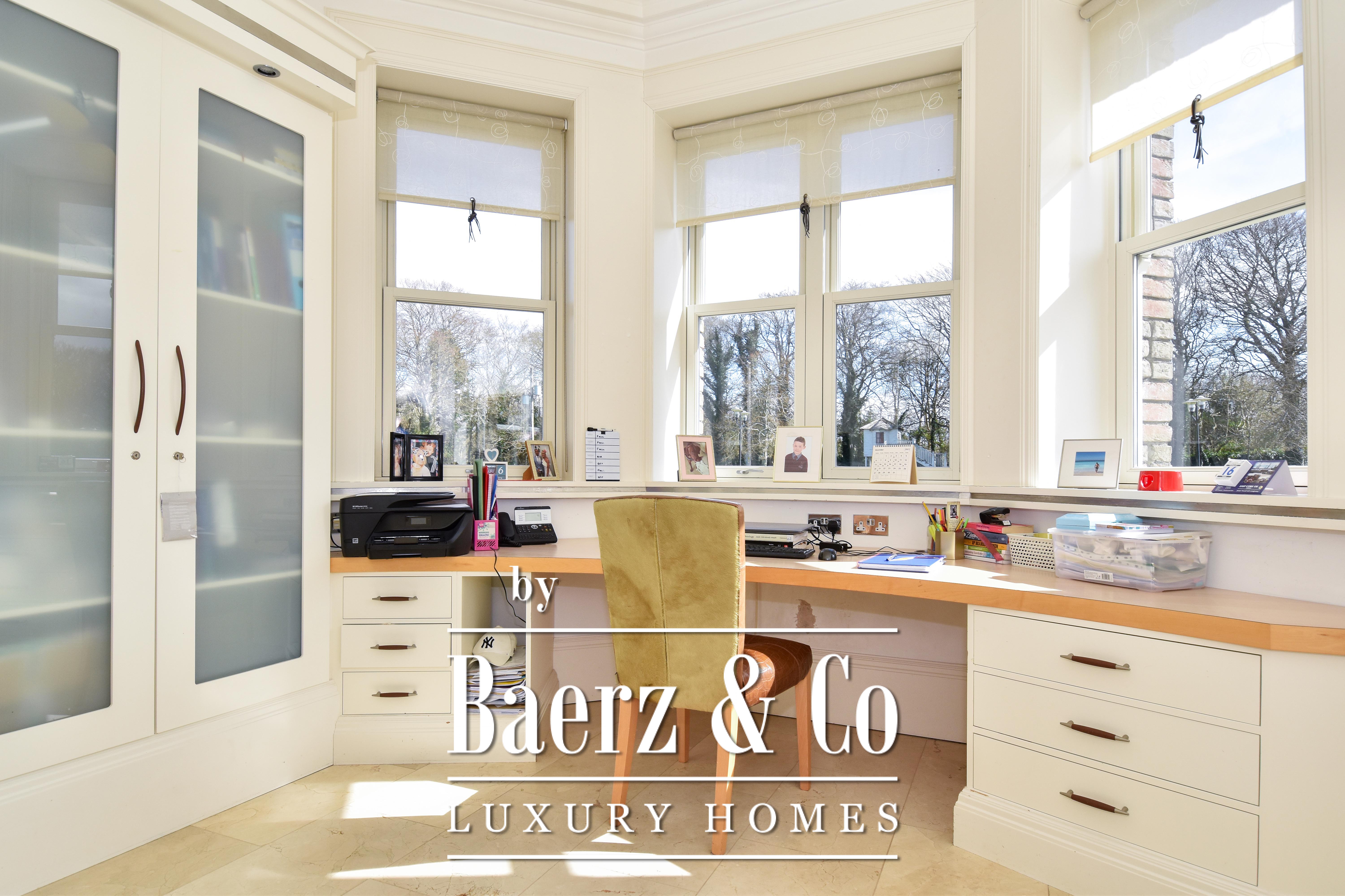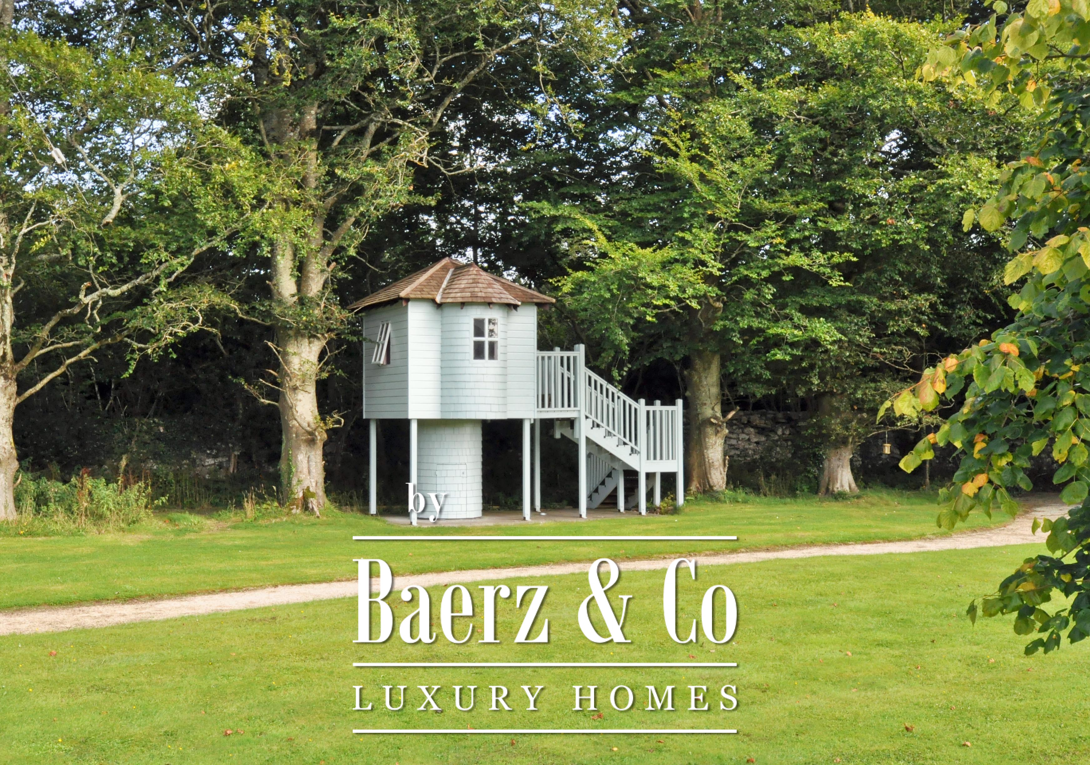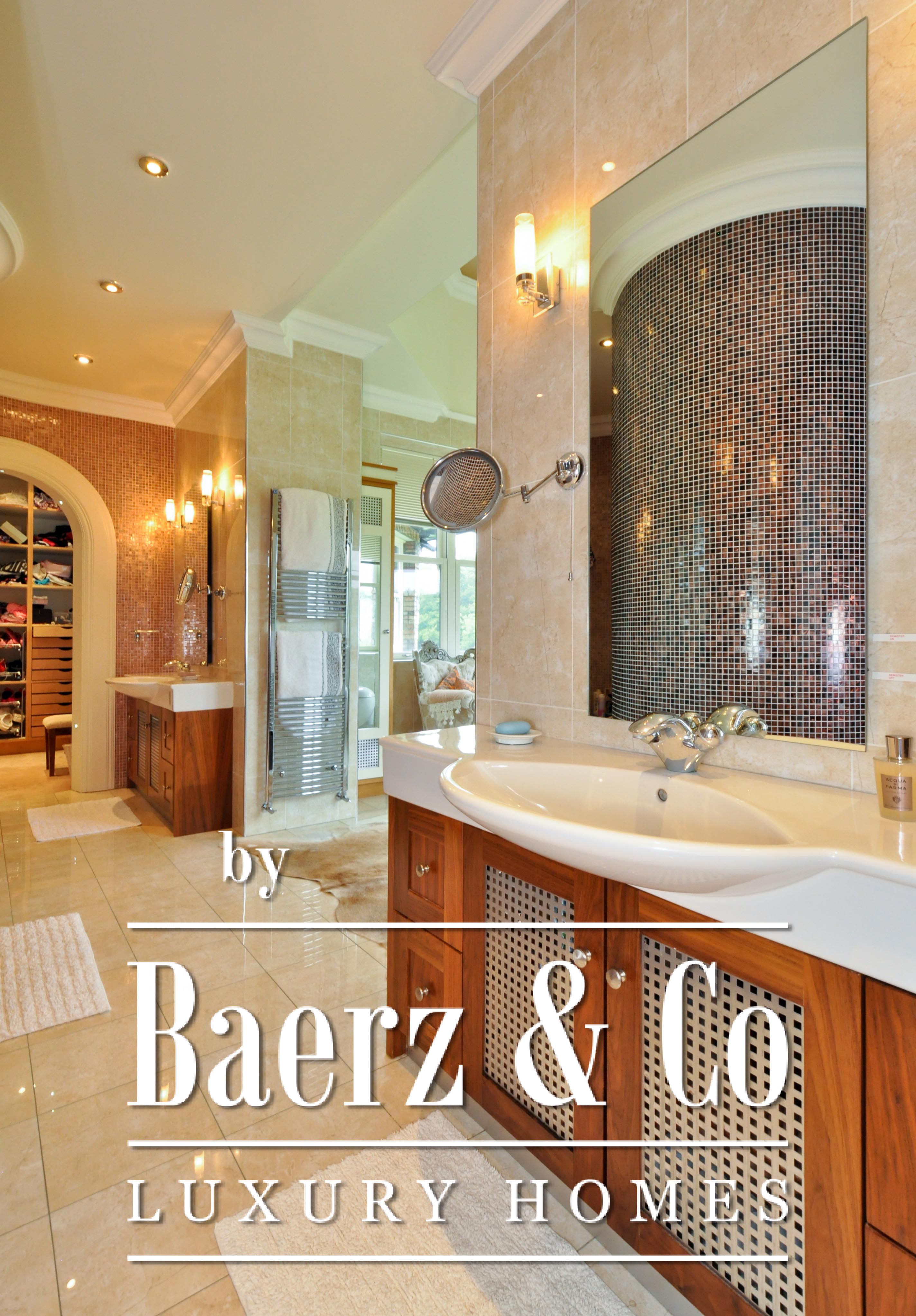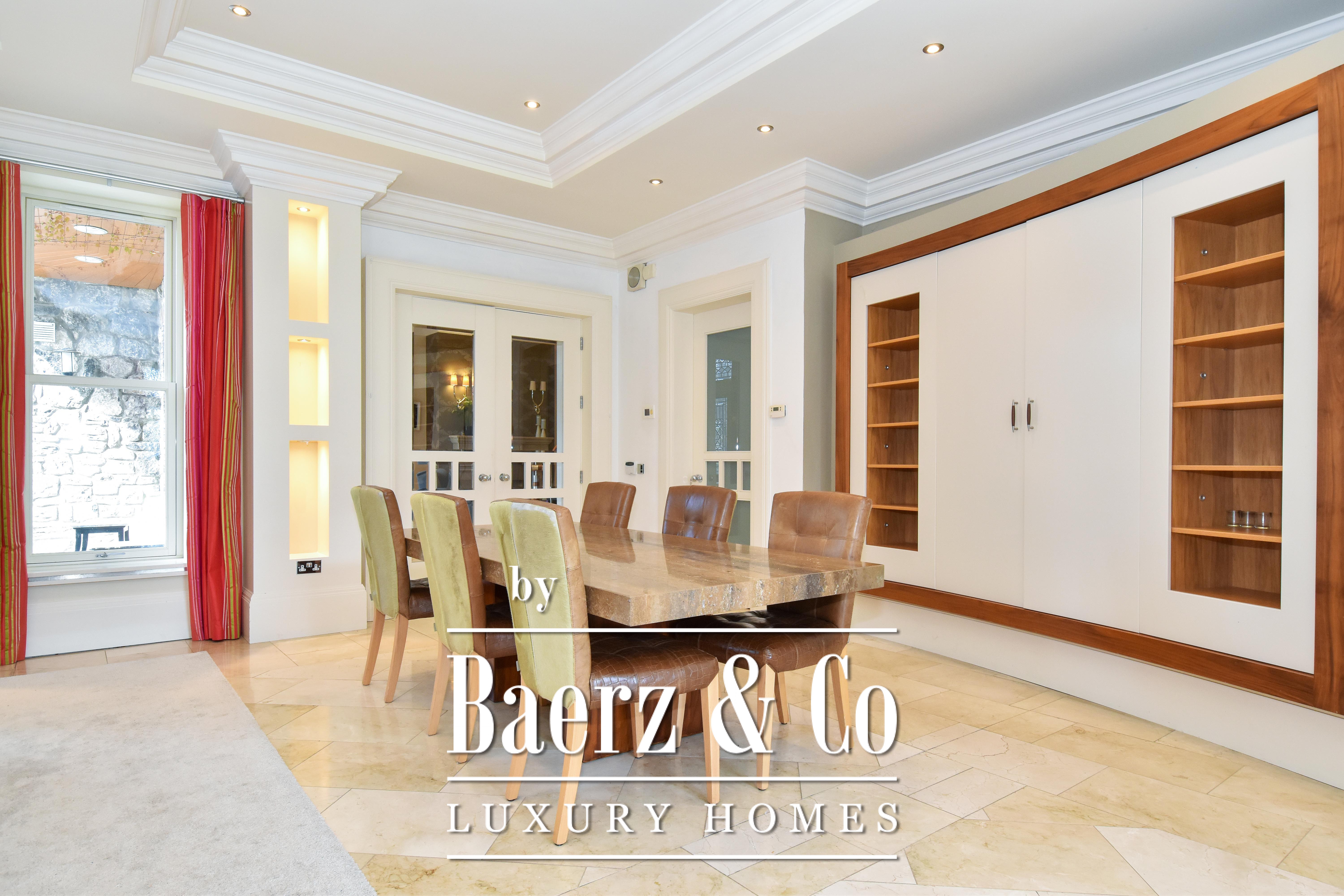 Inside, the sequence of reception rooms, including three living areas, a generous kitchen fitted with Gaggenau appliances and an Aga, and a dedicated lounge with bar, facilitates large family gatherings or private entertaining. Four bedrooms in the main house have ensuite shower rooms; the principal suite adds two walk-in wardrobes, a master bathroom with Jacuzzi bath, and a private balcony overlooking manicured gardens.