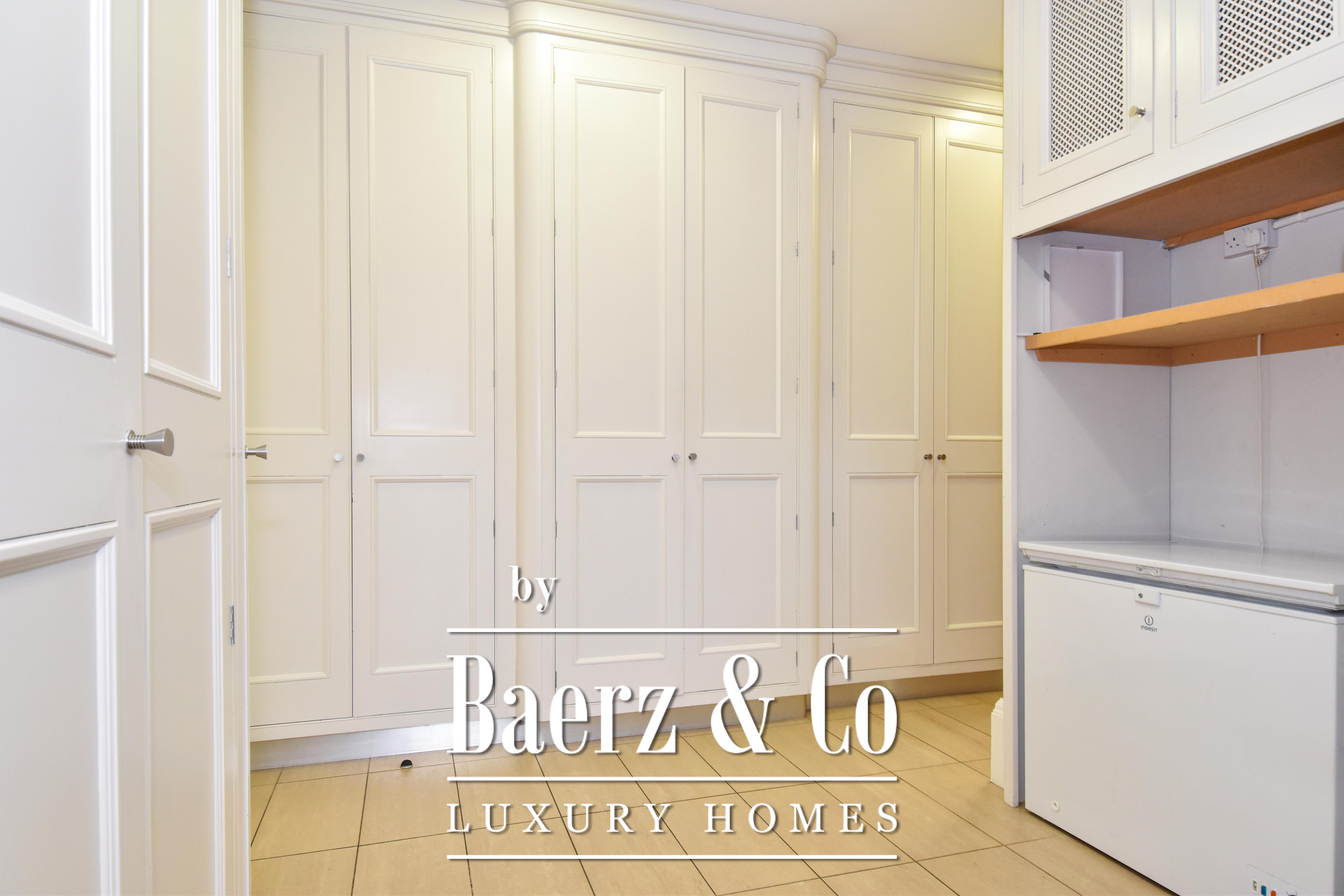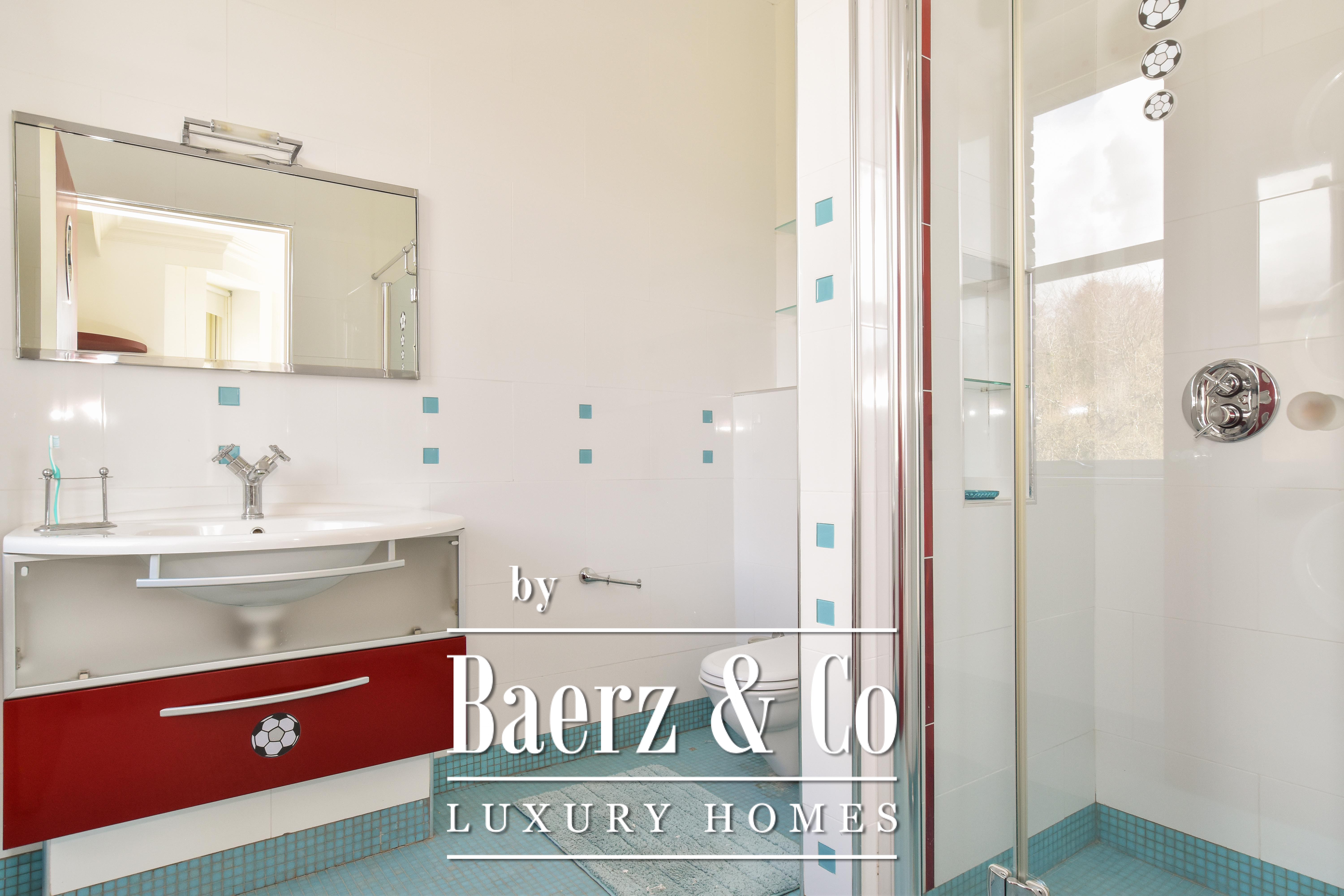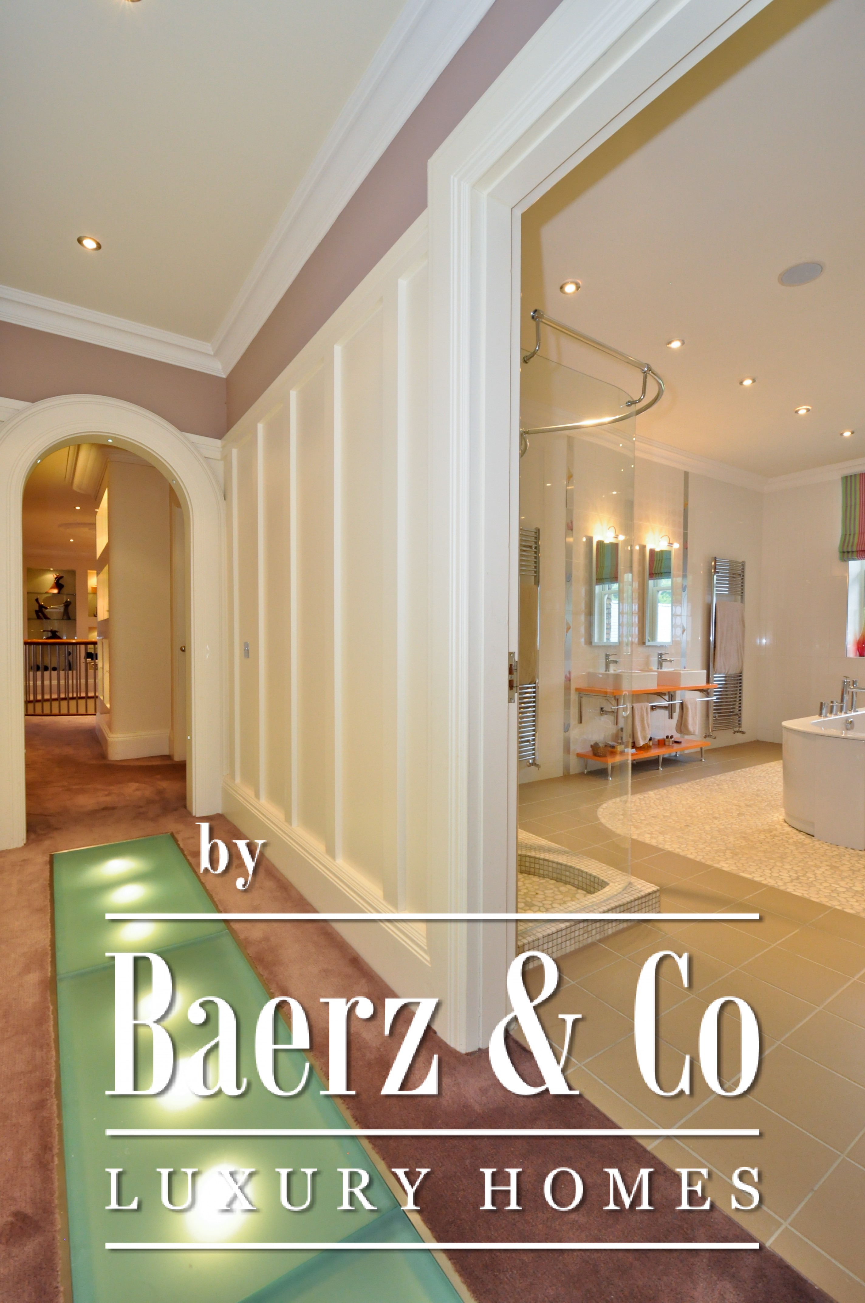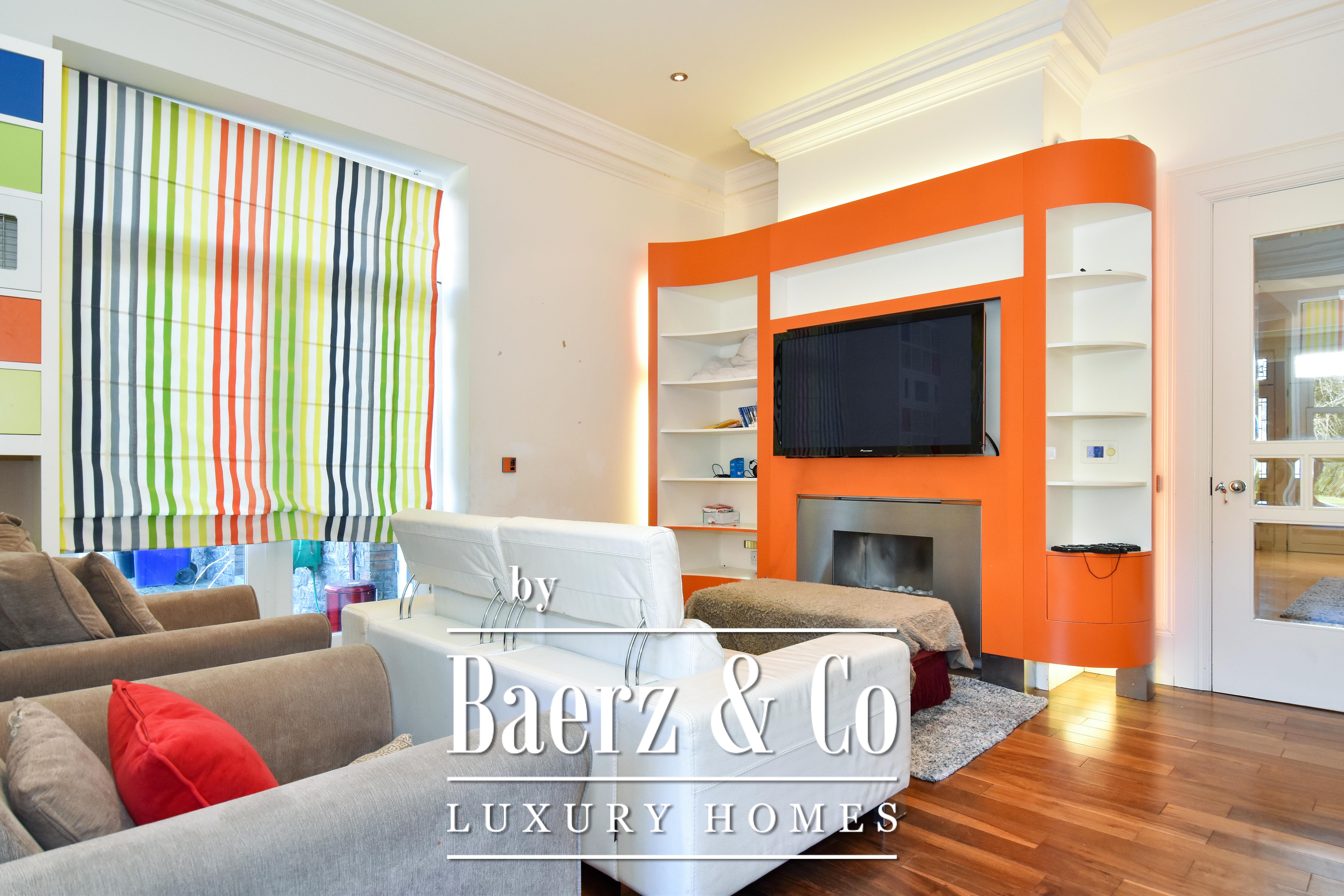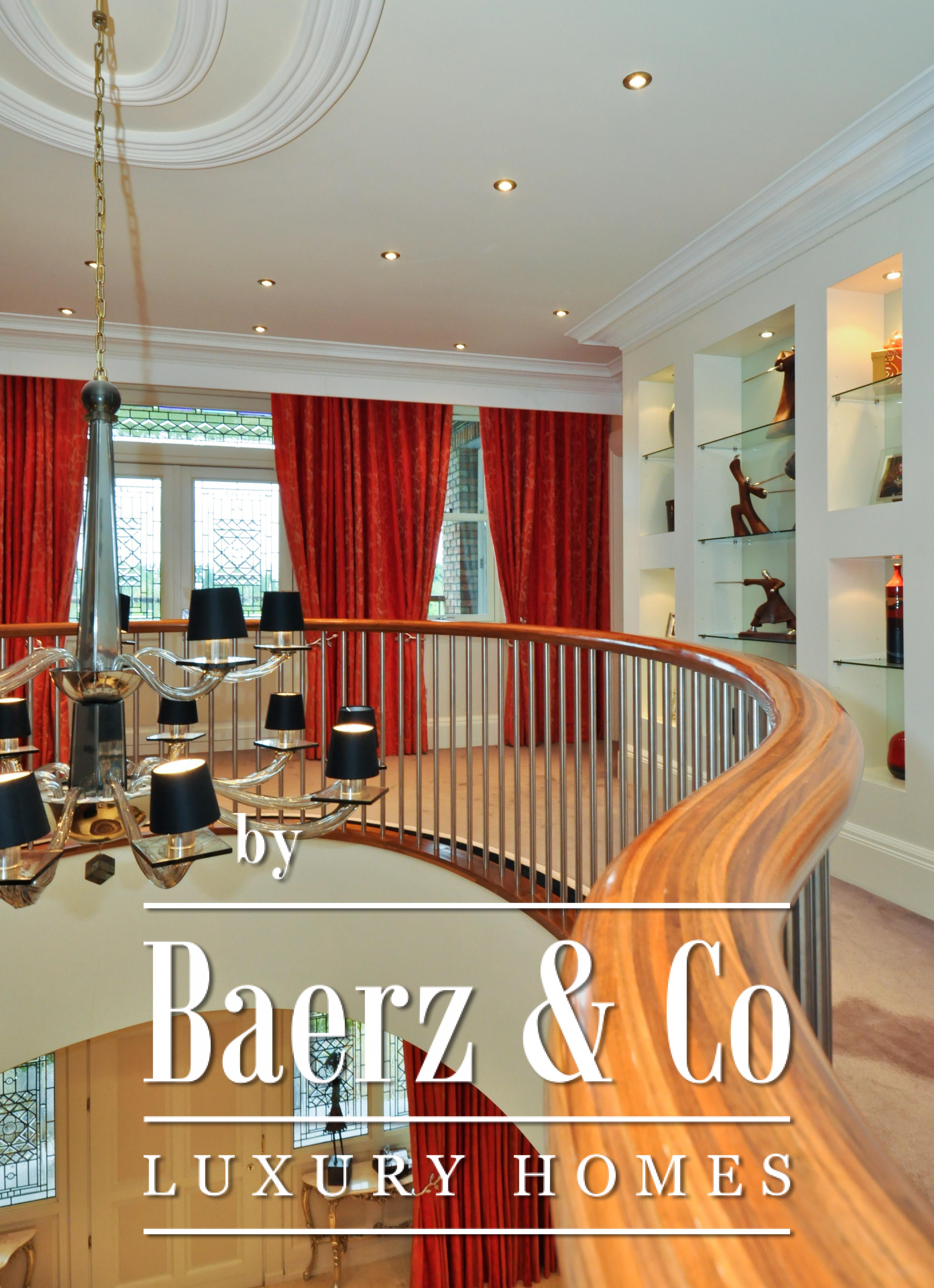 Inside, the sequence of reception rooms, including three living areas, a generous kitchen fitted with Gaggenau appliances and an Aga, and a dedicated lounge with bar, facilitates large family gatherings or private entertaining. Four bedrooms in the main house have ensuite shower rooms; the principal suite adds two walk-in wardrobes, a master bathroom with Jacuzzi bath, and a private balcony overlooking manicured gardens.