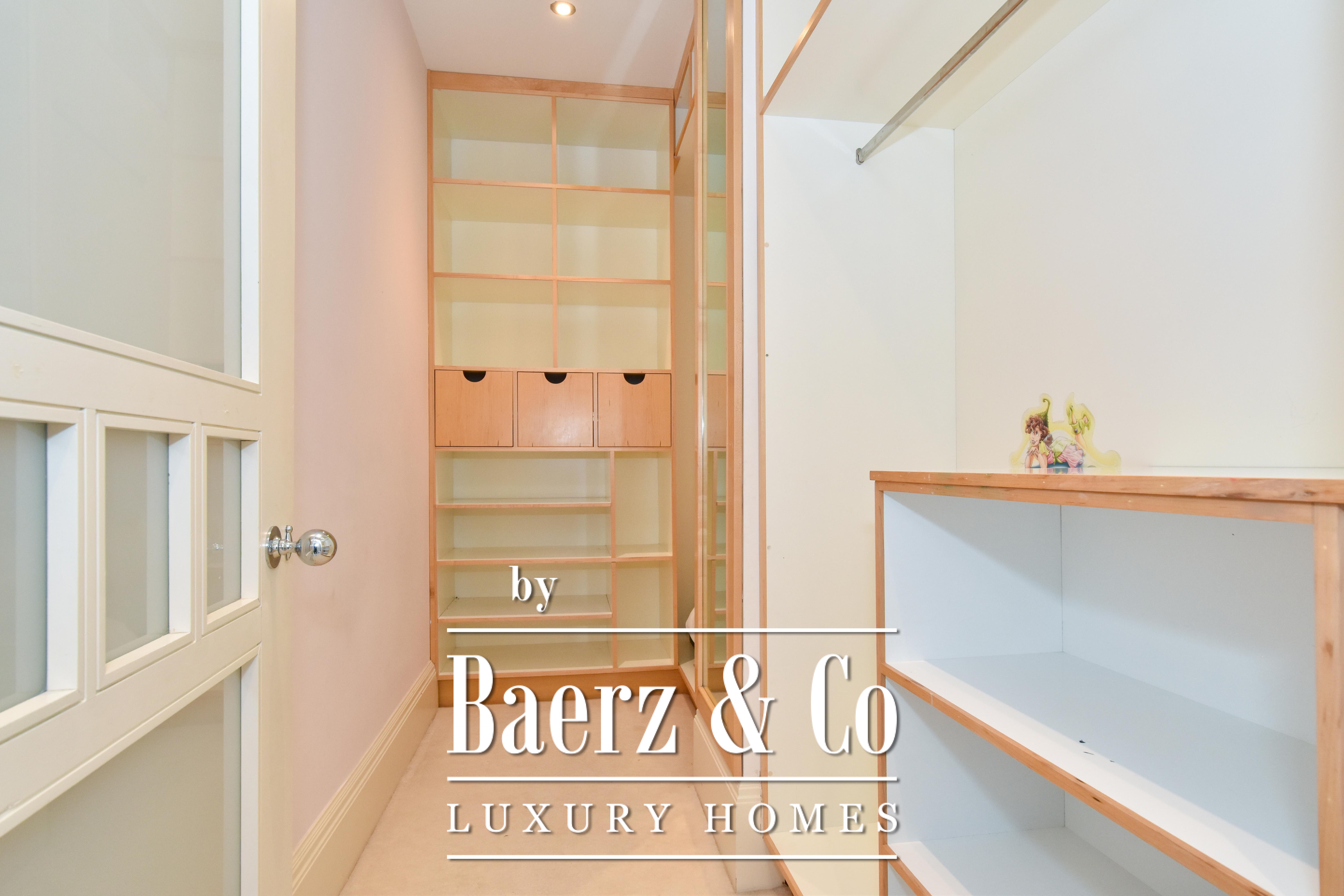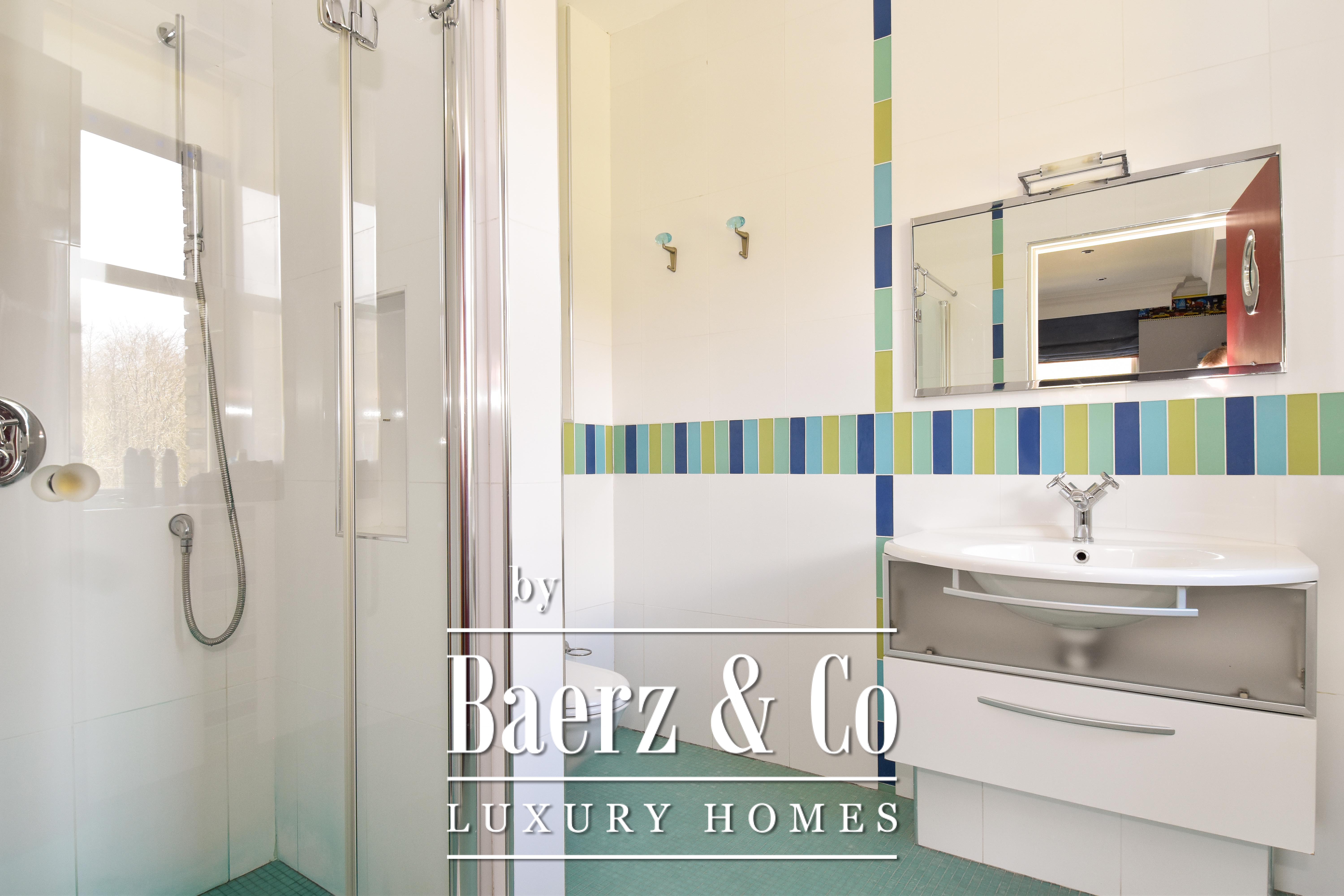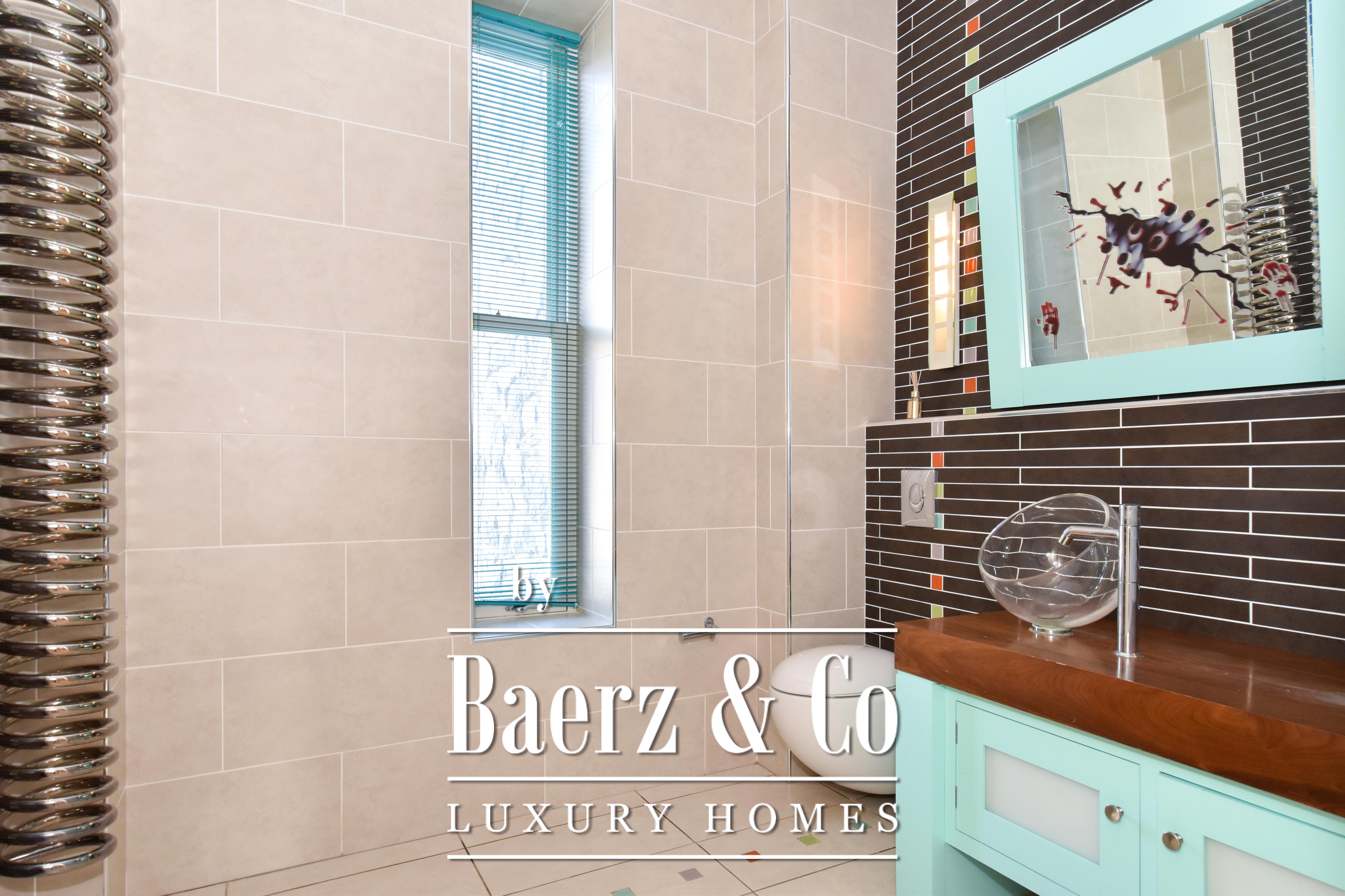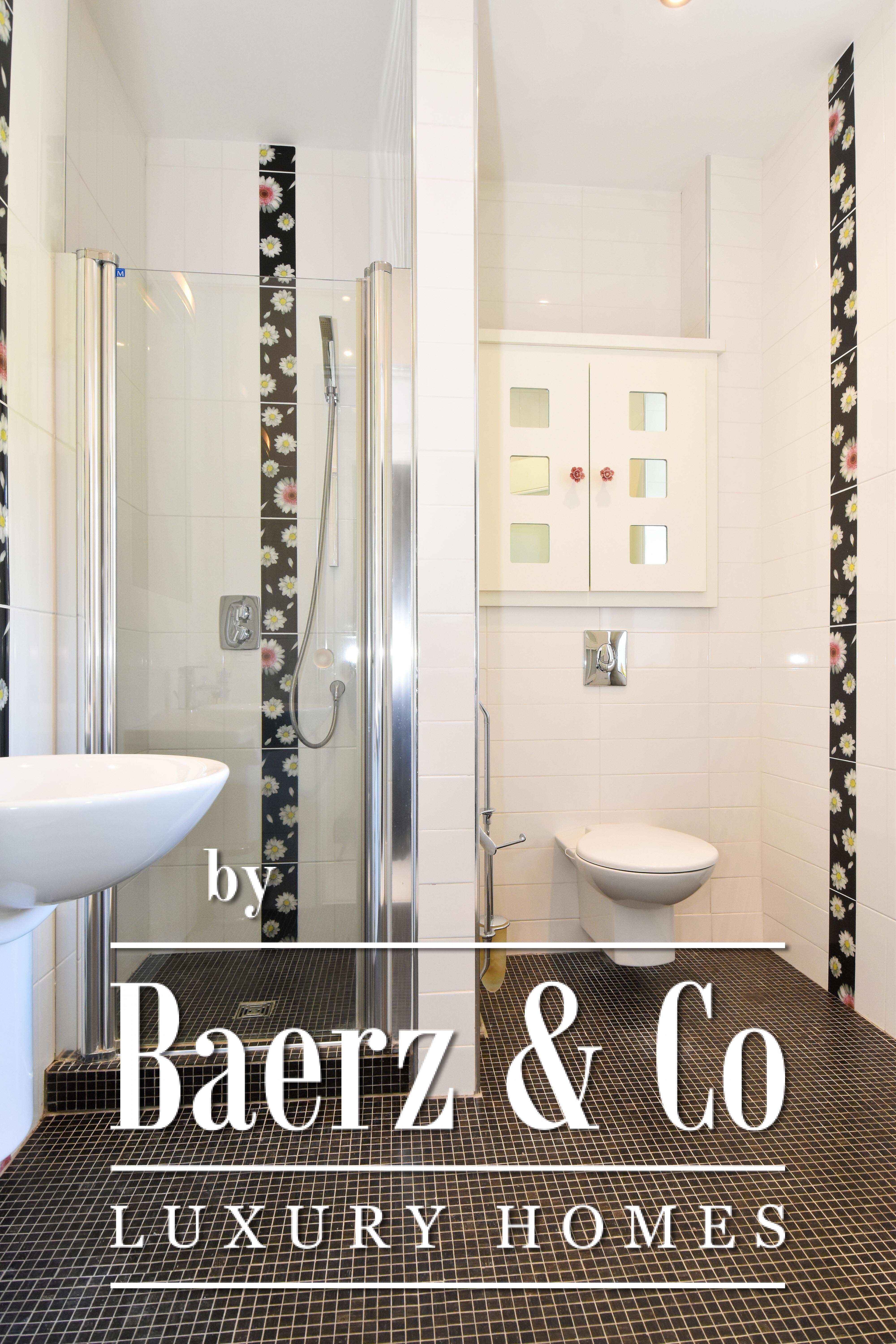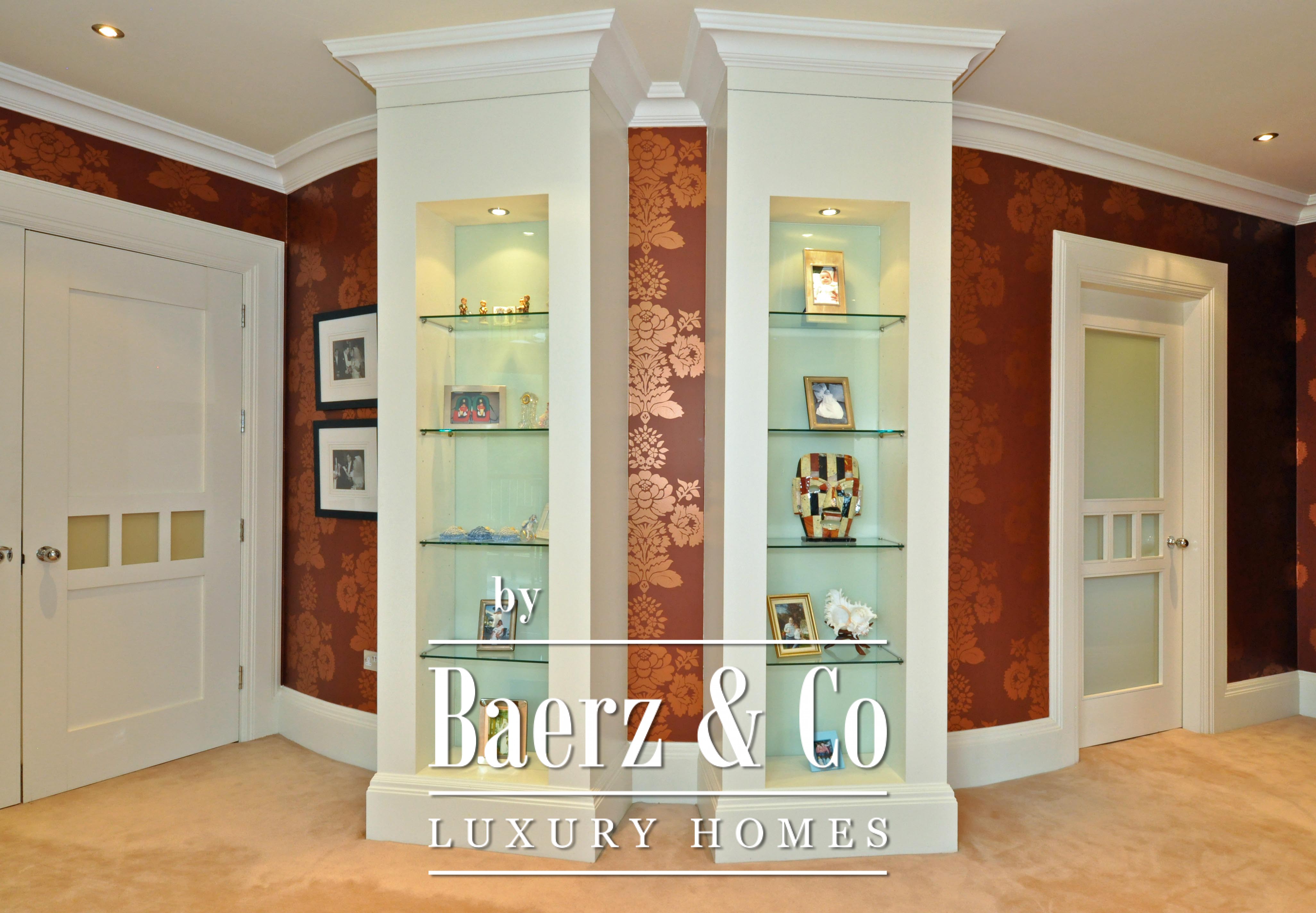 Inside, the sequence of reception rooms, including three living areas, a generous kitchen fitted with Gaggenau appliances and an Aga, and a dedicated lounge with bar, facilitates large family gatherings or private entertaining. Four bedrooms in the main house have ensuite shower rooms; the principal suite adds two walk-in wardrobes, a master bathroom with Jacuzzi bath, and a private balcony overlooking manicured gardens.