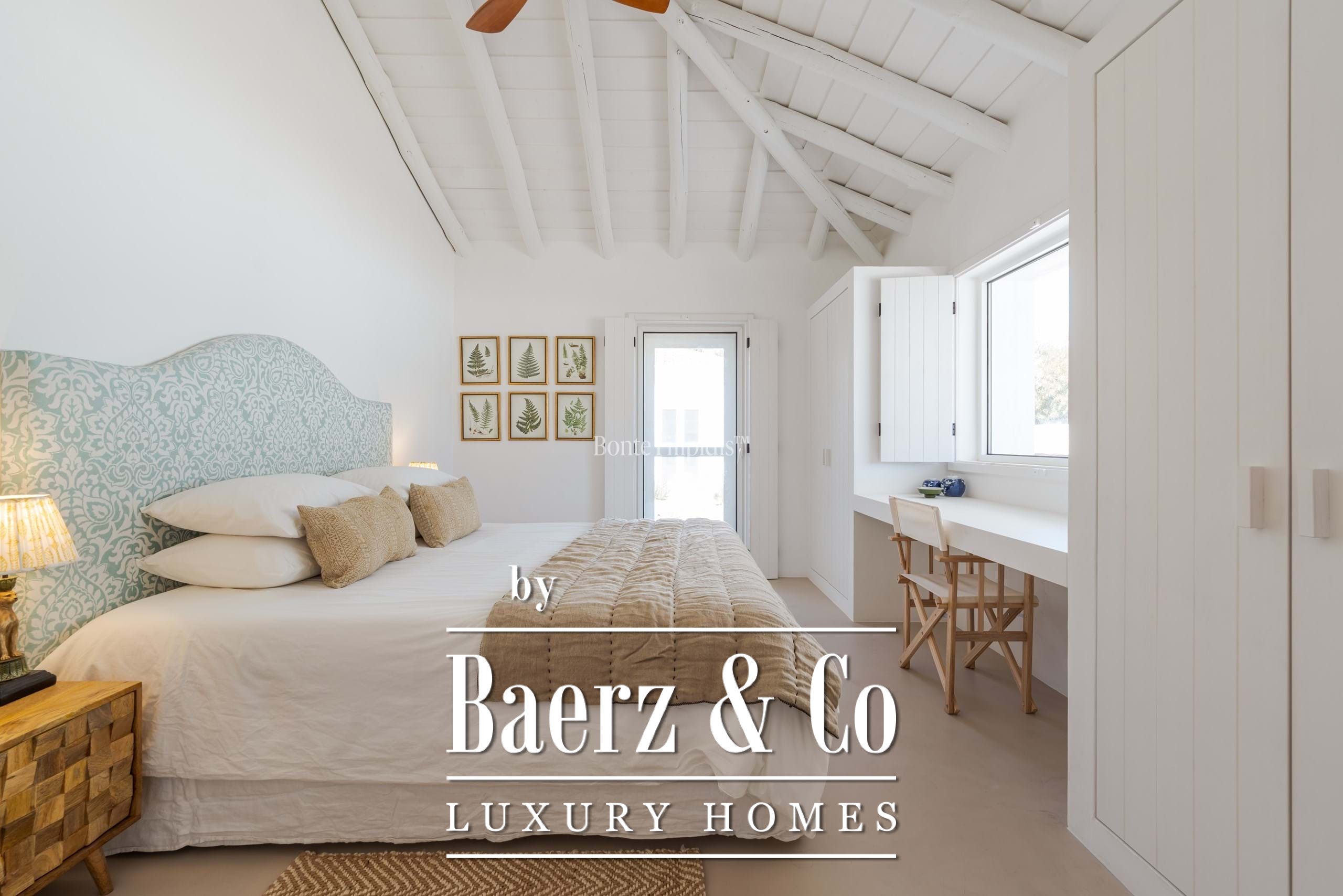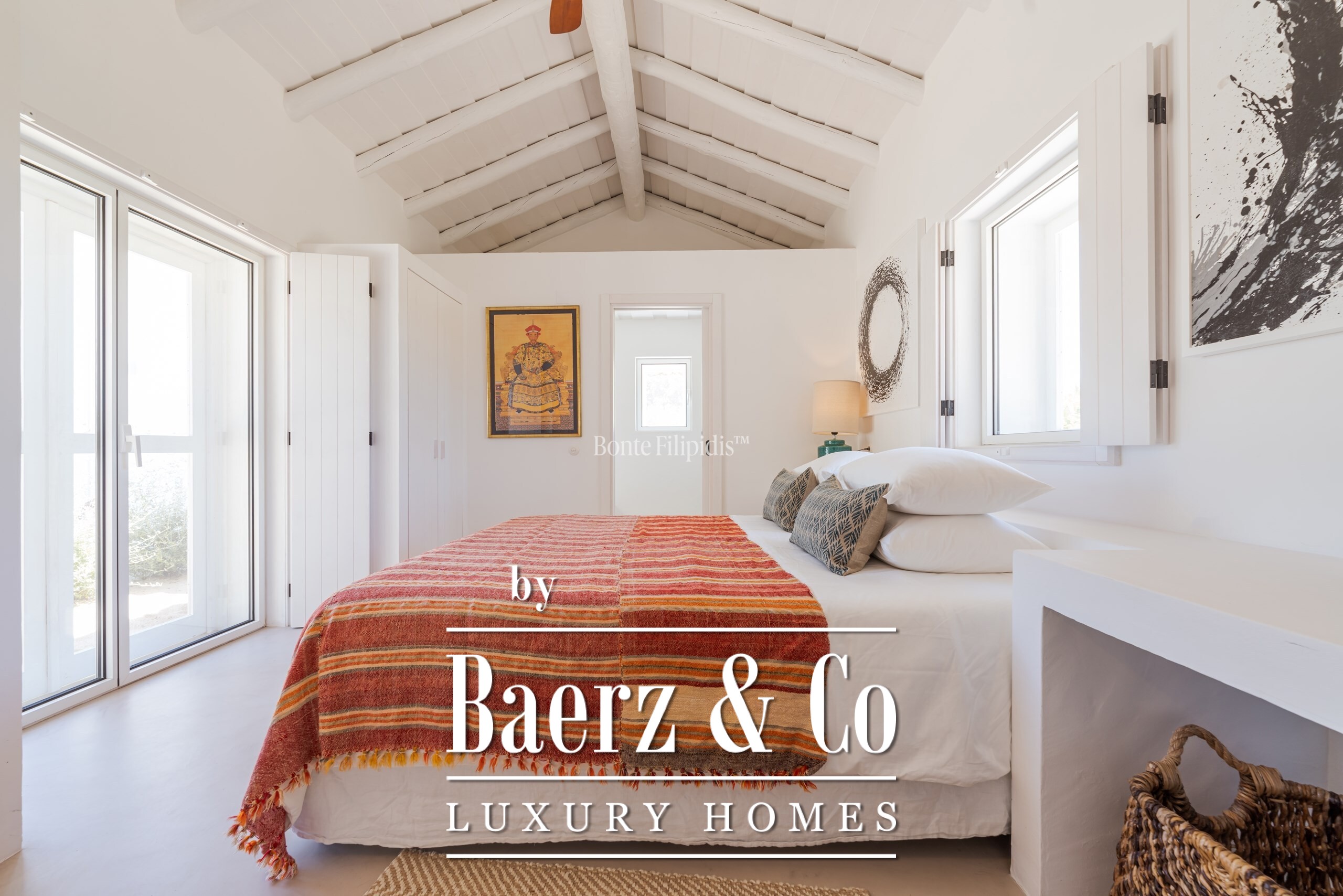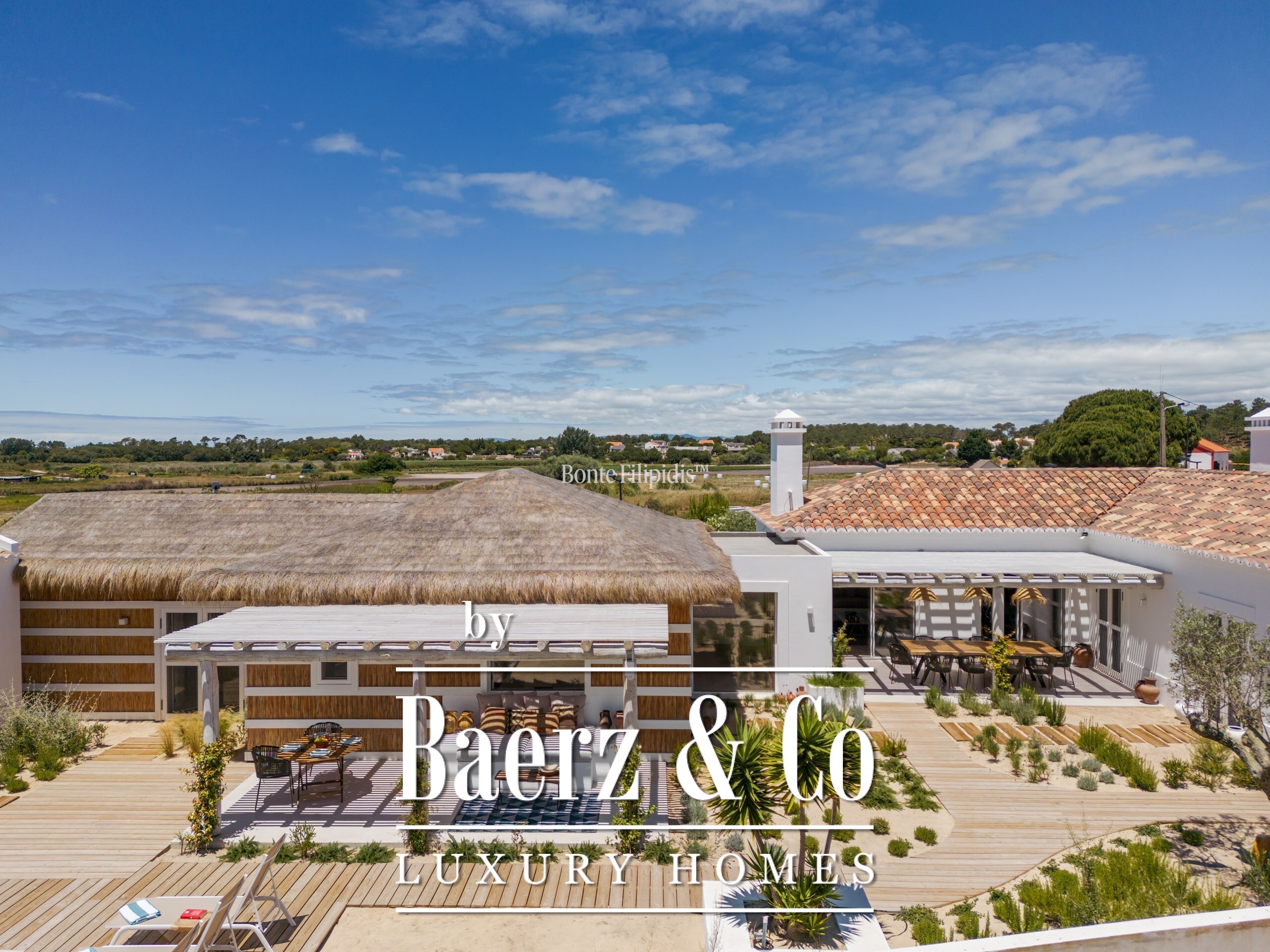 Set on a generous plot with a stunning Mediterranean garden, the home features traditional straw façades and thatched roofing, along with vaulted interior wooden ceilings that enhance the feeling of warmth and space. Interiors are bathed in natural light and finished with soft tones, handcrafted details, and high quality materials. The living and dining area opens to a covered pergola ideal for al fresco dining, and all five of the large suites also open onto different parts of the garden. A timeless retreat in one of Portugals most protected and exclusive coastal destinations.