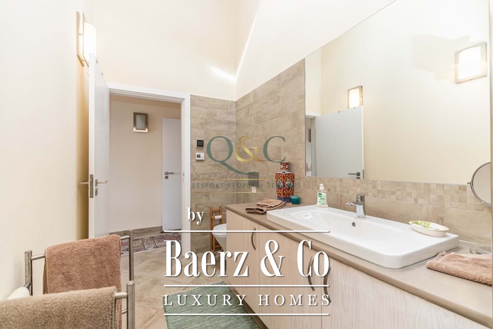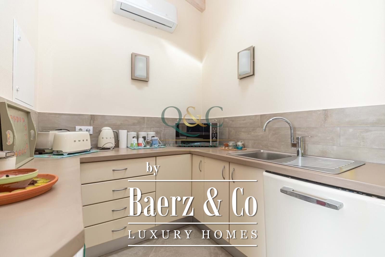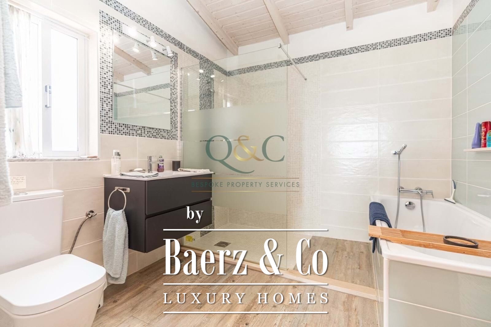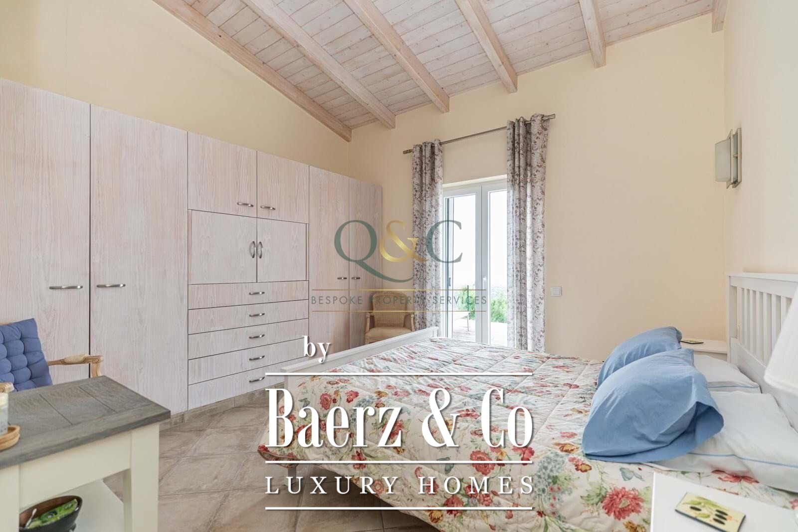 The main house retains its original character with an open-plan kitchen, lounge, and dining area with Large sliding doors open to a sun-drenched terrace and swimming pool, laundry room, a generous bedroom, and a family bathroom on the ground floor. Upstairs, two spacious suites feature private terraces with breathtaking sea views