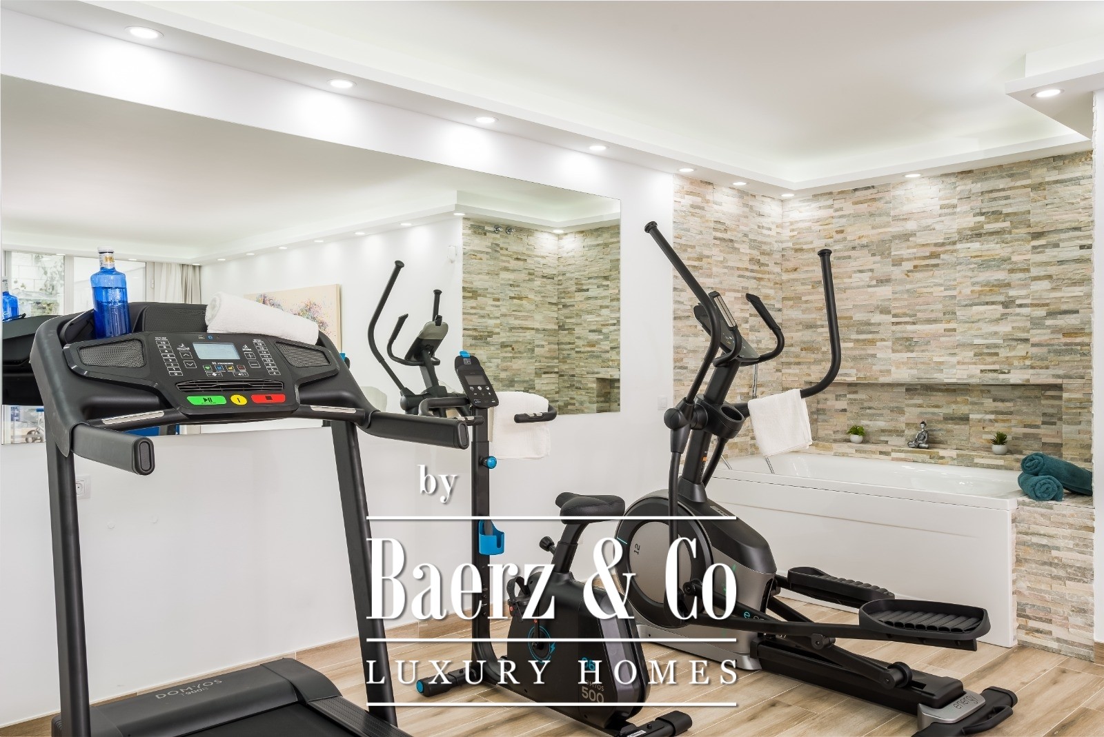 Ascending to the first floor, the master bedroom commands view lines toward the sea, enriched by an en-suite with double shower and a dedicated dressing area. An additional bedroom also benefits from the seascape. On the lower floor, two more bedrooms with en-suite bathrooms and a dedicated gym area with double whirlpool bath create a retreat within the home.