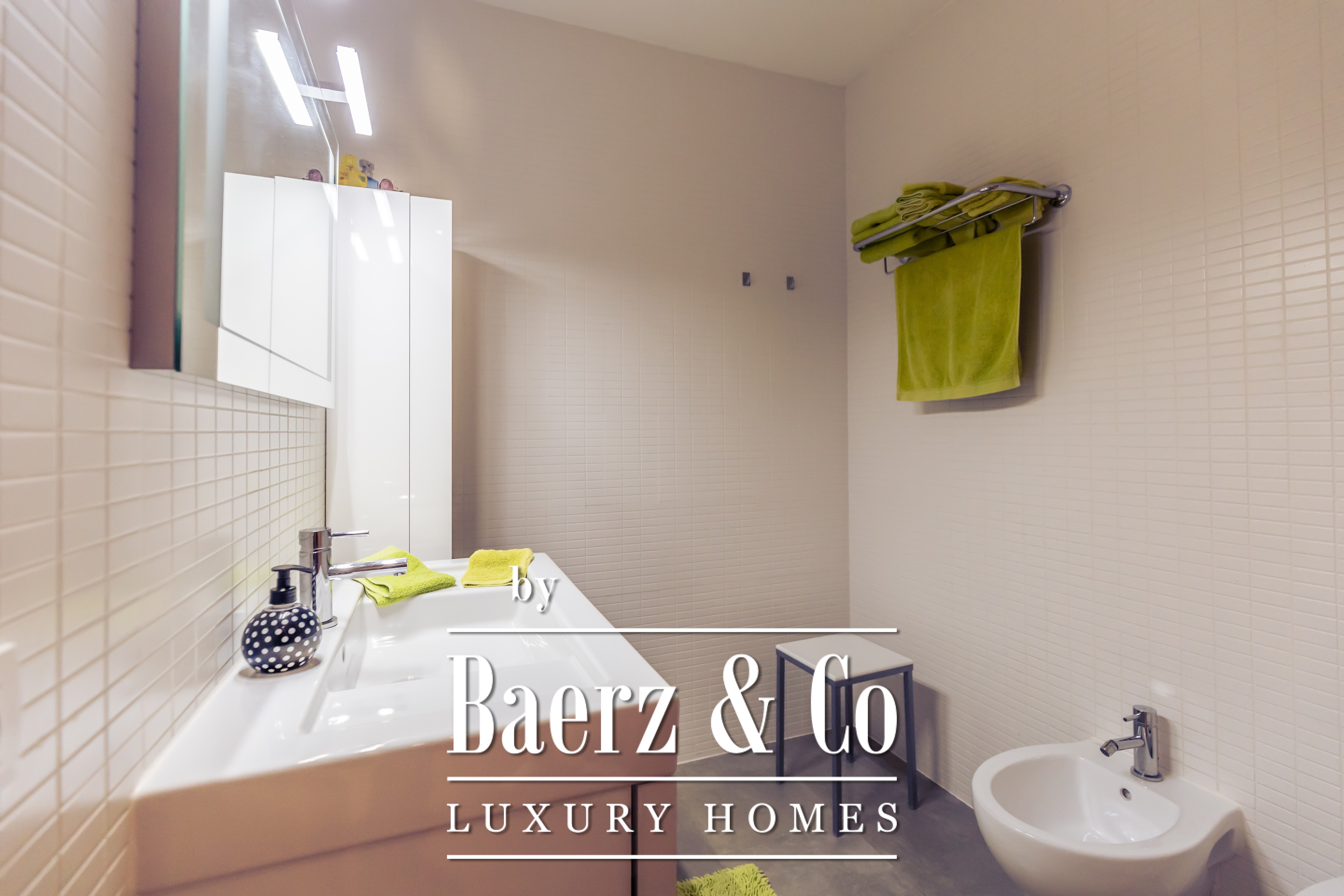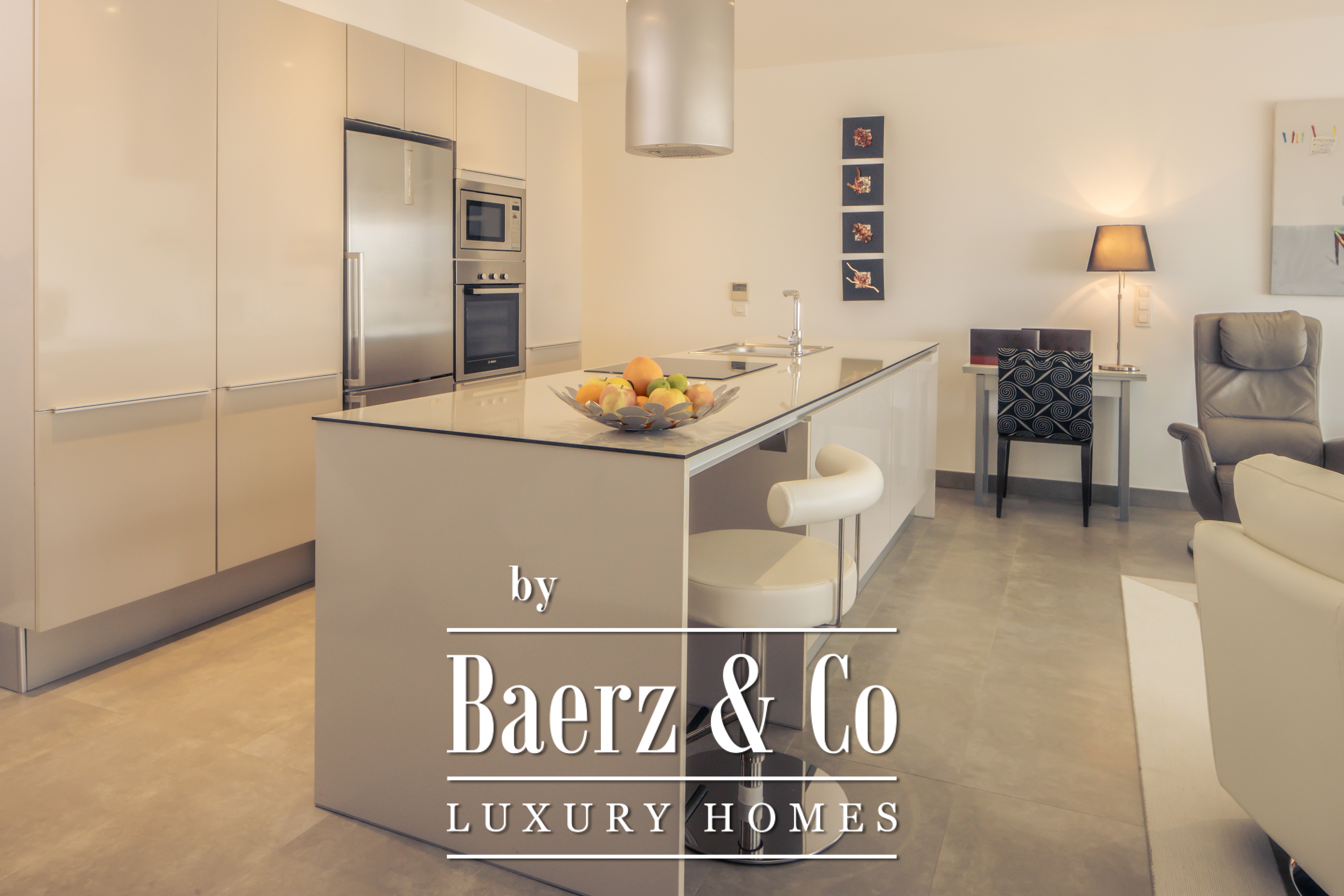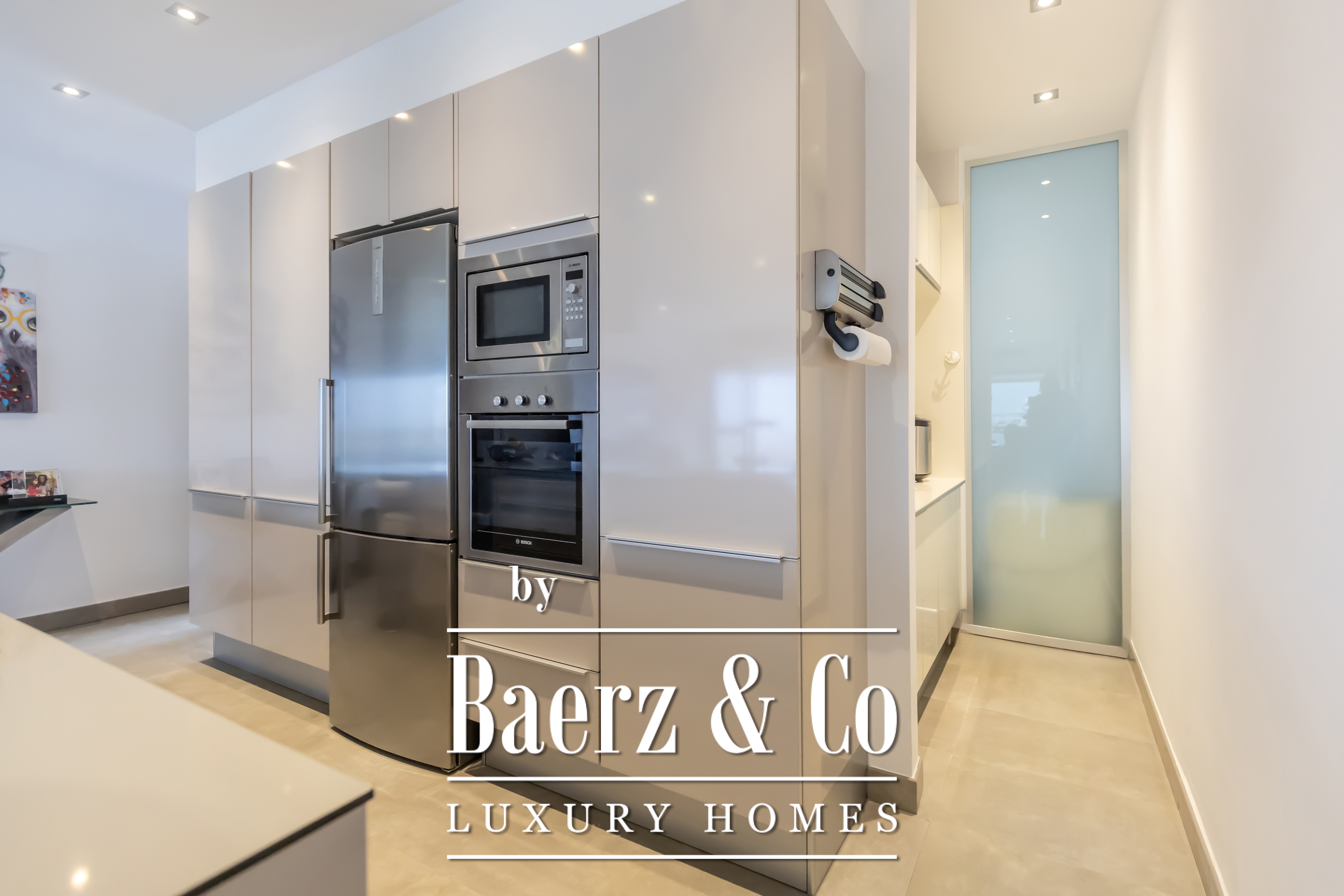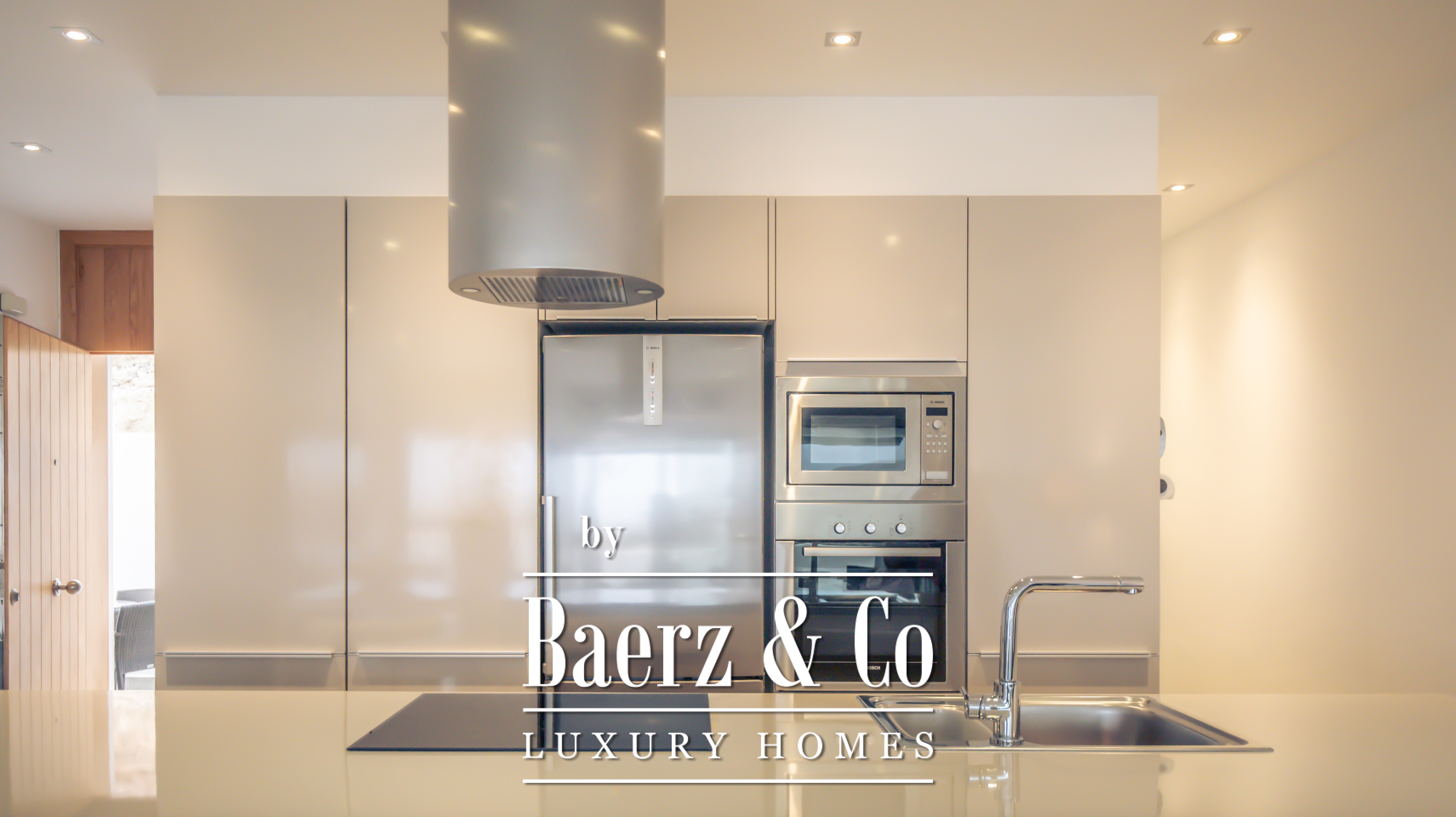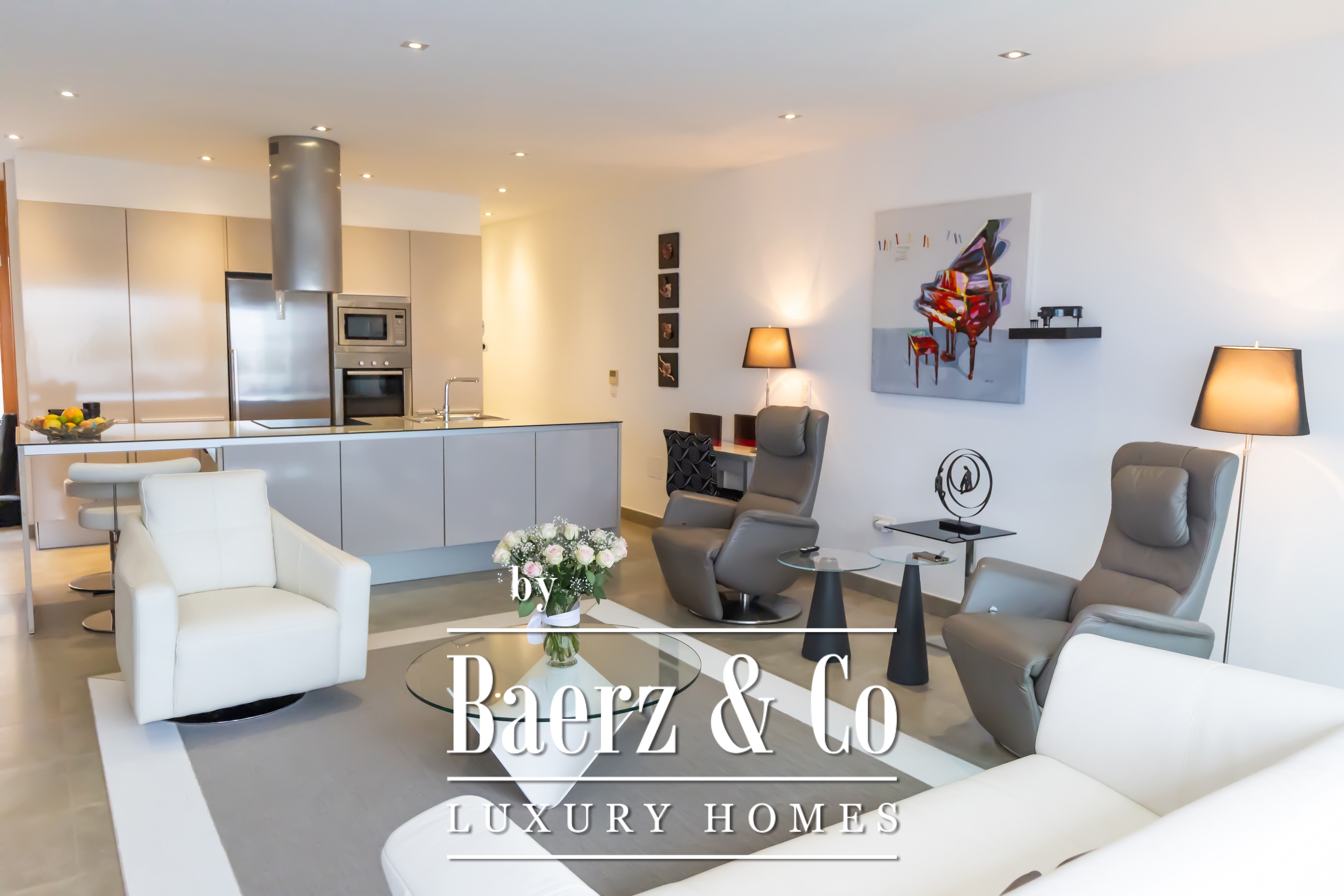Inside, the property features three bedrooms, two bathrooms and a separate guest toilet, with a spatially fluid living area that connects seamlessly to a modern open-plan kitchen. Natural light shapes each space, revealing clean lines and curated furnishings that are included in the sale. A dedicated laundry room and indoor parking space further support modern ease and discretion.