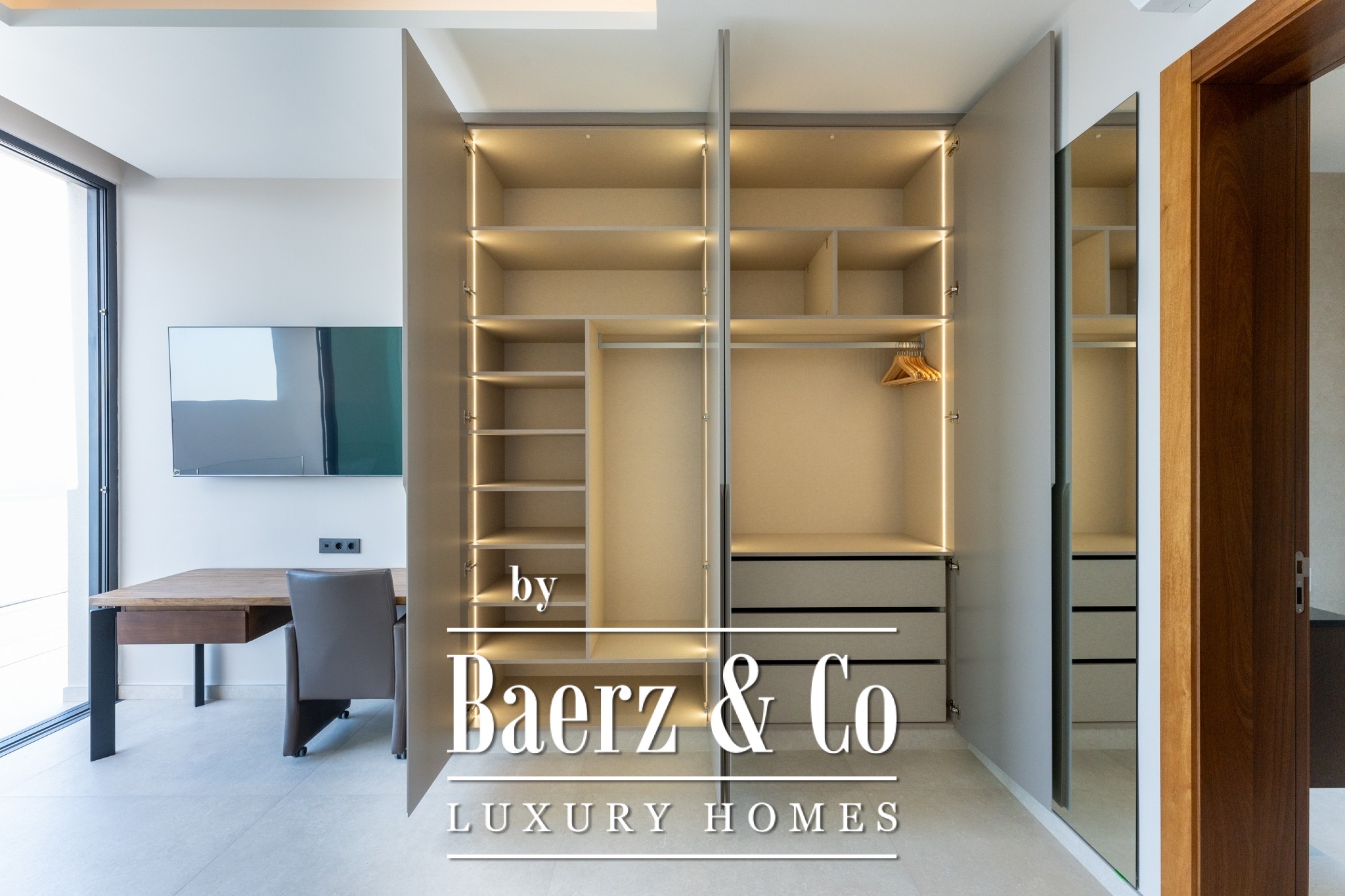 Built to the highest standards and with beautifully designed spaces, this elegant villa is a unique oasis of luxury and privacy. It covers a plot of 605 m² with a built area of 631 m² spread over three floors, which are connected by a lift. The ceiling height of 3.20 metres and large glass walls allow plenty of light to enter and offer a panoramic view of the sea and coastline.