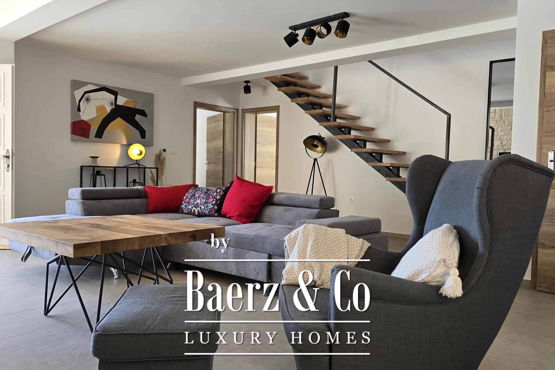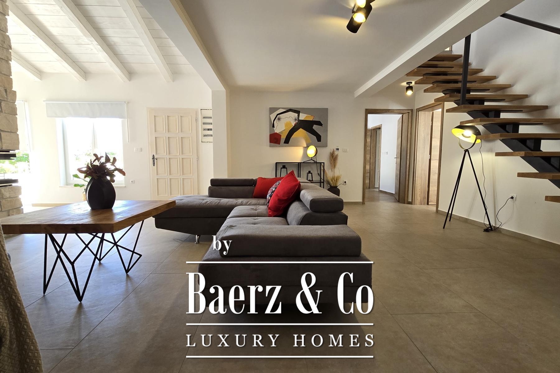 Outdoors, a stone-paved terrace unfolds to a heated 35 m² pool, surrounded by a hydromassage tub, sun loungers, and a dining area crafted from Slavonian oak. A stone barbecue and secure, fenced grounds shape a relaxed, private retreat, while a two-space garage, air conditioning, underfloor heating, and fireplace ensure comfort in every season.