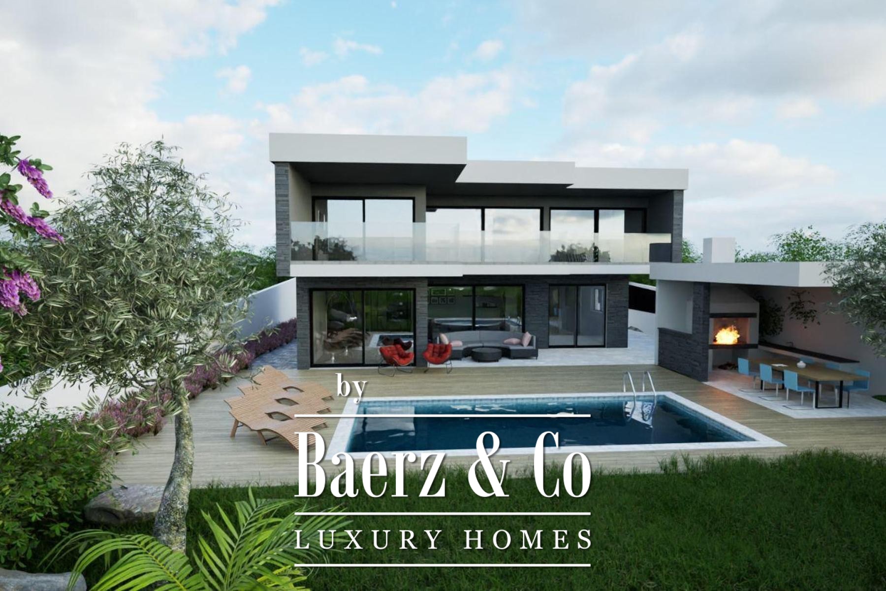 Throughout, a restrained palette frames views toward the Adriatic, with four bedrooms each offering an en suite bathroom and outlooks across the water. An open living area, kitchen, and dining zone form the heart of the home, defined by full-height glass that merges interior and exterior. The pool and broad terrace invite a seamless connection with the landscaped garden, while mature planting adds privacy and softens the architecture.