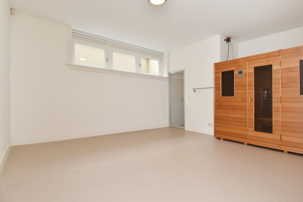 Large hallway. Toilet with washbasin. Gym with sauna and shower facilities. Multifunctional room with built-in cupboards. Storage area housing the boiler and heat pump (geothermal heating system).