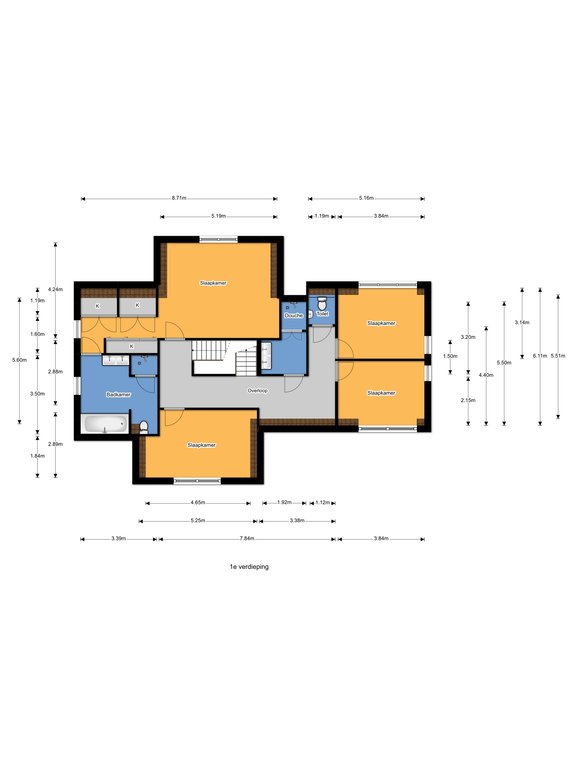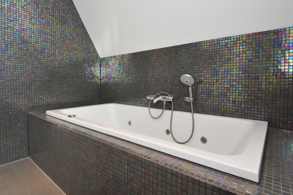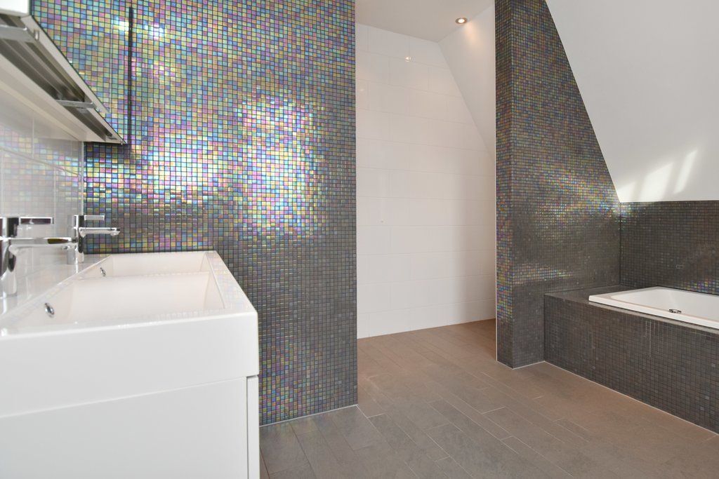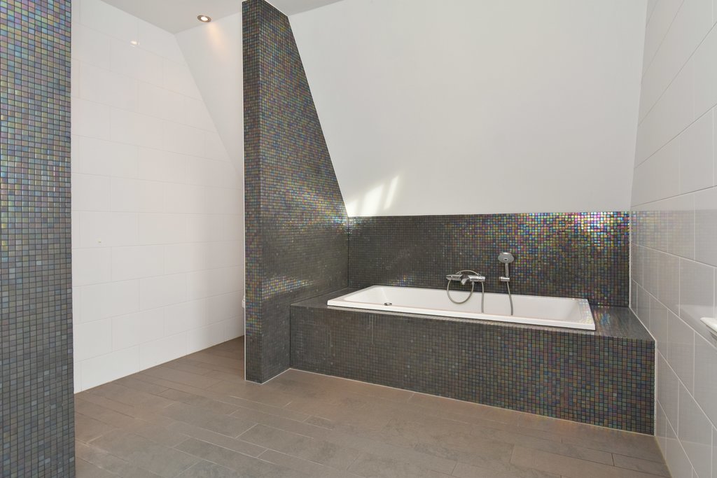 Spacious landing with skylight. Large master bedroom with built-in wardrobes and adjoining luxurious bathroom featuring a whirlpool bathtub, walk-in shower, toilet, and double vanity. Rear-facing bedroom with dormer window. Two additional bedrooms (3.14 x 3.84 m and 3.50 x 3.84 m), both with dormer windows and playful loft spaces. Second bathroom with double washbasin and walk-in shower. Separate toilet with wall-mounted WC and washbasin.