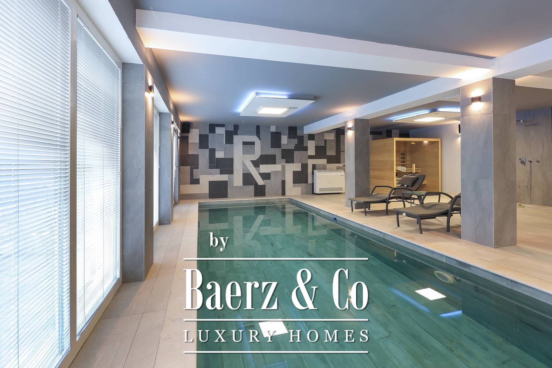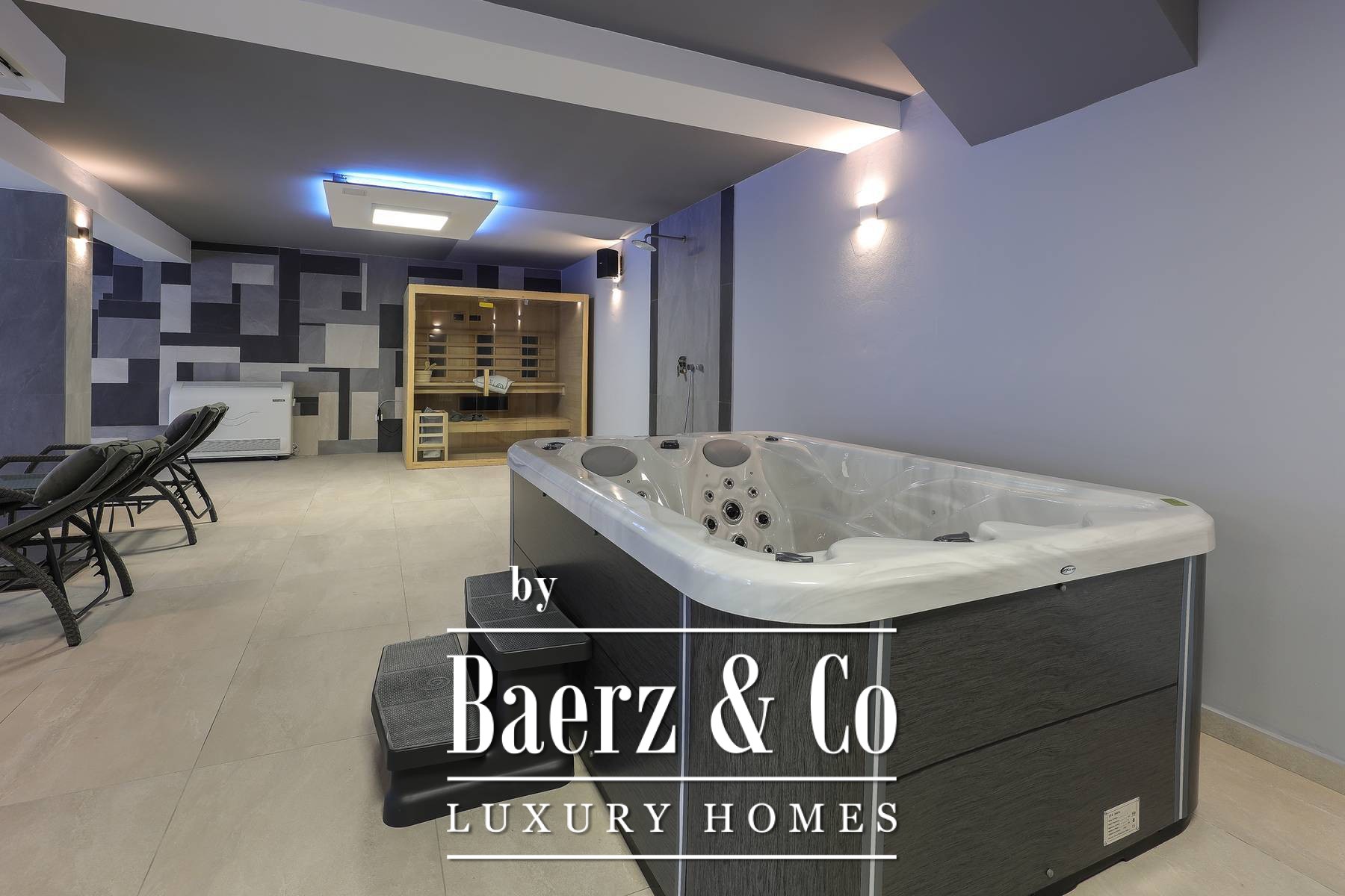 A solar power plant delivers energy independence, complemented by underfloor heating and a Wissman heat pump to ensure comfort year-round. The wellness oasis anchors the home: a 10 by 4.5 meter indoor pool with heated salt water, a Finnish sauna, infrared sauna, and a hot tub offer restorative possibilities.