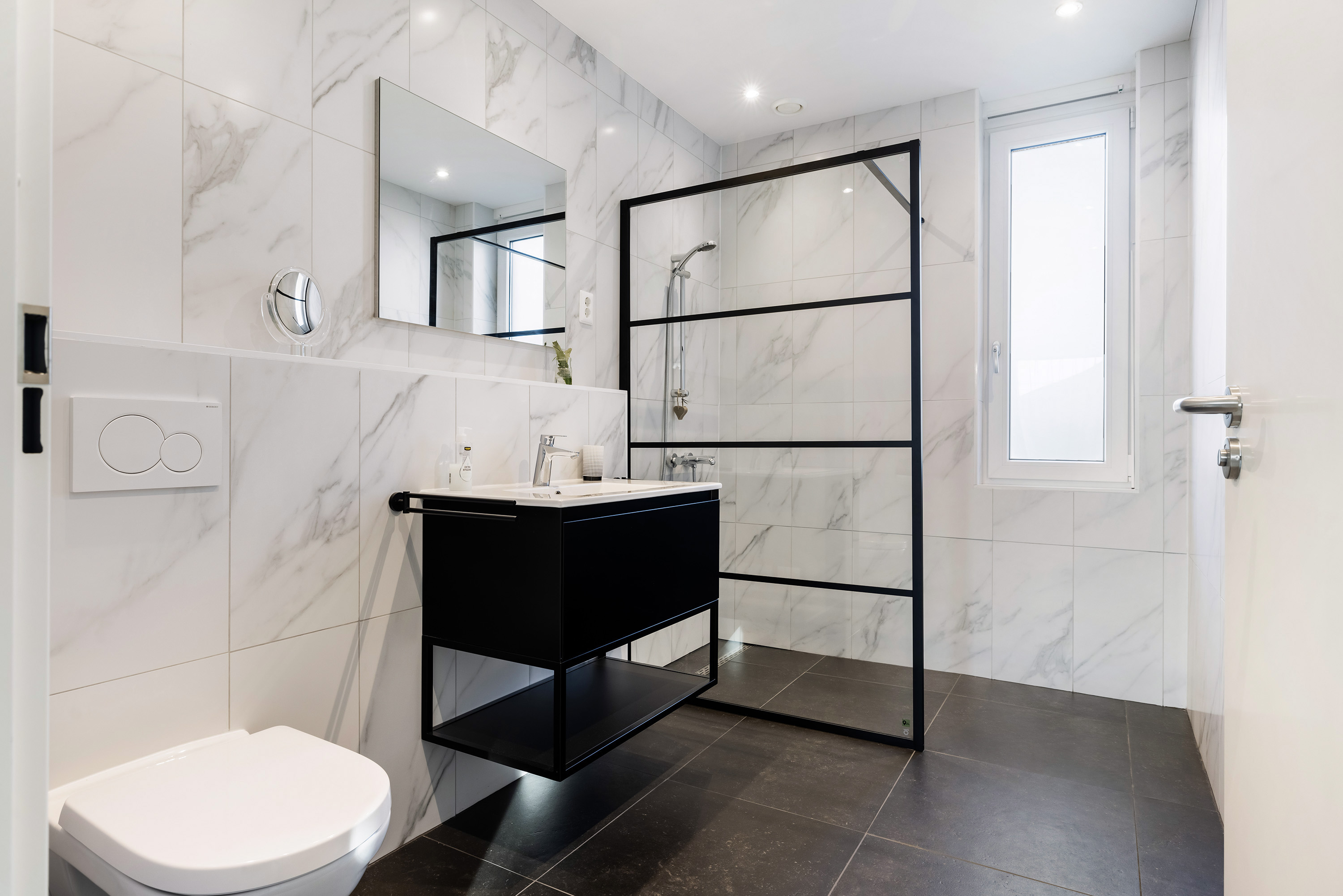 Also accessed from the kitchen, this luxurious fully tiled bathroom features a walk-in shower with thermostat tap, wall-hung toilet, and washbasin unit. It connects to the adjacent bedroom via a sliding door.
