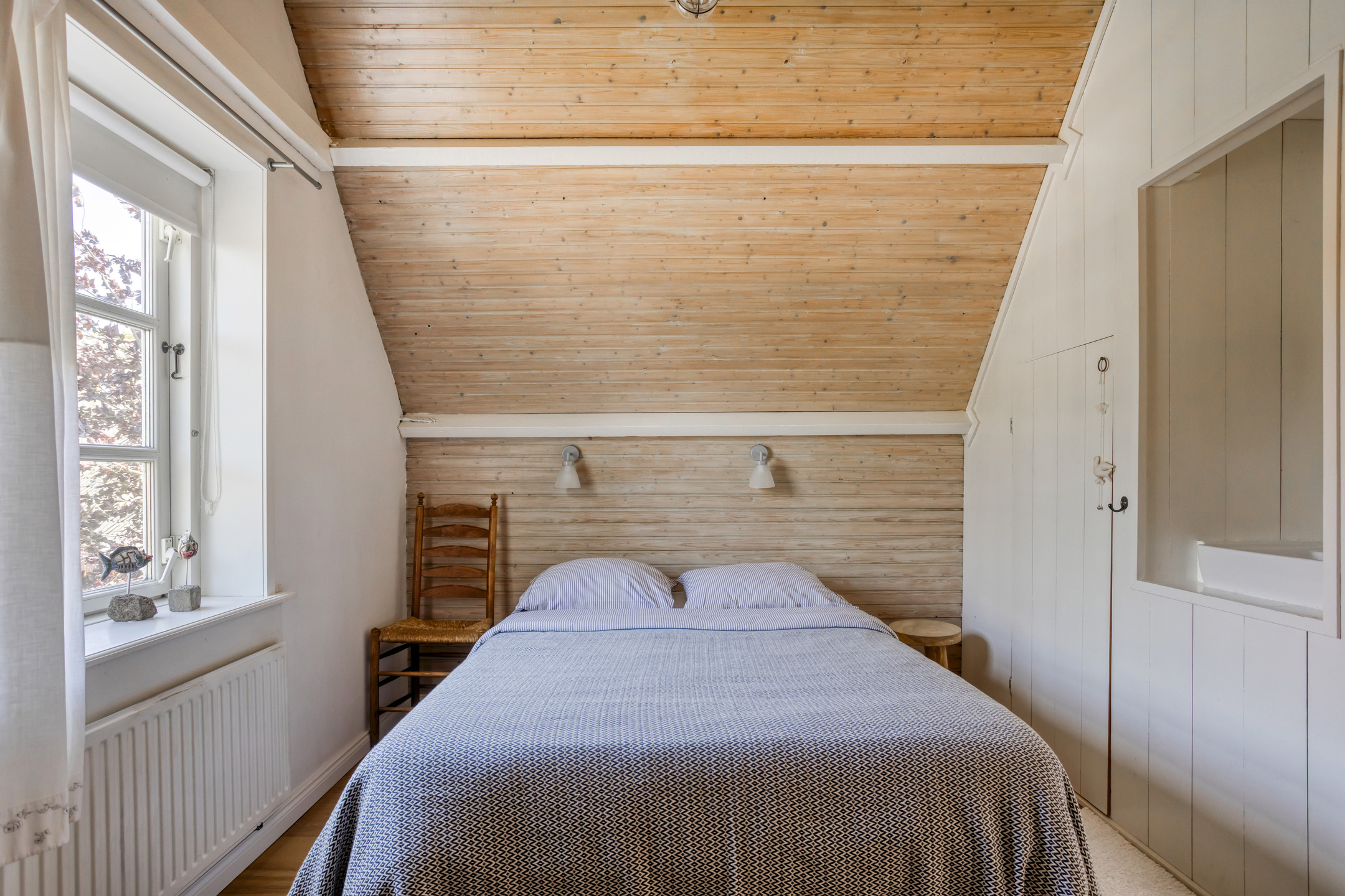 The first floor is divided between the front and rear sections of the house. In the front, you’ll find two spacious bedrooms, each with storage behind the knee walls. In the rear, a wide staircase leads to a charming landing with a built-in box bed—a unique feature sure to appeal to children. From here, you access the spacious master bedroom, which includes built-in wardrobes, a storage loft, and French doors opening onto a large rooftop terrace with panoramic views of the surrounding landscape.