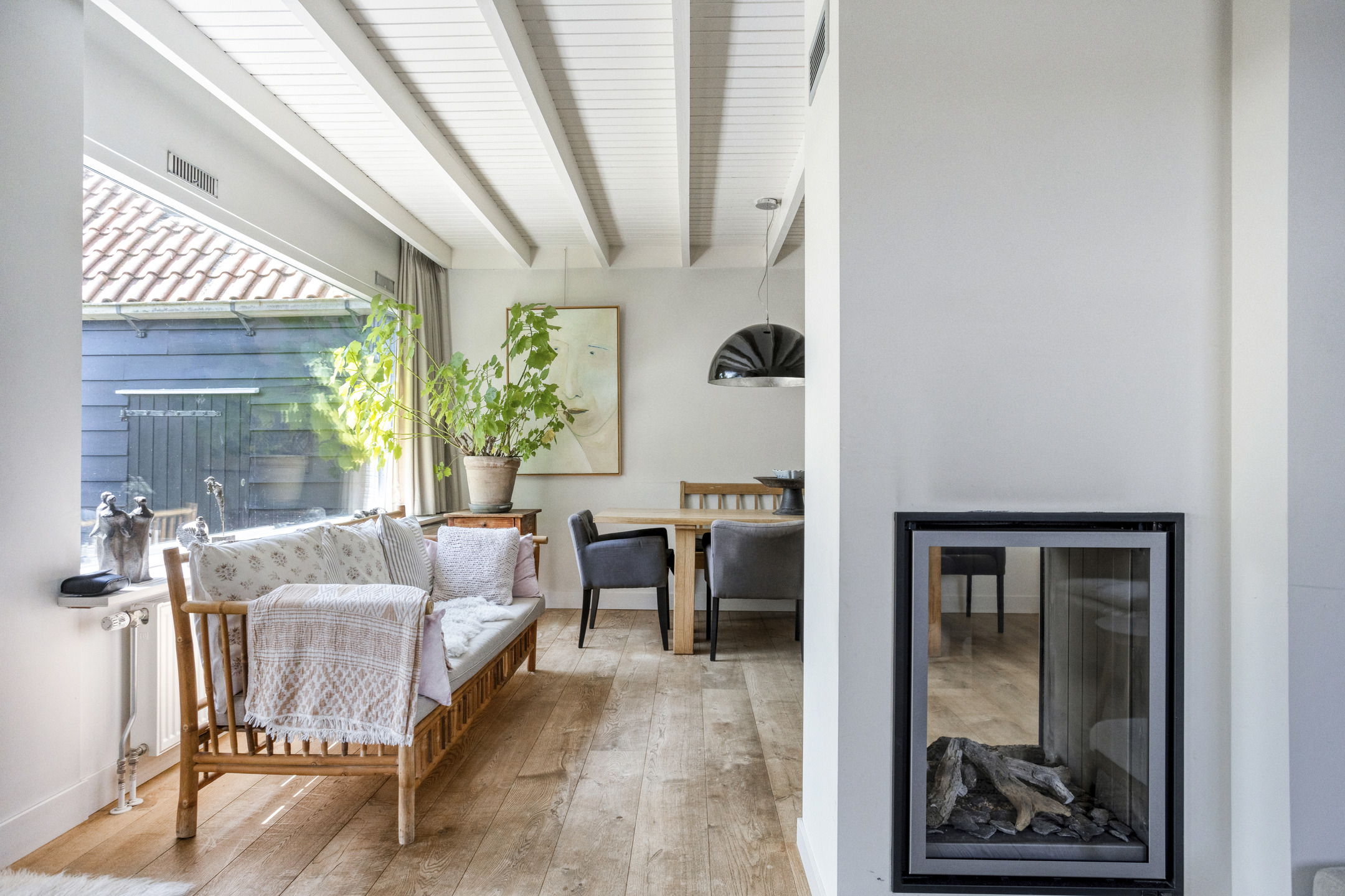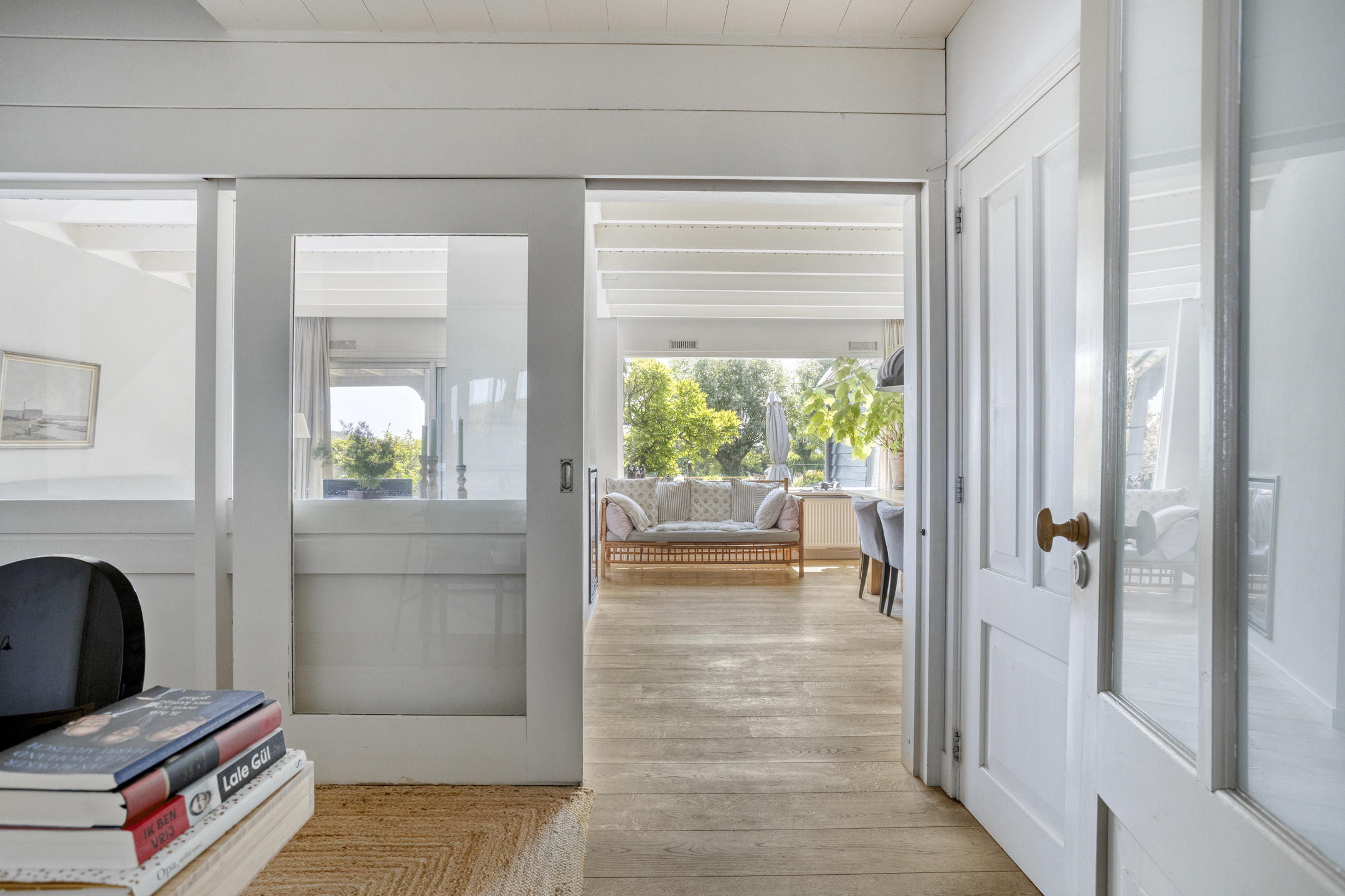 Through the front door, you enter a hallway that leads to the front house. At the front is the semi-open kitchen, equipped with a 5-burner gas hob, oven, dishwasher, and a freestanding fridge-freezer. Adjacent to the kitchen is the cozy dining room with beautiful light from the large windows, forming the warm heart of the home. Next to the dining room is a comfortable living room, which can easily switch functions with the dining room if desired. From the dining room, a staircase also leads to the first floor of the front part of the house.