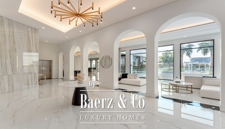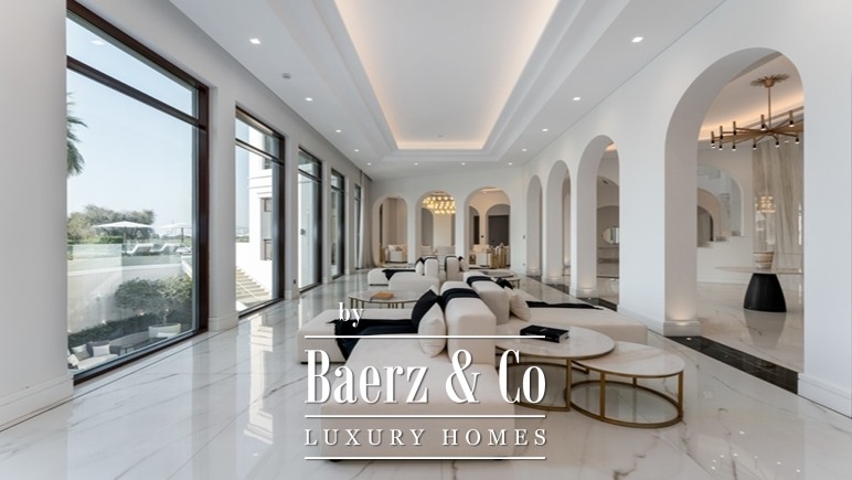 This stunning residence combines Arabesque architectural elements with vibrant modern interiors. It features multiple open-plan living spaces, including: