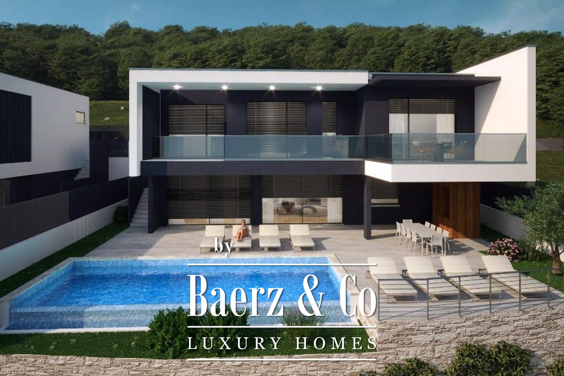 Krilo Jesenice, a modern villa with an open sea view. Total net area 273.75 m², with an additional swimming pool of 45 m² and an engine room of 15.60 m², on a plot of 465 m². Only 100 m from the sea as the crow flies.The villa is designed on two floors:The ground floor (123.60 m²) includes: