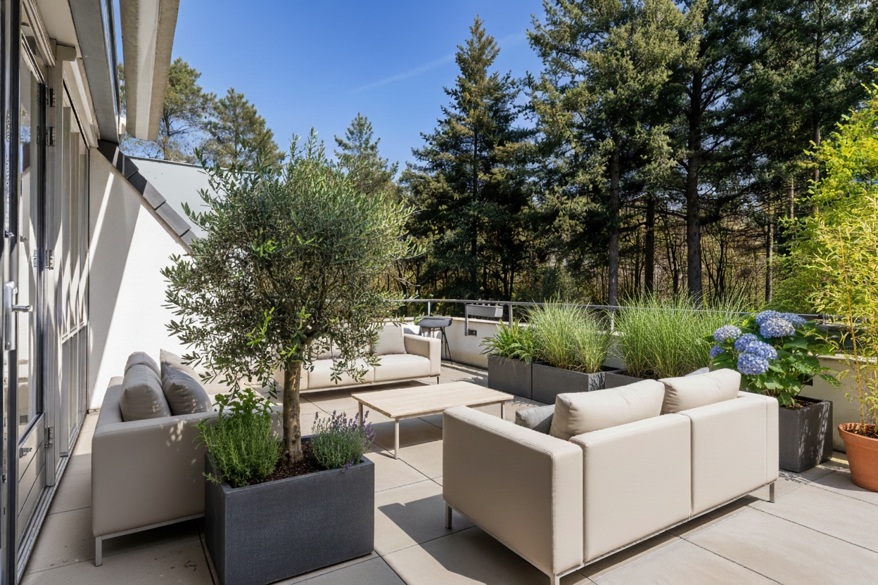 Through double French doors, you access the spacious south-facing roof terrace of 28 m². Here, you can enjoy the sun all day long and take in the magnificent views across the park. The terrace easily accommodates a large lounge set, dining table and even an outdoor kitchen if desired. An electrically operated awning with wind and rain sensors provides shade when needed.