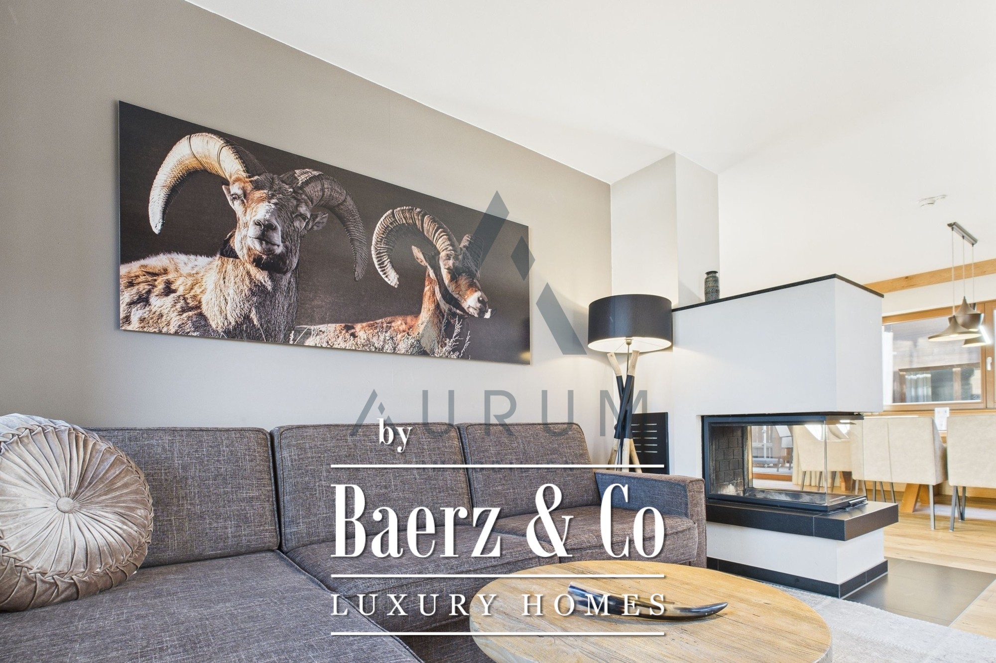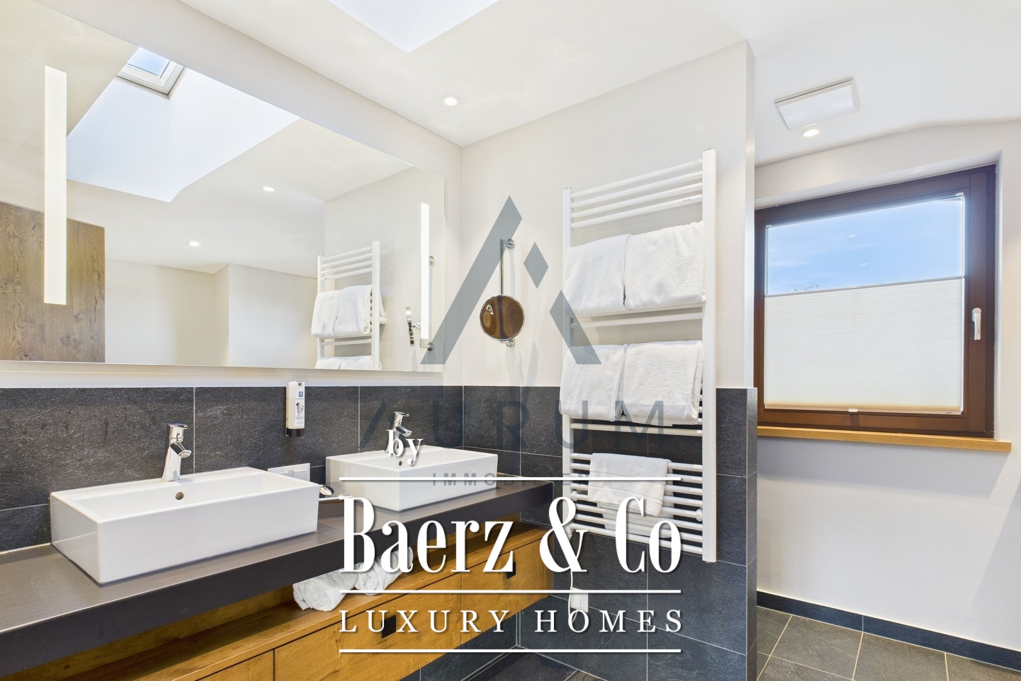 Upstairs, there are two further bedrooms, each with its own en-suite bathroom including shower, bathtub, and toilet. High-quality materials such as oak parquet flooring in the living areas and elegant porcelain stoneware in the bathrooms create a sophisticated yet cozy ambiance with alpine flair.