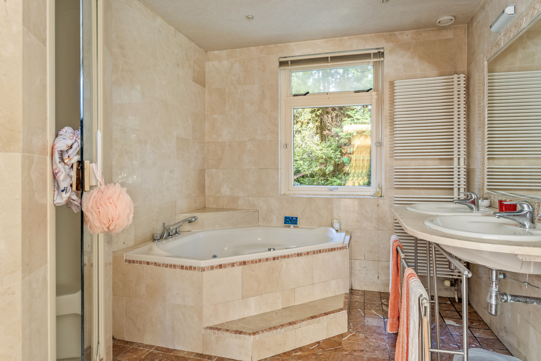 Covered entrance into a hallway with a striking double staircase and access to the guest toilet. From here, step into the L-shaped living and dining room with a cozy fireplace and classic mantel. The separate kitchen is fully equipped with built-in appliances, including a refrigerator, oven, microwave, dishwasher, and 4-zone induction hob with extractor. Three versatile rooms—currently used as bedrooms—are also accessible from the hall, two of which feature fitted wardrobes and en-suite bathrooms. Two of the bedrooms offer direct access to the beautifully landscaped rear garden, complete with a large partially covered terrace, lily pond, and lush greenery including rare and exotic plants.