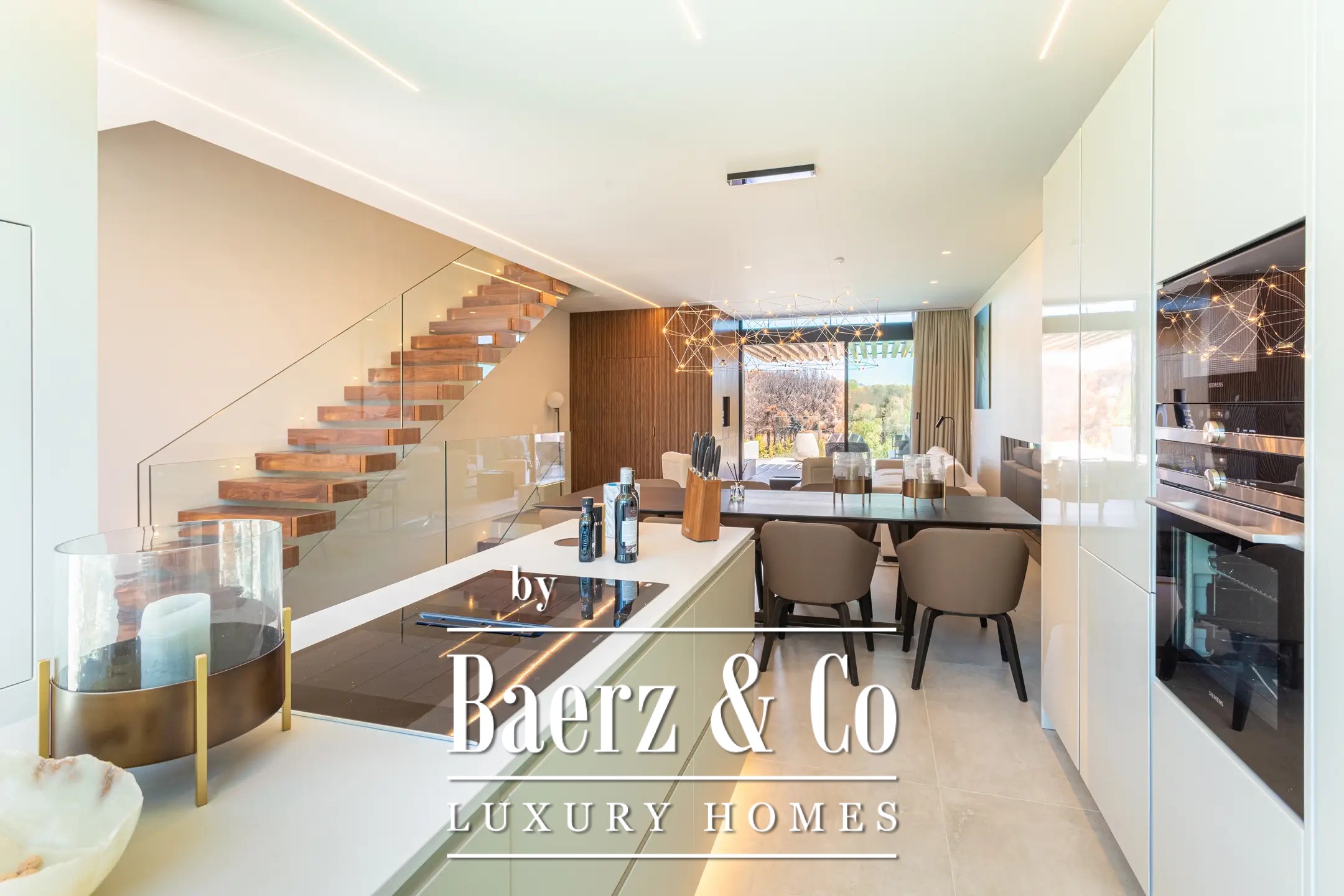 Villa Es Cubells with panoramic sea views defines a new standard of understated luxury in one of Ibiza’s most coveted enclaves. This villa in Es Cubells spans an impressive 620 m², resting across a private 25,800 m² plot. Each space has been consciously designed on a single level, creating intuitive flow between the expansive living area and the American kitchen. Five bedrooms, all with en suite bathrooms, open through wide sliding doors to the terraces, drawing natural light deep into every room. The landscape—sea and sky framed by floor-to-ceiling windows—offers a serene backdrop for daily life.