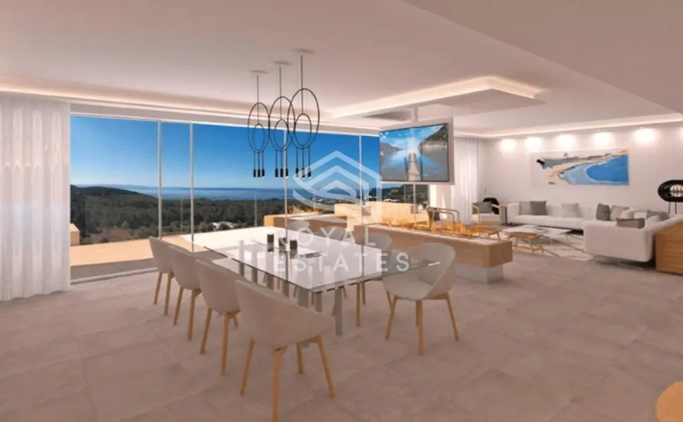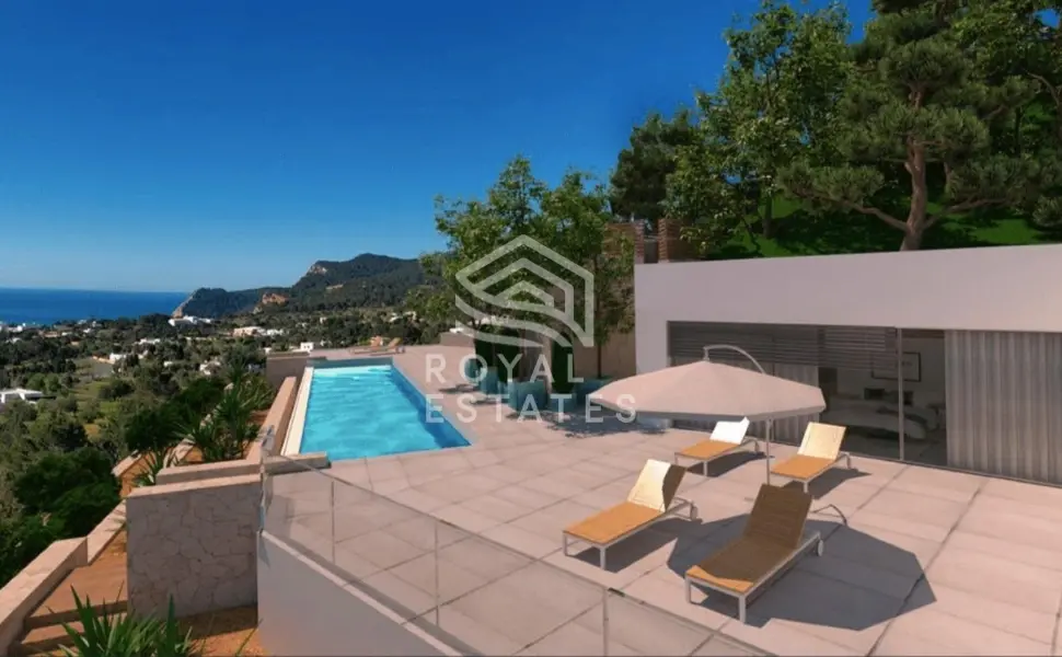 A 22 by 5 meter pool anchors the outdoor experience, while generous garden and terrace zones offer seamless transitions between interior and exterior. The substantial basement invites a gym, spa, or cinema, attuned to personal pursuits. This villa for sale in Es Cubells stands at the threshold of completion, its calm geometry and connection to the surrounding vistas promising balance and privacy in equal measure. The elevated location ensures absolute tranquility, inviting reflection and shared celebration, just moments from the island’s iconic coastline.
