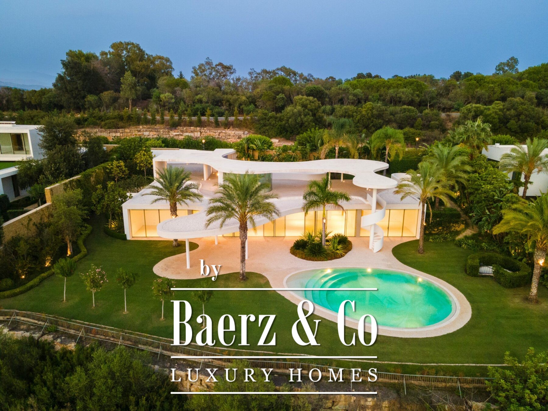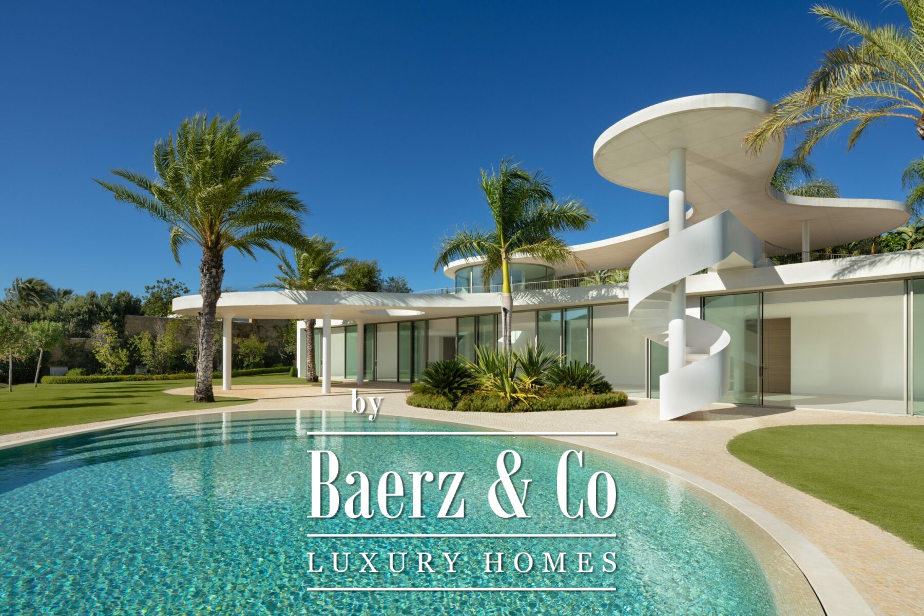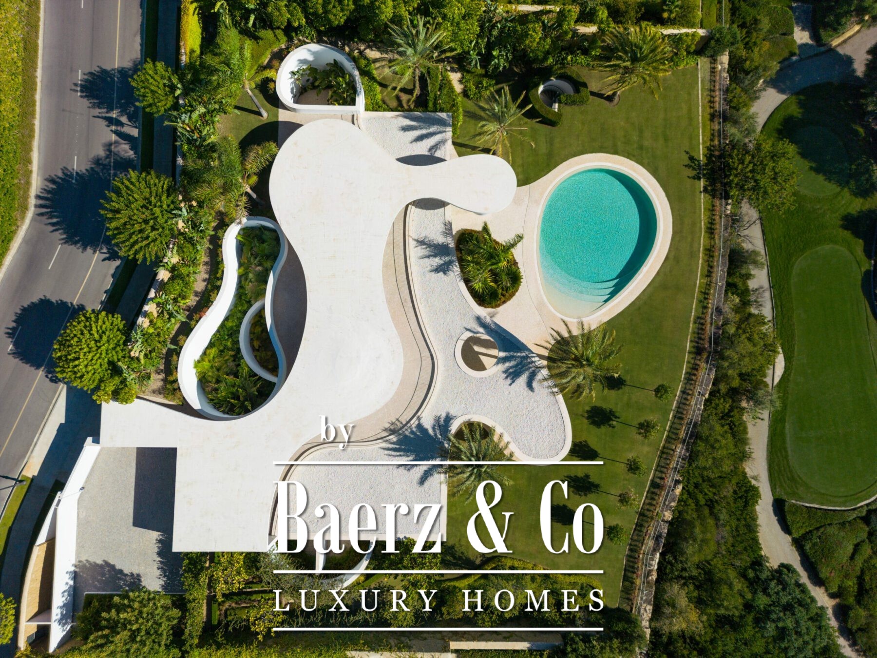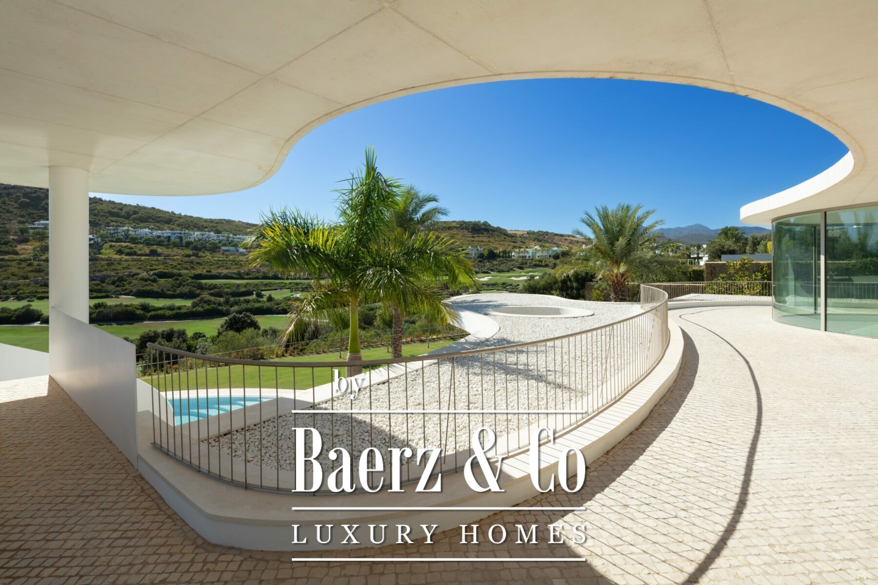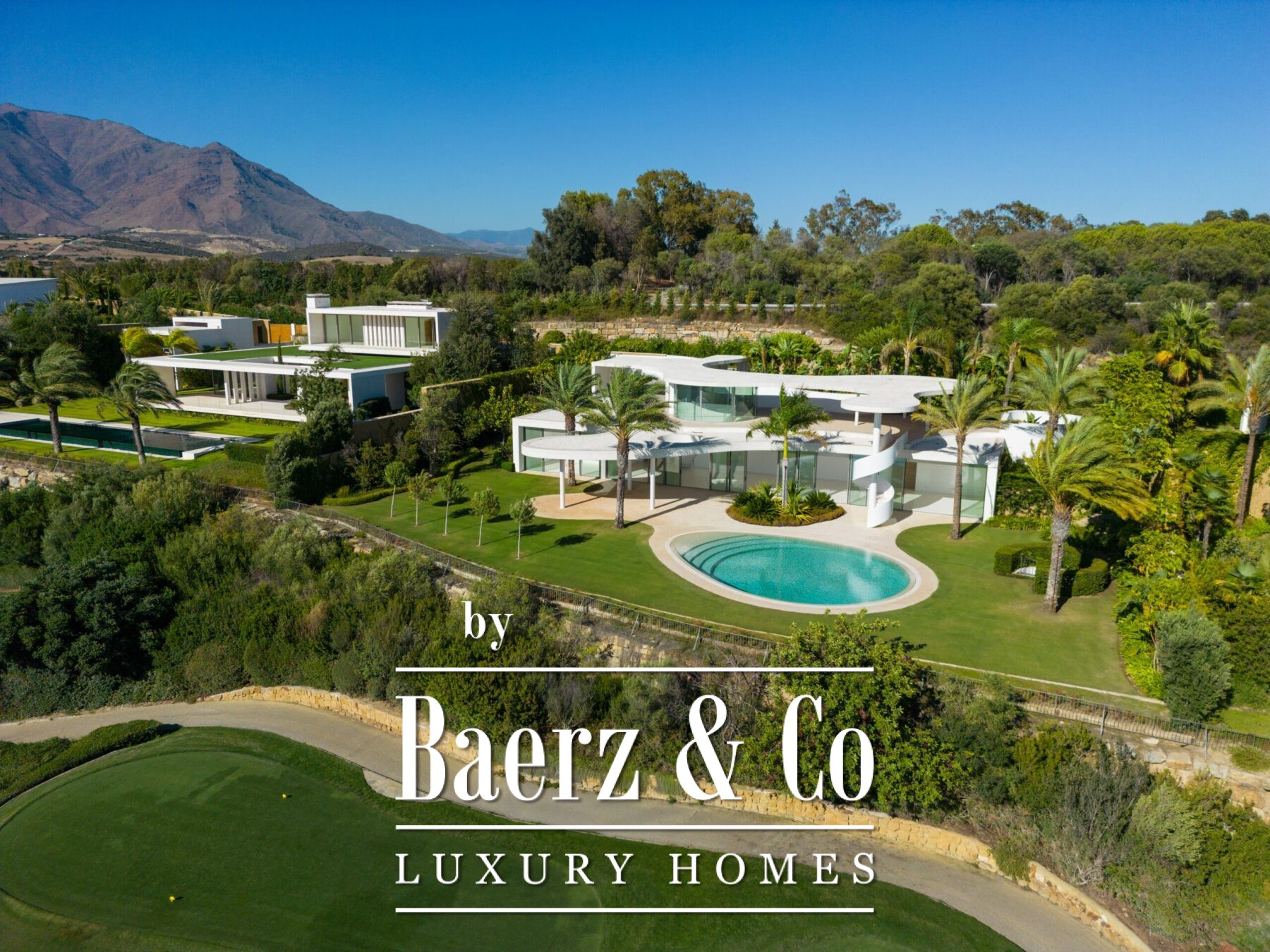 kitchen, generous living and dining areas and four stunning bedrooms, each offering their own unique charm. With an abundance of windows and glass sliding doors, natural light floods the interior, seamlessly connecting it to the outdoors. The villa boasts a captivating garden, highlighted by an egg-shaped pool adorned with tranquil light blue tiles. Towering palm trees grace the landscape, while the verdant grass provides ample space for leisure and social gatherings. The terrace tiles, specially chosen for this property, add yet another bespoke touch to the villa’s distinctive character. Offering an unparalleled architectural masterpiece, this exceptional villa promises an extraordinary personal retreat, complemented by breath taking views and an enviable location within the esteemed word famous golf resort.