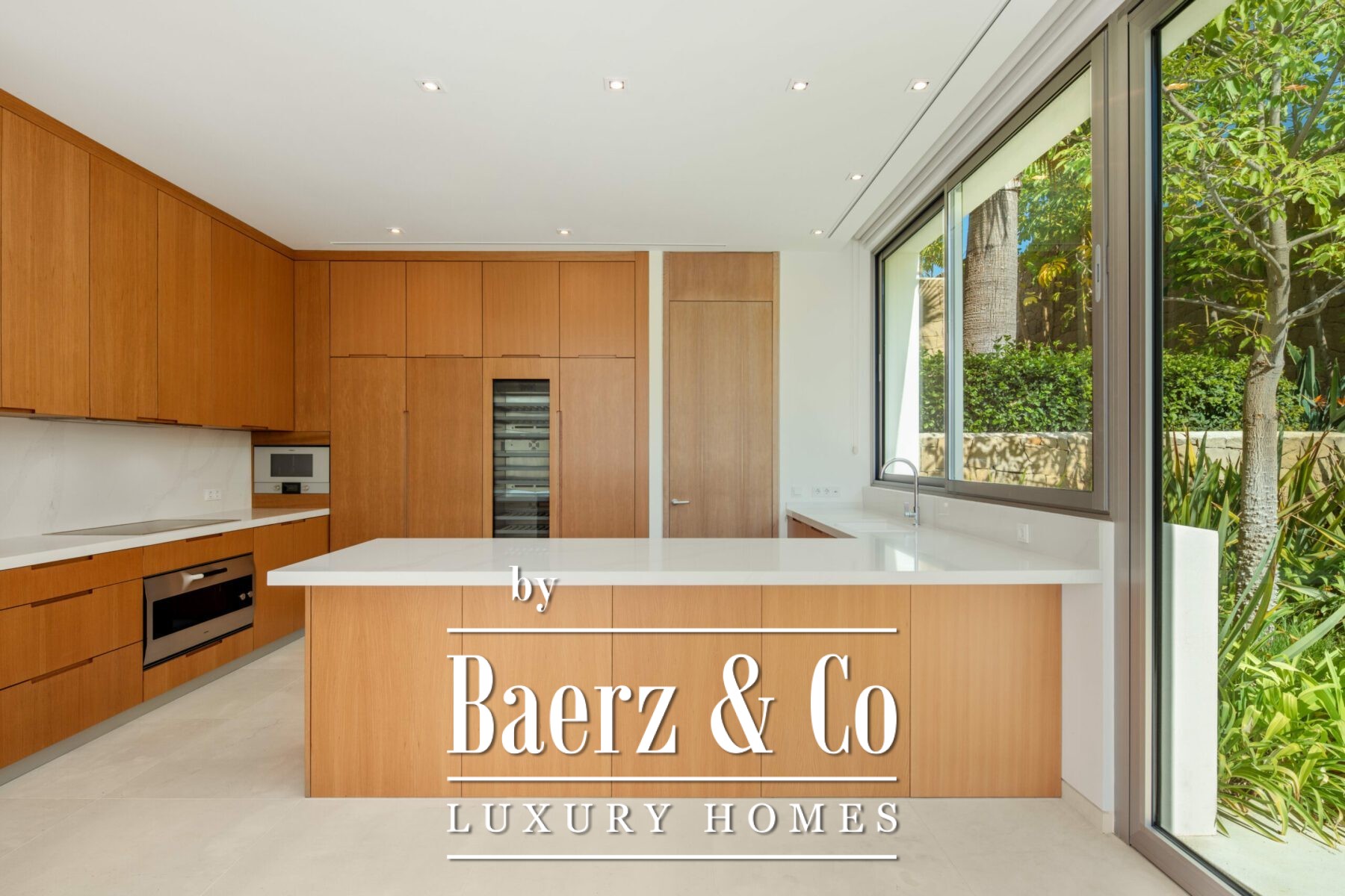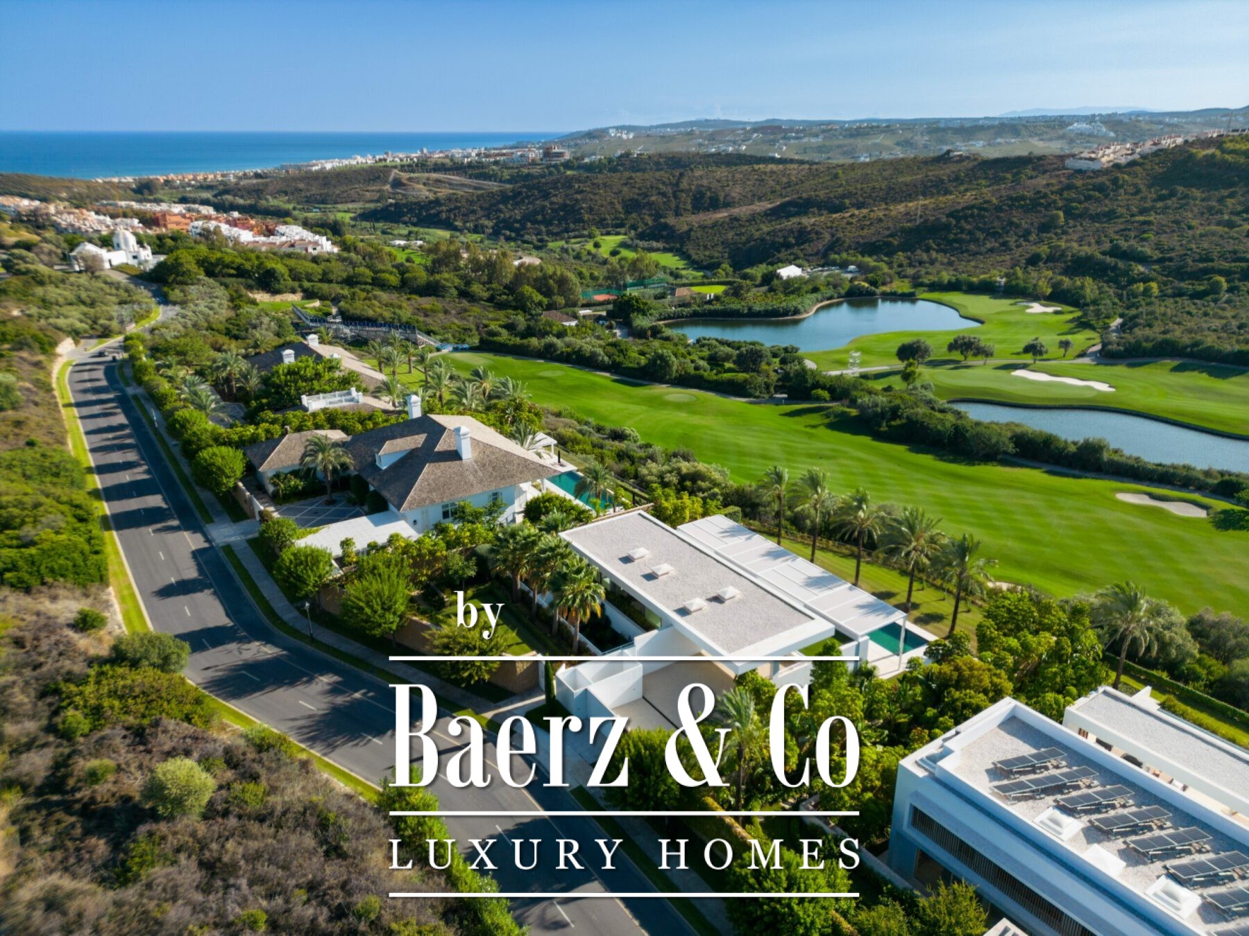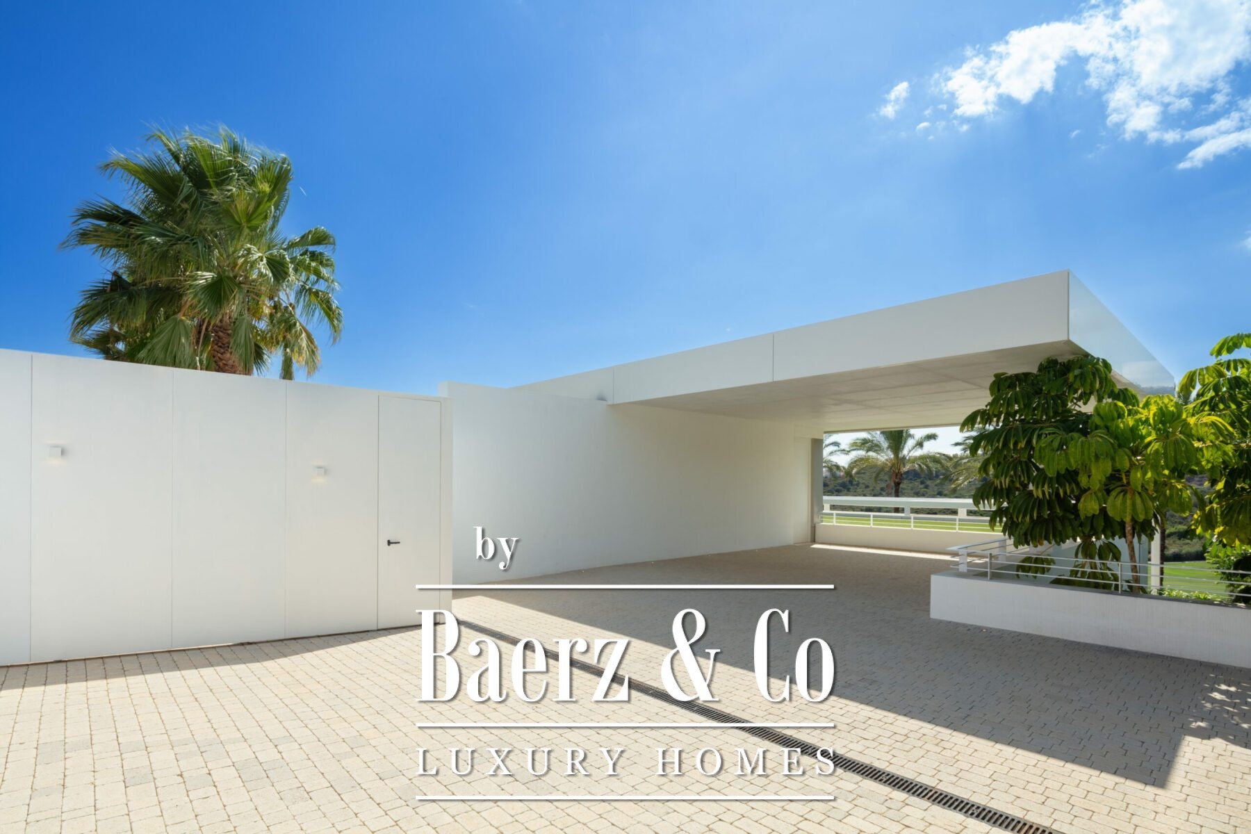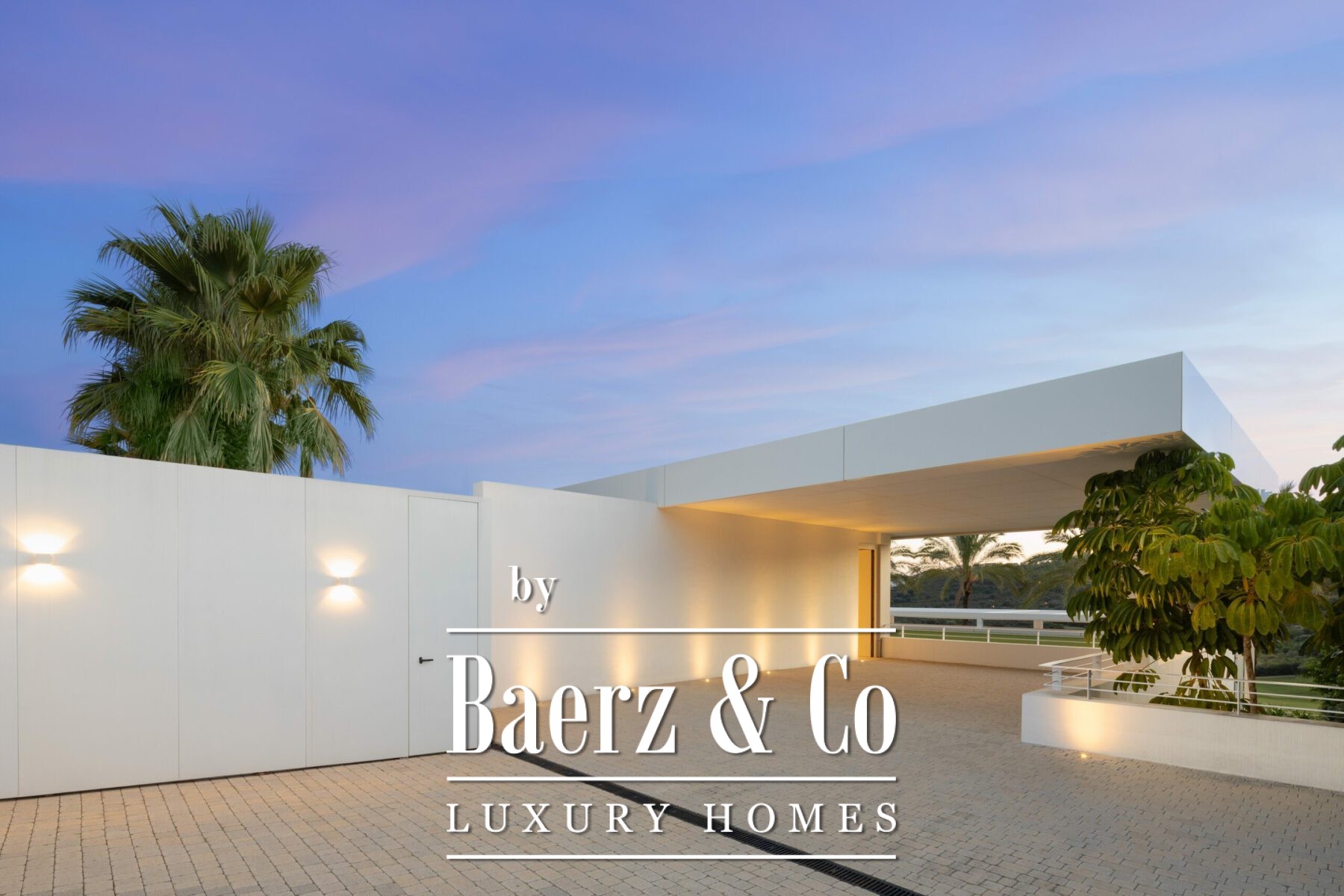 backdrop for relaxation. The interiors exude refinement, with every detail meticulously curated using the finest materials, ensuring an unparalleled sense of luxury. The stunning kitchen, equipped with state-of-the-art Gaggenau appliances, is a culinary haven that seamlessly combines practicality with aesthetics. Distributed across 2 floors, most bedrooms are located on the ground level of the property, with striking views across the golf course. The luxurious master bedroom is on the top level of the property, boasting a private oasis for residents to enjoy. The property’s landscaping is a work of art, with a captivating hidden pond gracing the entrance, adorned with lush greenery that evokes a soothing ambiance, fostering a profound connection with nature. An architectural masterpiece, this property enjoys a privileged frontline golf position in one of Spain’s most exclusive resorts.