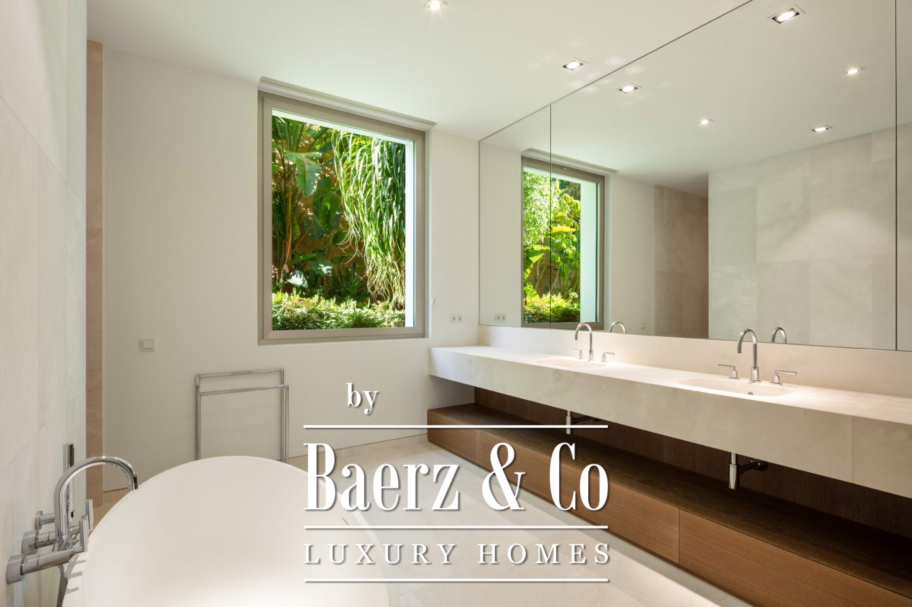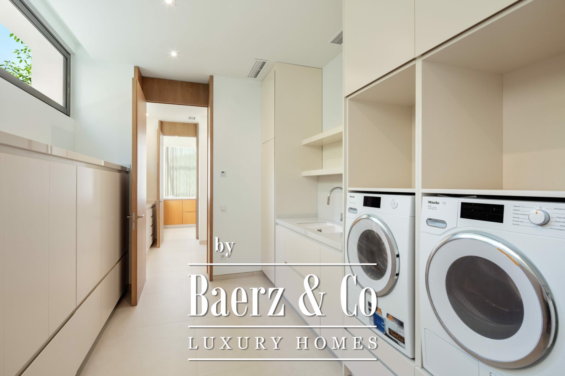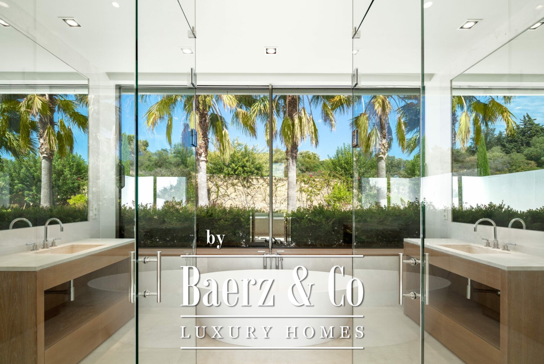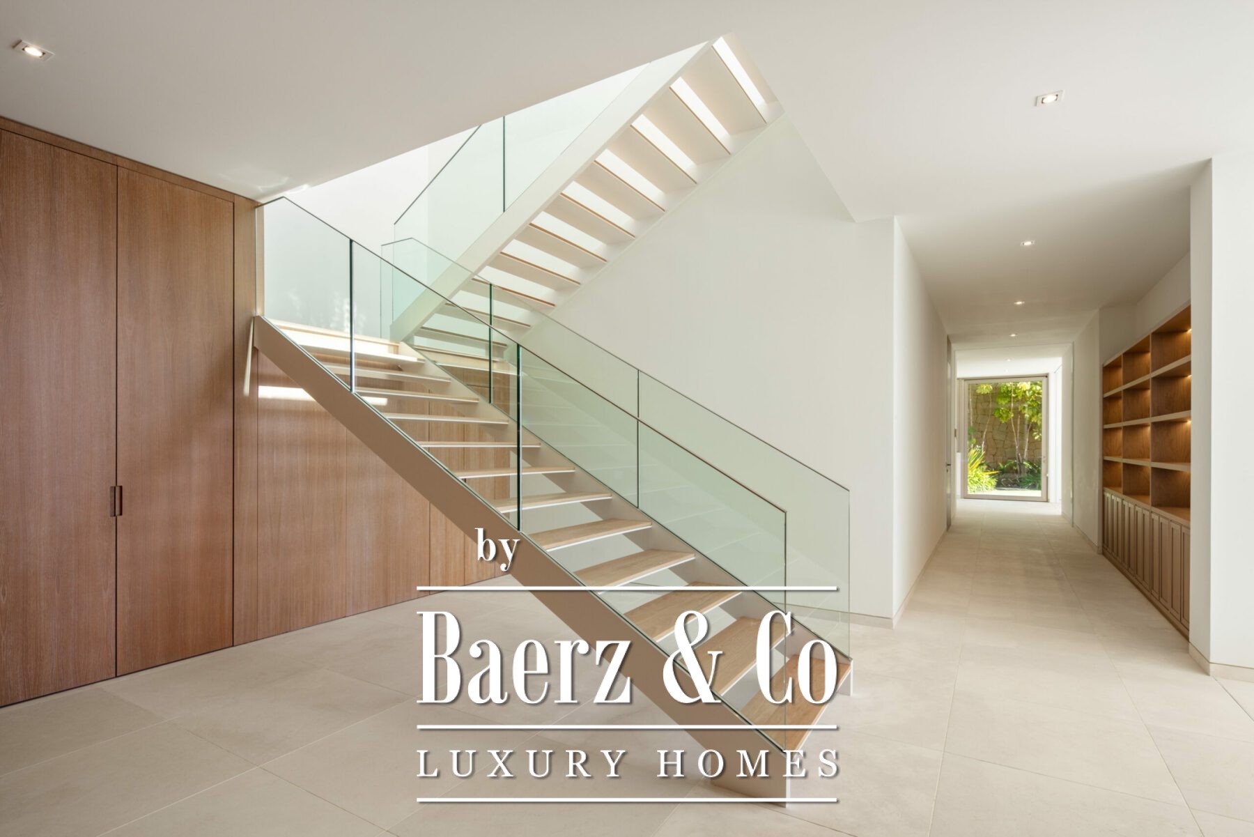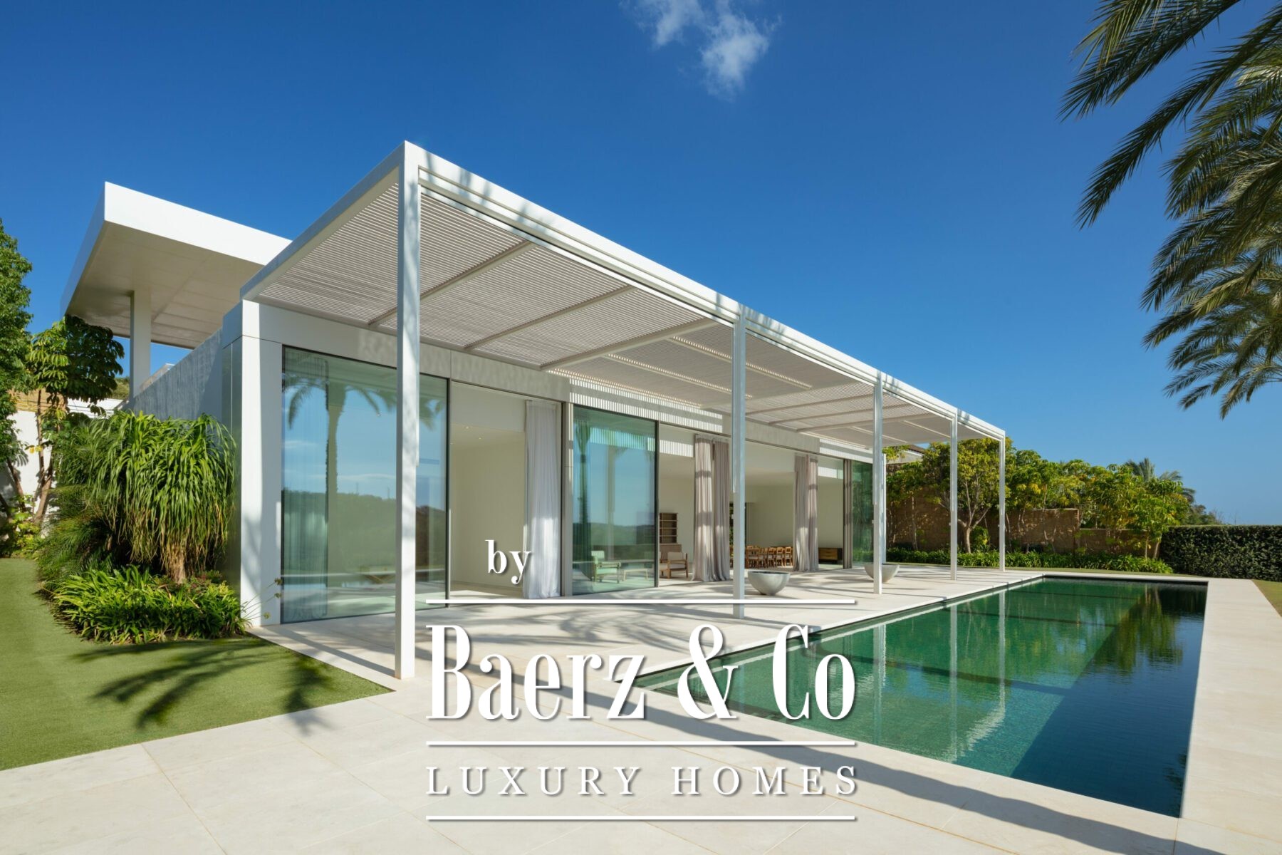 backdrop for relaxation. The interiors exude refinement, with every detail meticulously curated using the finest materials, ensuring an unparalleled sense of luxury. The stunning kitchen, equipped with state-of-the-art Gaggenau appliances, is a culinary haven that seamlessly combines practicality with aesthetics. Distributed across 2 floors, most bedrooms are located on the ground level of the property, with striking views across the golf course. The luxurious master bedroom is on the top level of the property, boasting a private oasis for residents to enjoy. The property’s landscaping is a work of art, with a captivating hidden pond gracing the entrance, adorned with lush greenery that evokes a soothing ambiance, fostering a profound connection with nature. An architectural masterpiece, this property enjoys a privileged frontline golf position in one of Spain’s most exclusive resorts.