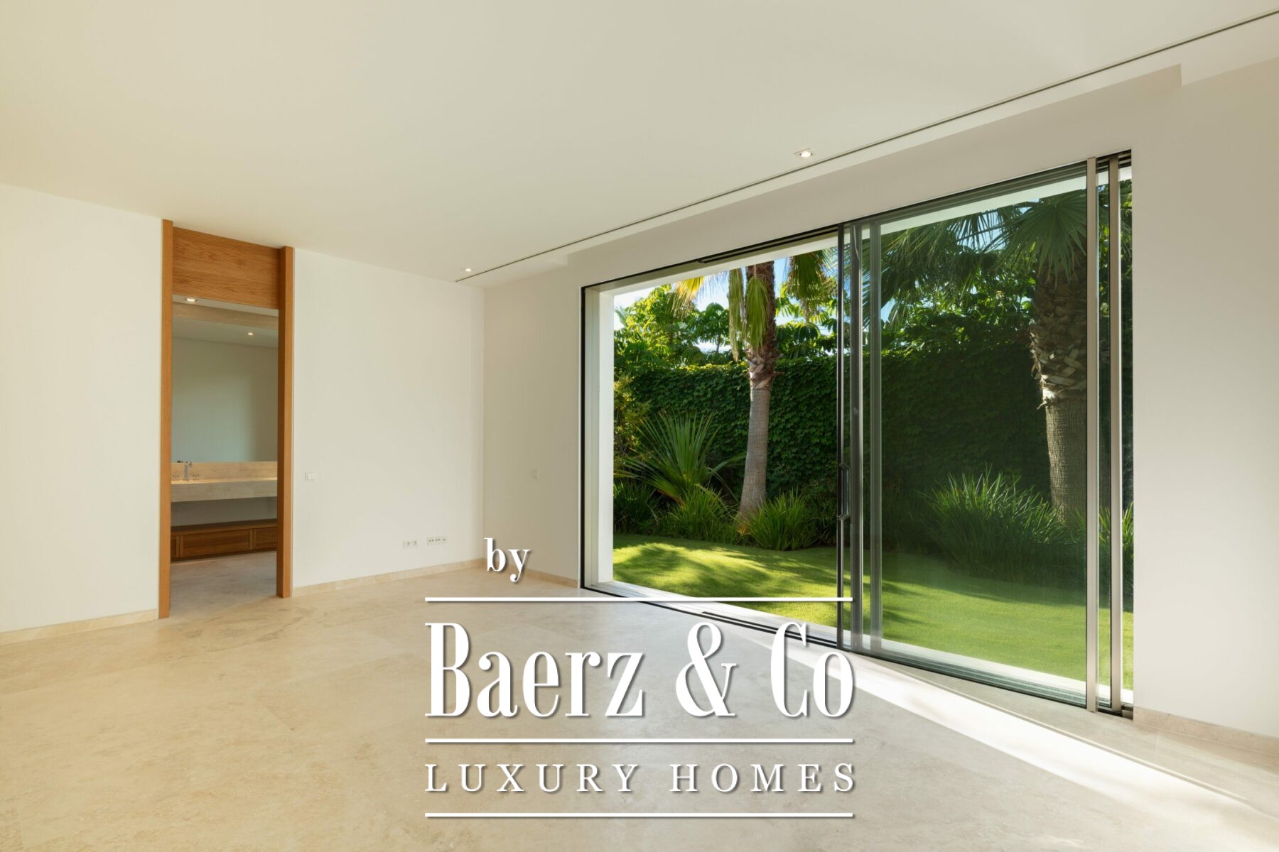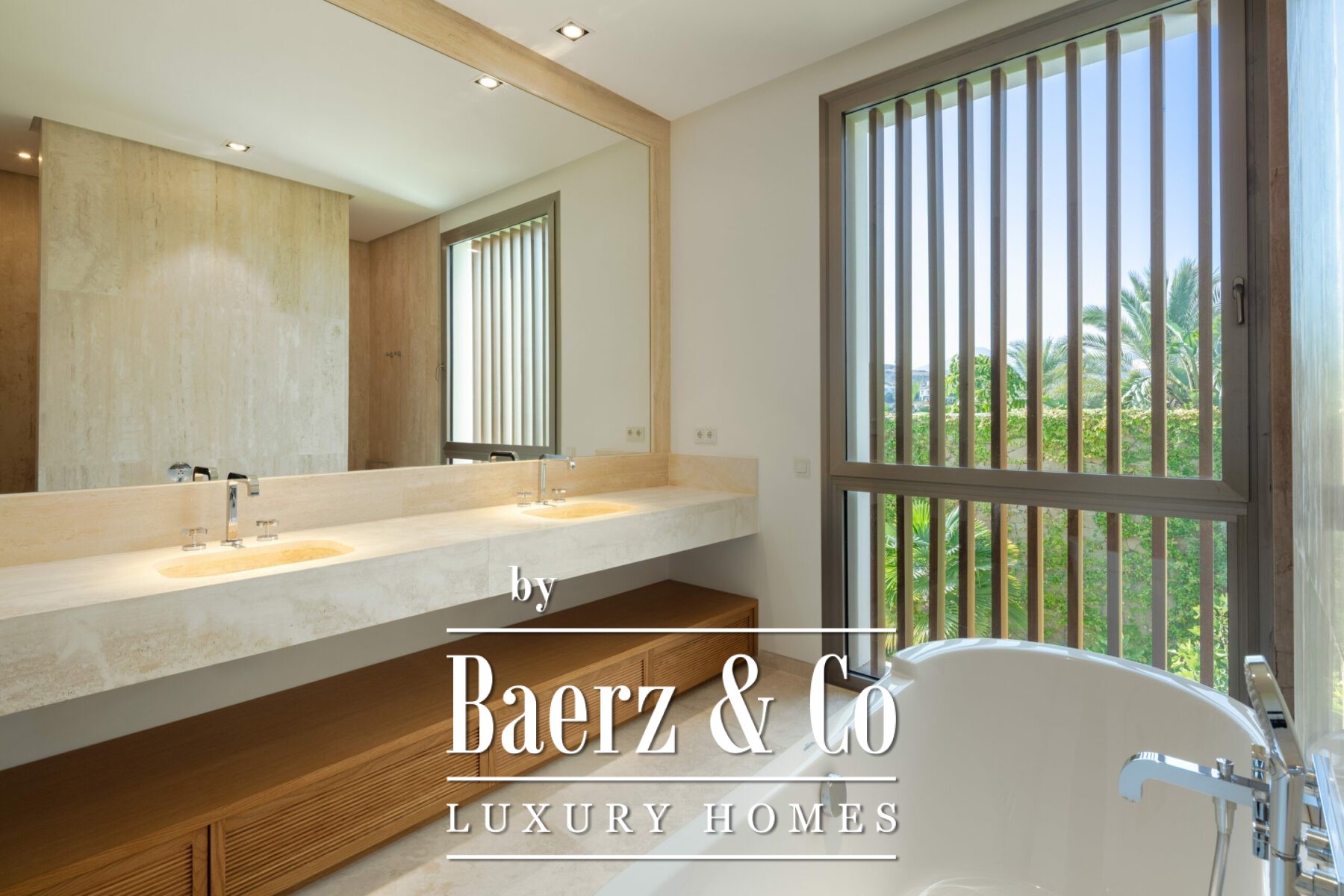 This exquisite villa, nestled beside the golf course, presents an extraordinary opportunity for residents to immerse themselves in the lavish Mediterranean lifestyle. Poised within the famous golf resort, this residence affords sweeping vistas of the lush fairways and the Mediterranean Sea. The architectural brilliance shines through, lending the home a modern allure that epitomises luxury. Set upon an expansive plot, the villa welcomes guests with a captivating entrance adorned with a picturesque lake and meticulously landscaped gardens. Spanning two levels, the four bedrooms are located on the upper floor, while an additional fifth bedroom is conveniently located on the ground level. Inside, the interiors exude elegance with their soft neutral tones and tasteful wooden accents, creating