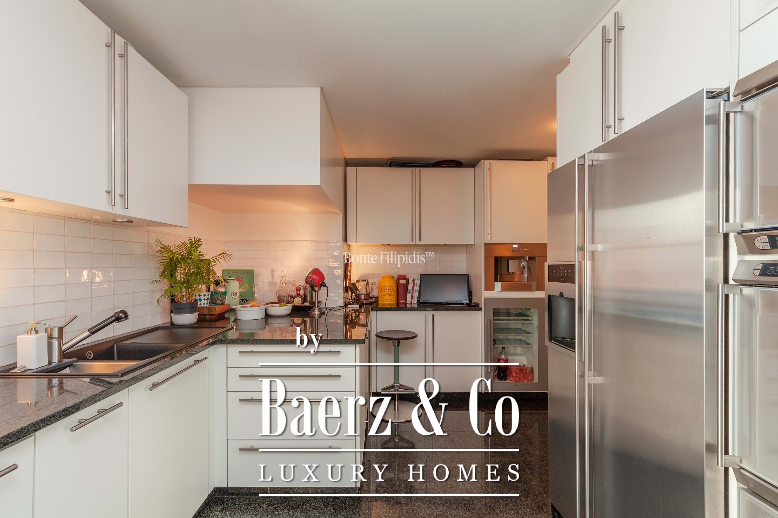 The lower floor features an impressive 44,5 sqm living room with double height ceiling and a fireplace that leads into a 28 sqm dining room with small terrace, as well as a 16 sqm fully equipped kitchen.