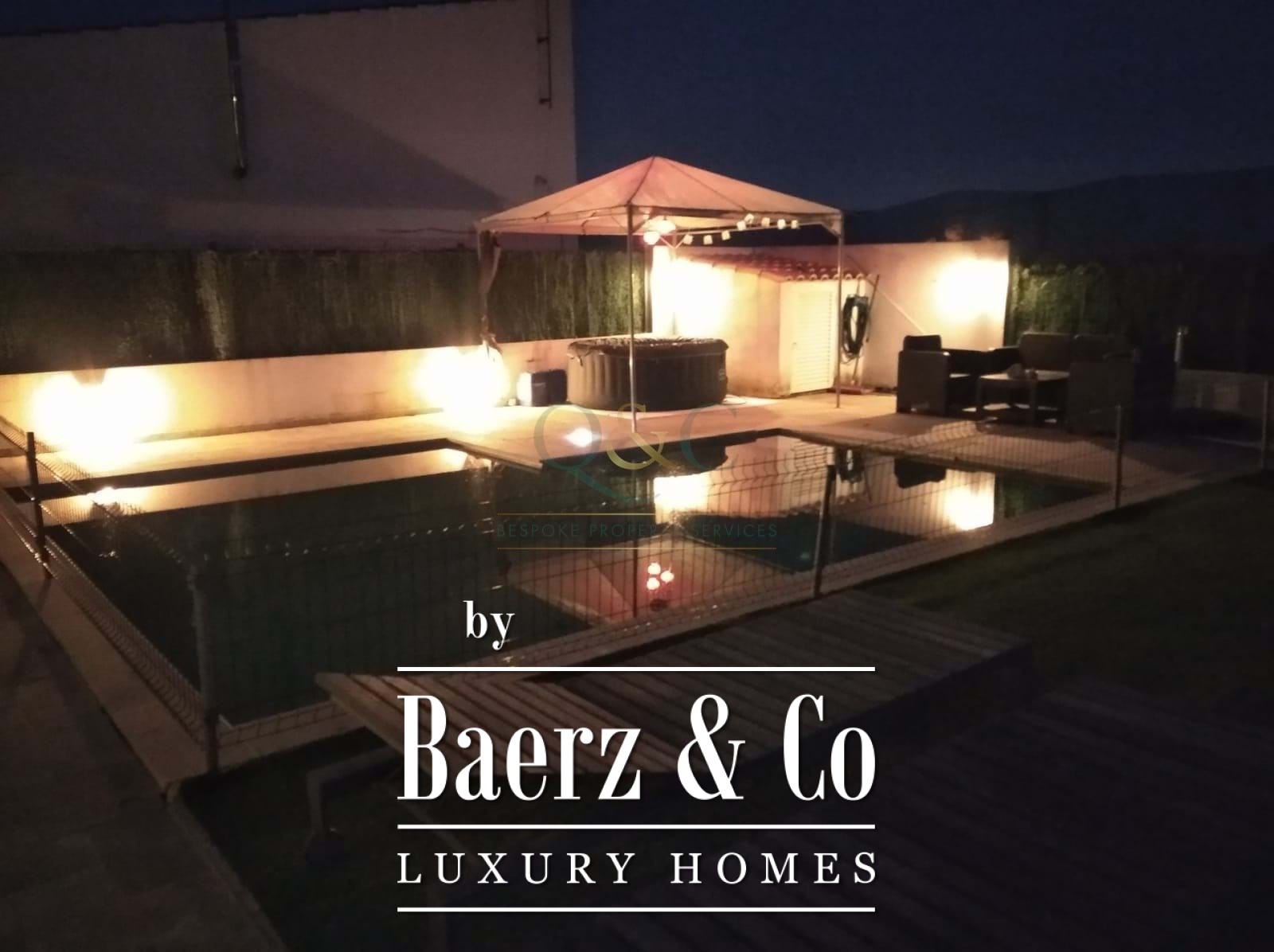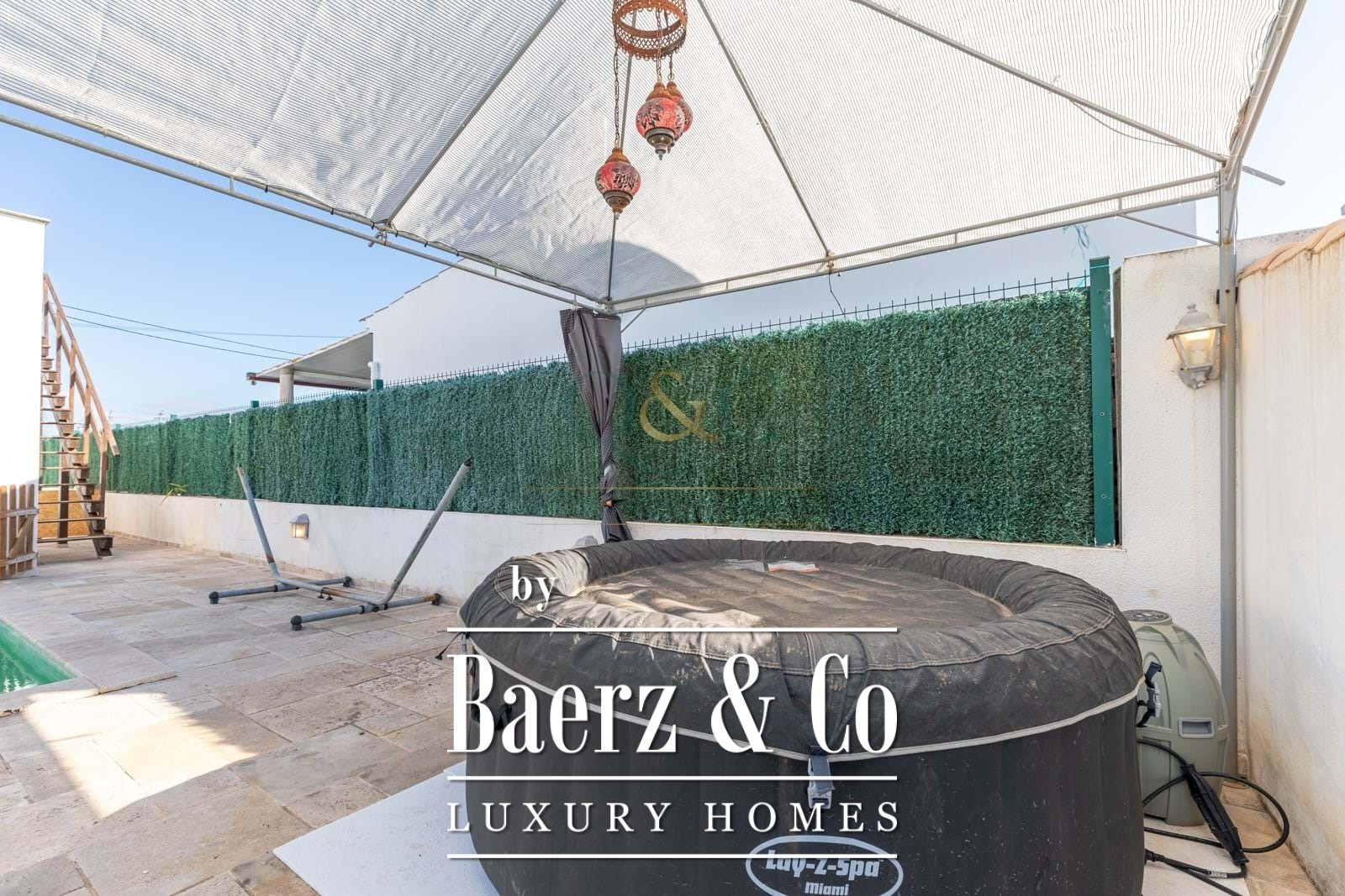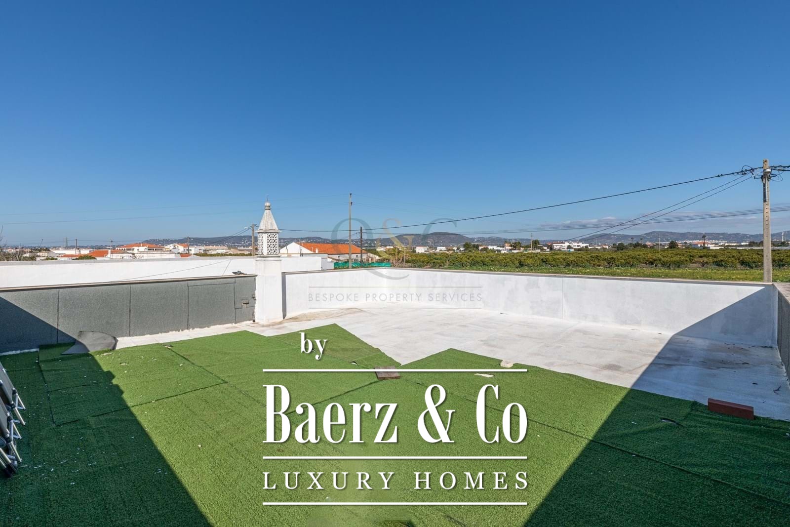 The garden is fully enclosed with double gates leading to secure off-road parking with space for 2 cars. The L-shaped pool with swimming pool with surrounding terracing, pergola & hot tub offers a great area to relax and entertain: the astroturf lawn is set off by well-planted surrounding flower beds. Stairs from the garden also lead to a spacious roof terrace with both views across the countryside and to Faro: The solar hot water and air conditioning units for the property are located also on this roof area.
