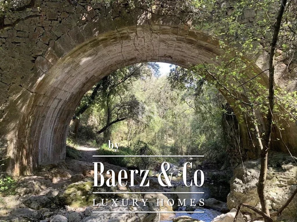 The estate unfolds across pristine woodlands with lush Mediterranean vegetation, where a river meanders through natural waterfalls and crystal-clear pools—an idyllic sanctuary of serenity and leisure.