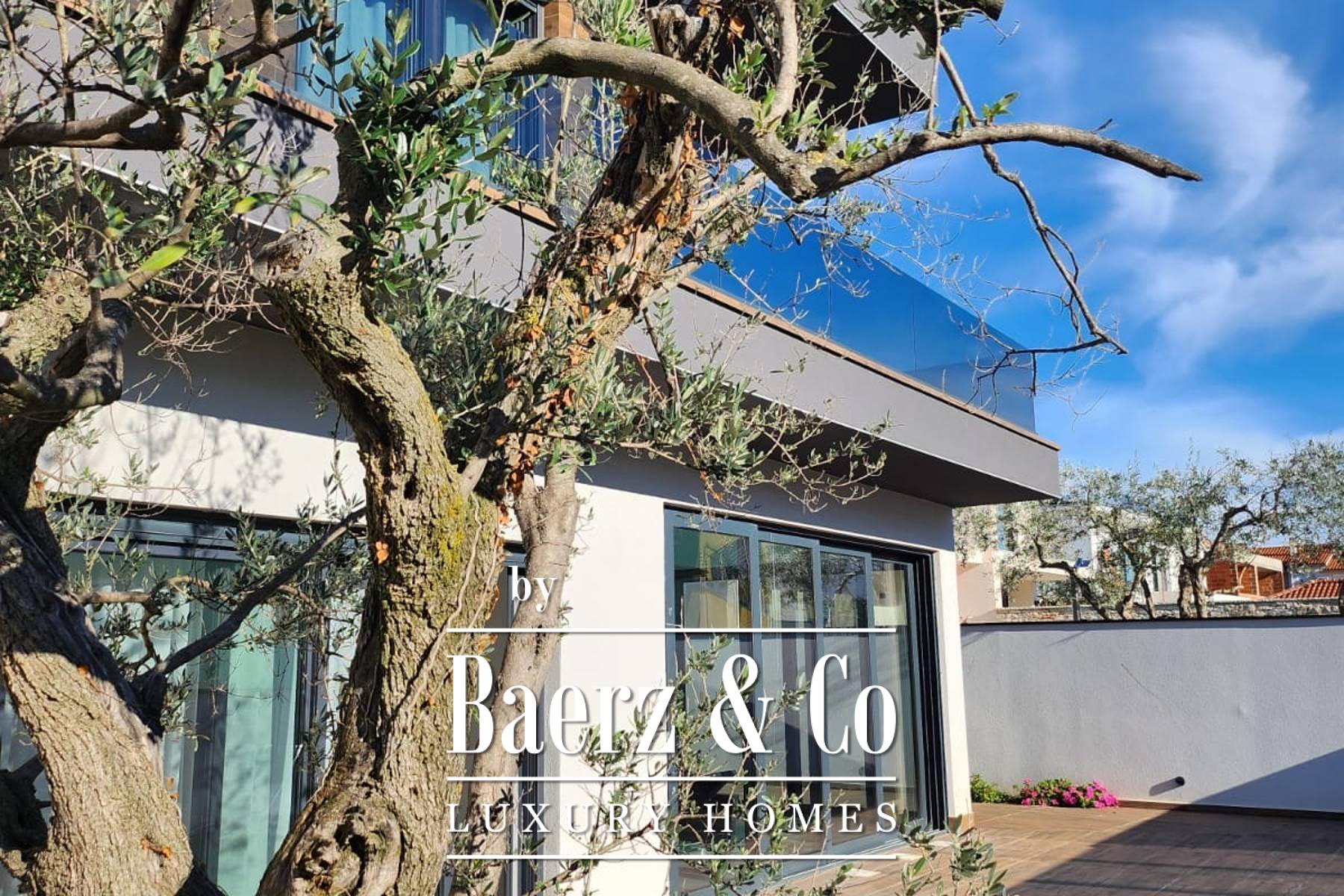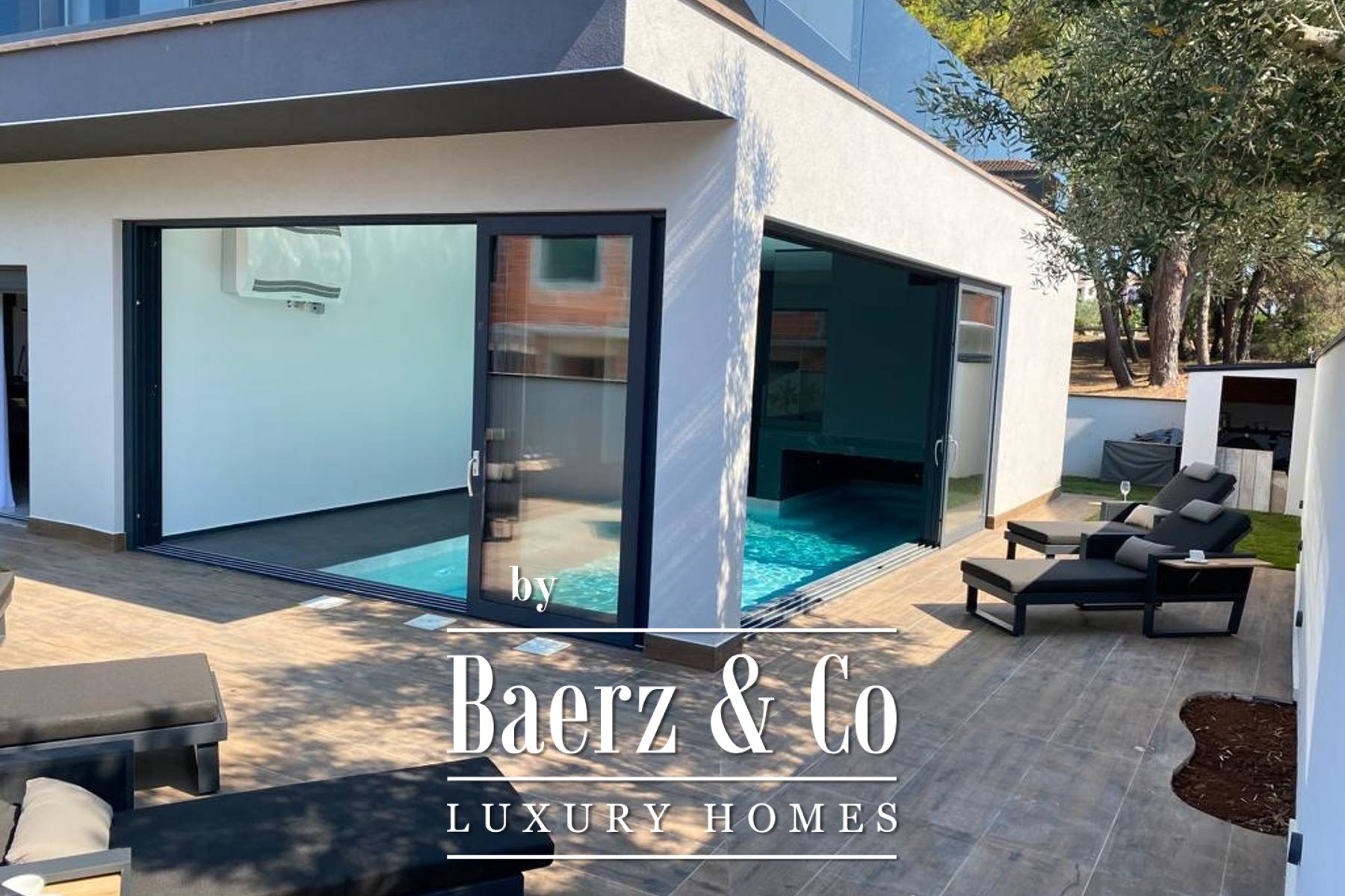 For sale is a beautiful, modern, high-quality villa in Fažana, located in a side street surrounded by greenery. The villa in Fažana is located on a 452 m2 plot, concept and ground floor plus floor, surface area 280 m2, and consists of: - on the ground floor: entrance hall, a room with a bathroom that is designed to be a room for entertainment and socializing, but can be made into a bedroom, open space living room with kitchen and dining room and exit to the terrace. The living room leads to the glazed SPA zone of the house, where there is a 27 m2 indoor pool with a jacuzzi, a sauna and a shower. In the summer months, the glass walls can be opened. - upstairs: hallway and four bedrooms, each with its own bathroom, two of which have access