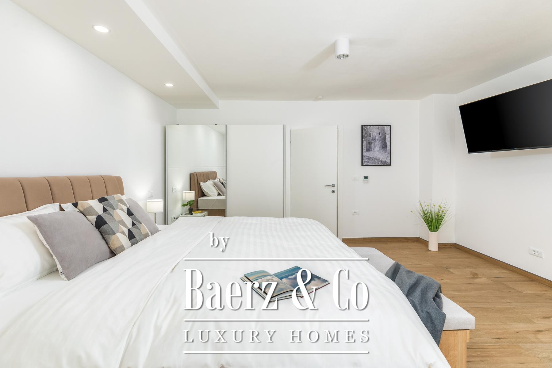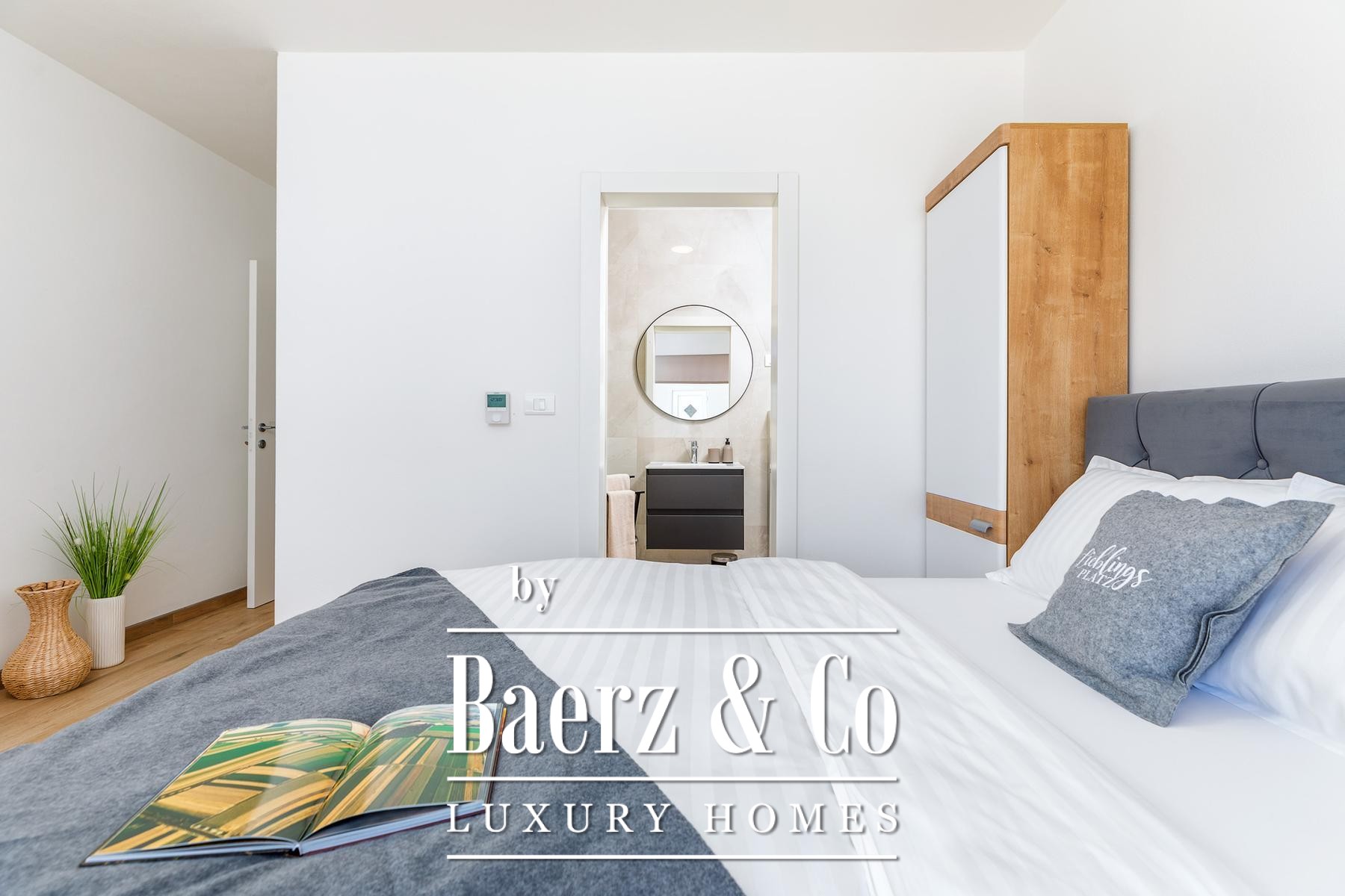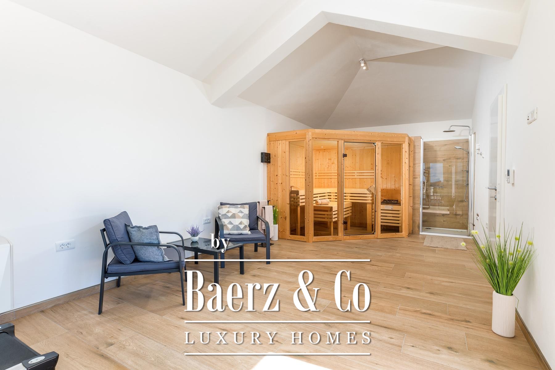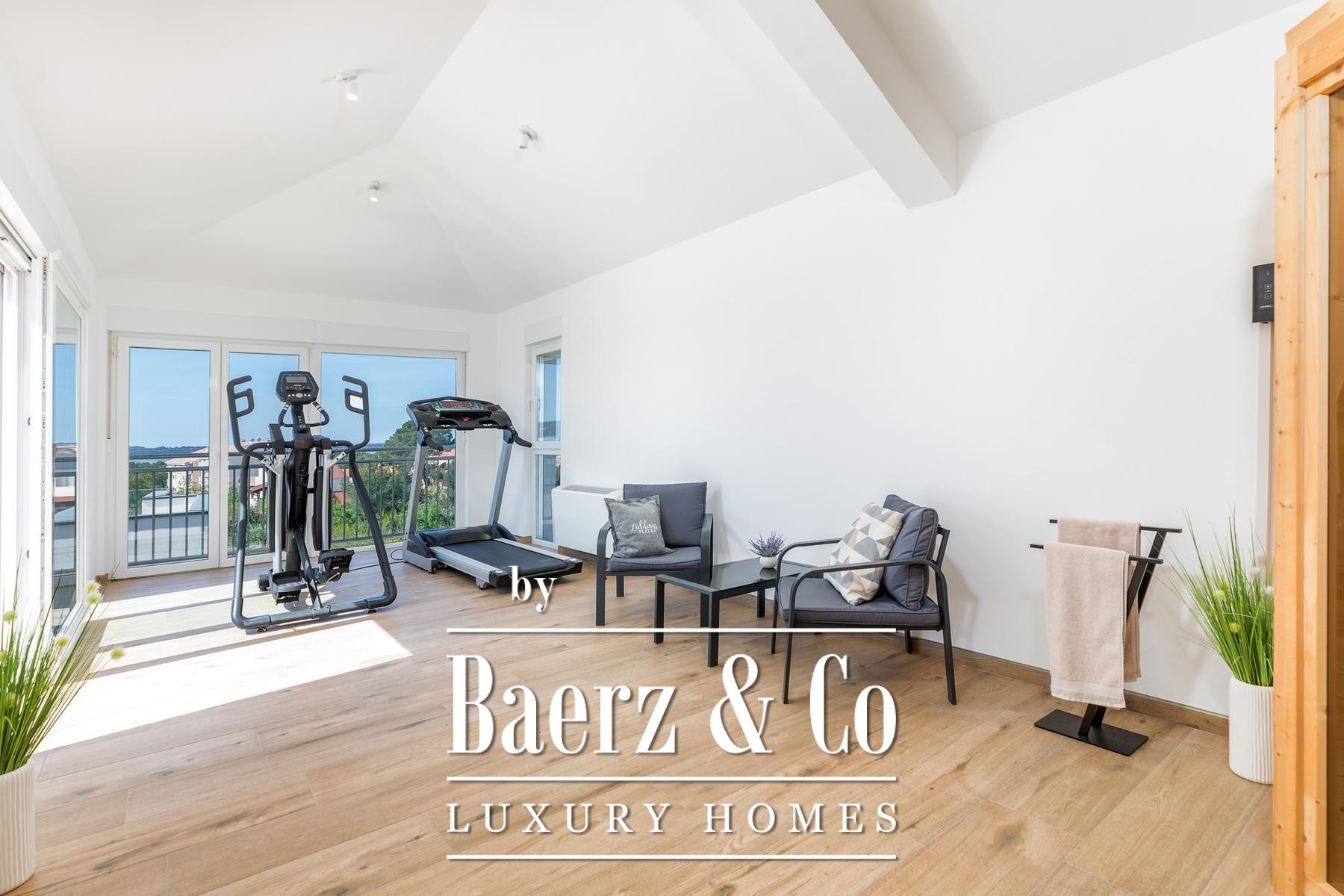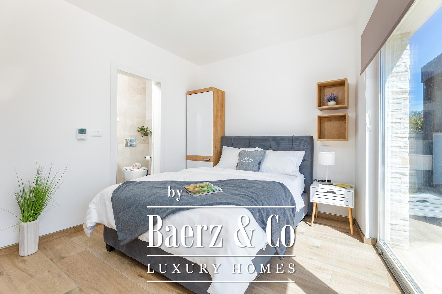 The top floor hosts an additional bedroom with access to a 40 m² terrace that offers sweeping views of the Brijuni archipelago. This level also includes a dedicated gym area and sauna, maintaining the villa’s refined focus on wellbeing. With five bedrooms and five bathrooms, solar panels, underfloor heating, and a heat pump system, the villa unites efficiency and comfort.