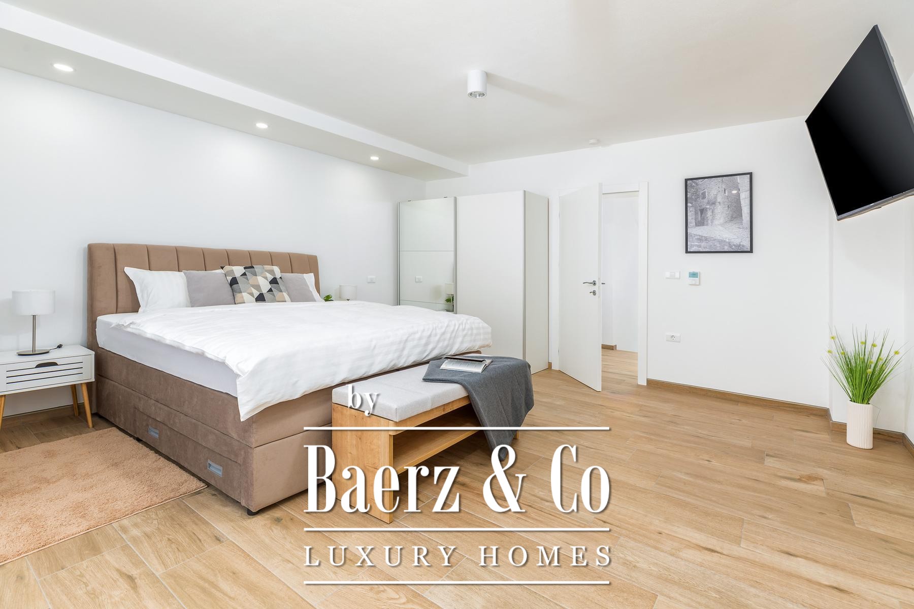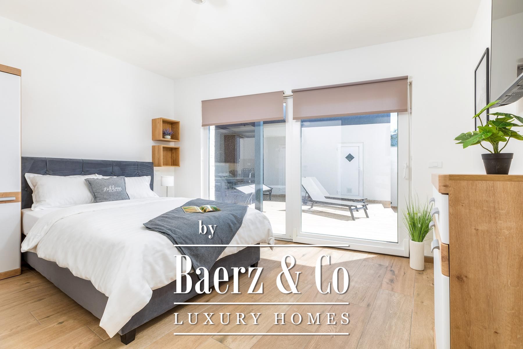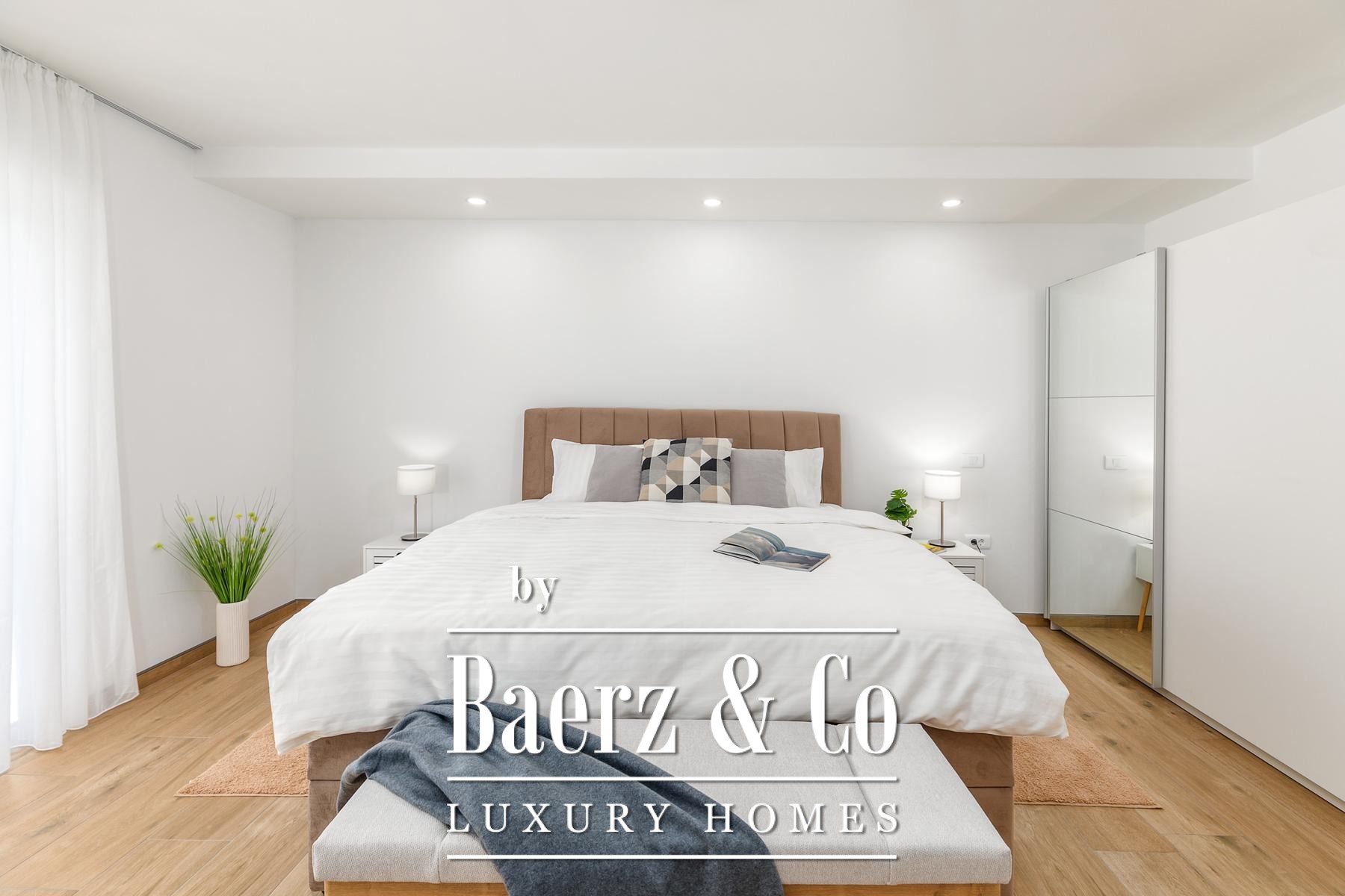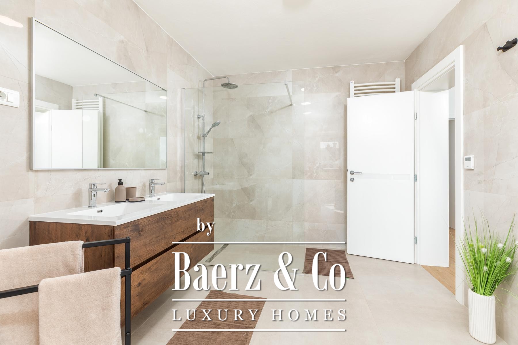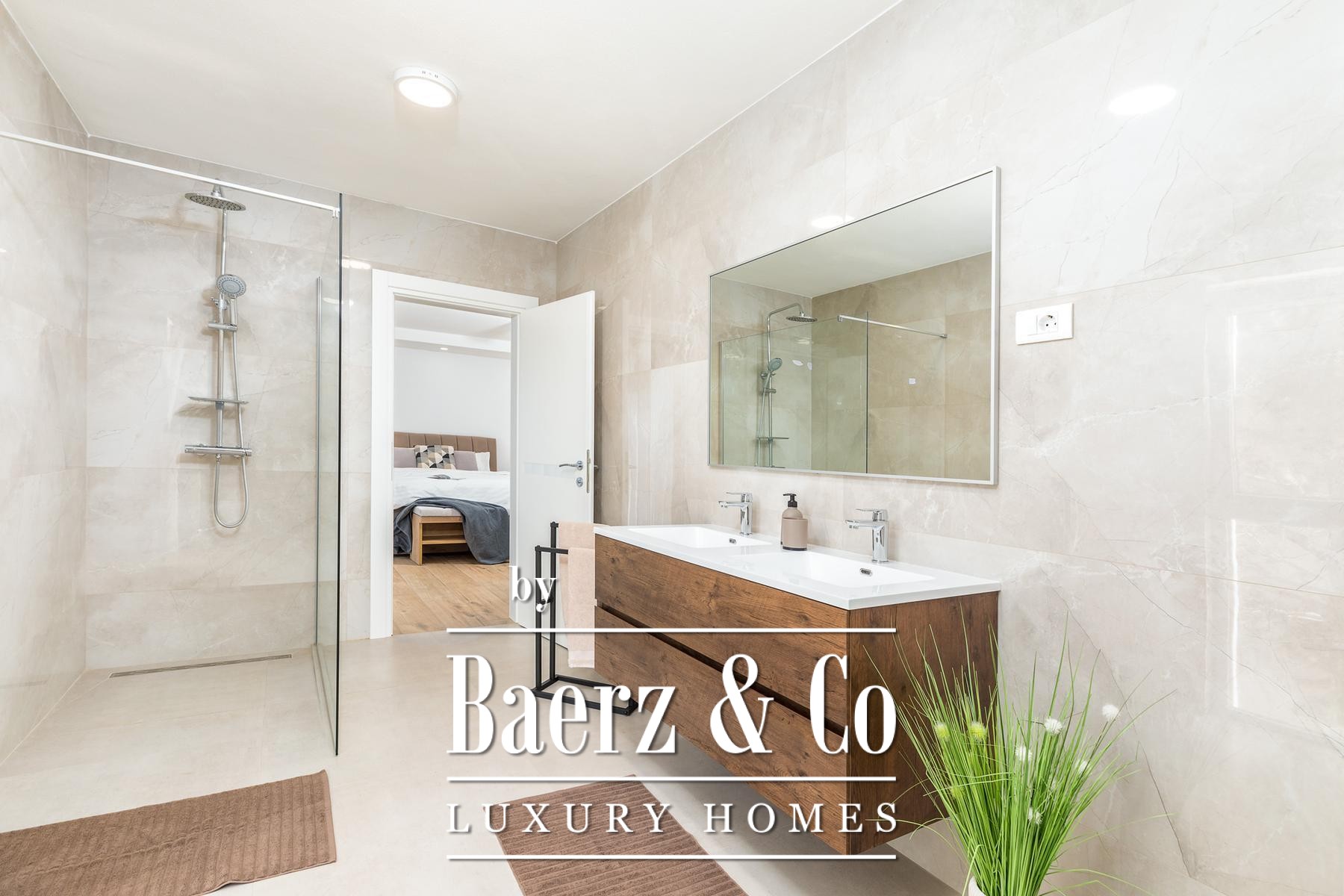 The top floor hosts an additional bedroom with access to a 40 m² terrace that offers sweeping views of the Brijuni archipelago. This level also includes a dedicated gym area and sauna, maintaining the villa’s refined focus on wellbeing. With five bedrooms and five bathrooms, solar panels, underfloor heating, and a heat pump system, the villa unites efficiency and comfort.