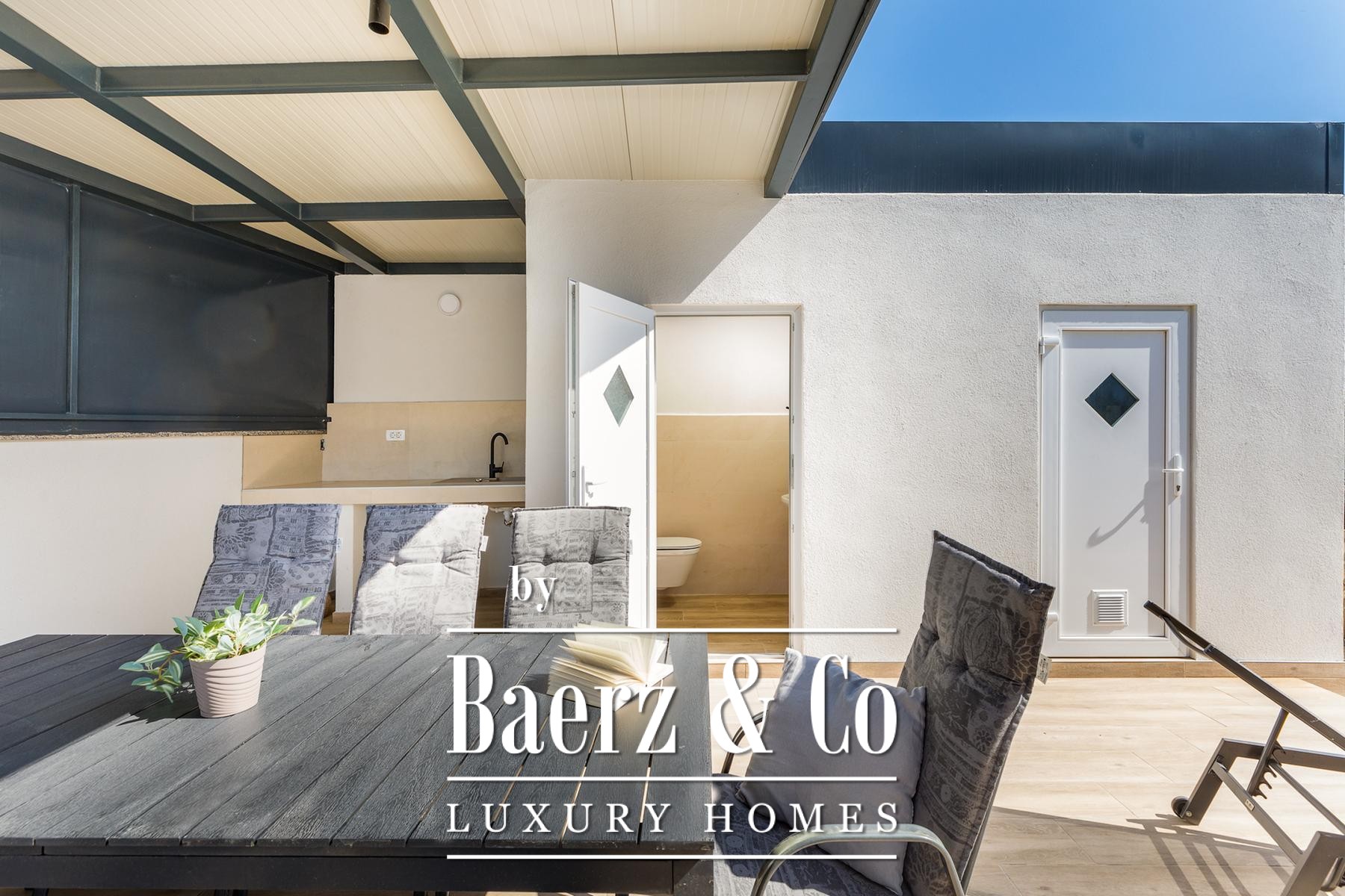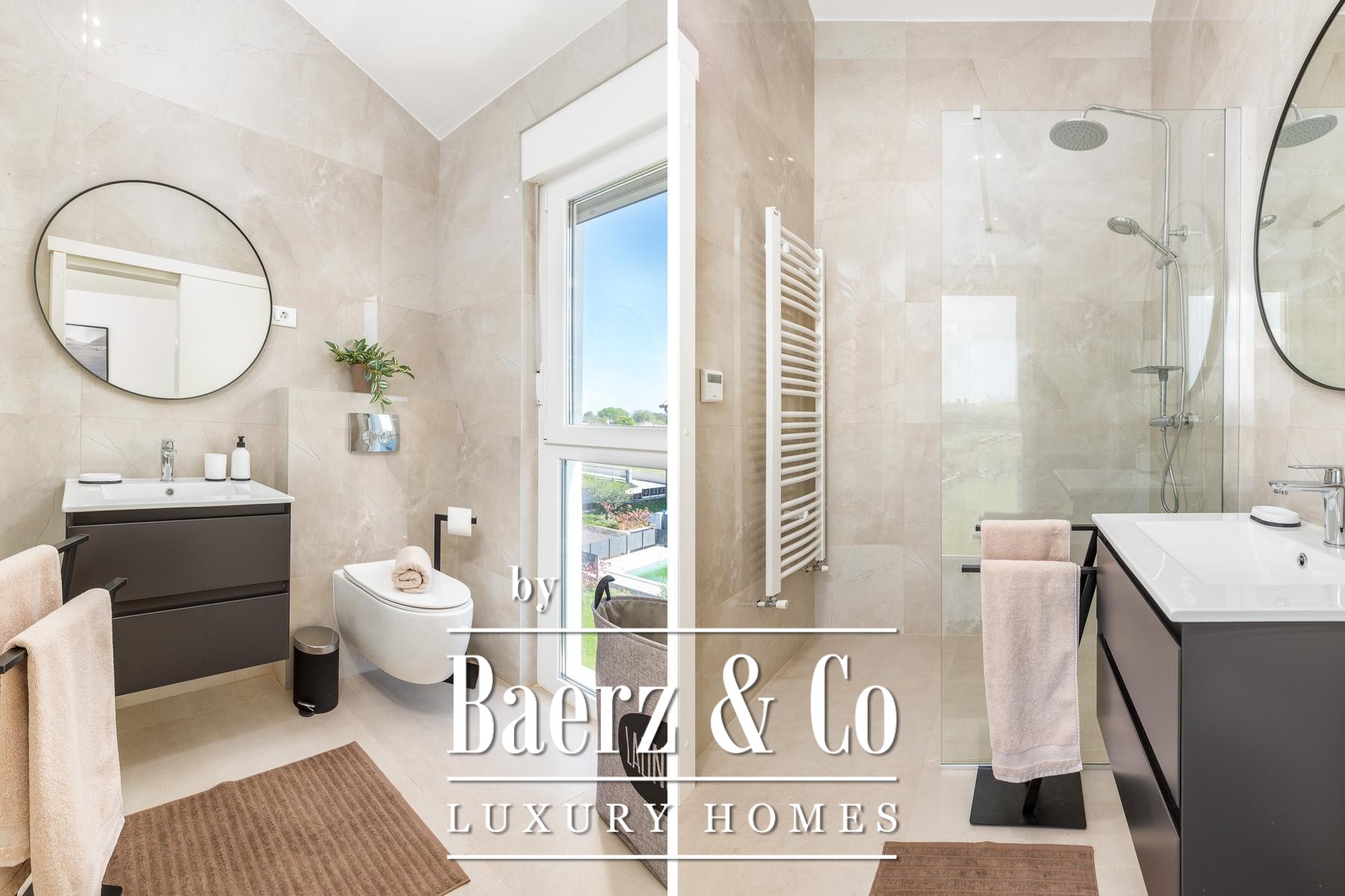 The ground floor centres on a luminous living space anchored by a contemporary fireplace, flowing seamlessly to the pool terrace and summer kitchen. The bespoke kitchen and dining area are complemented by a guest bedroom, storage, and utility rooms. Upstairs, three generous, sunlit bedrooms each feature an en suite bathroom, their scale and proportions suggesting private suites.