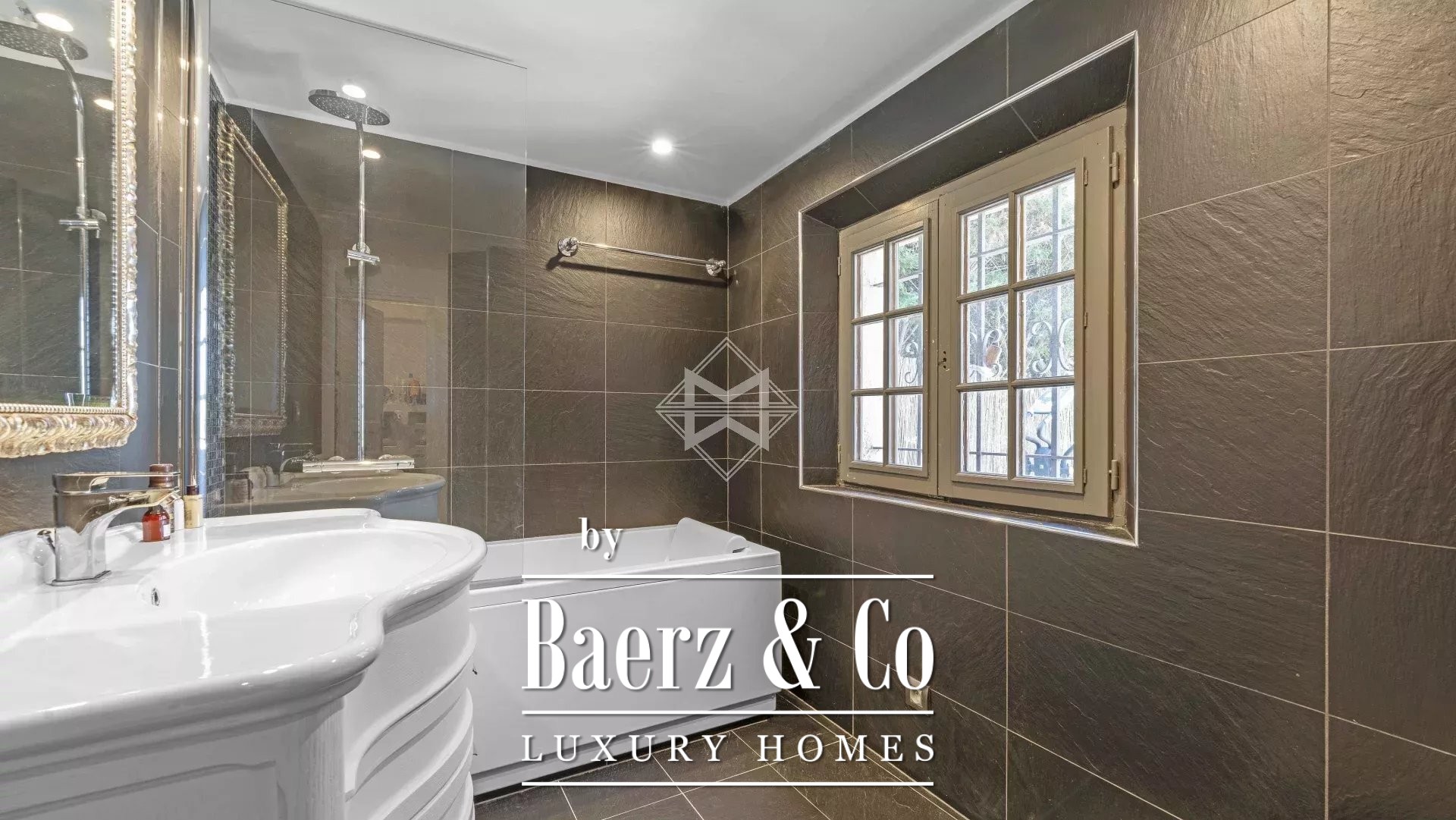 Set on a landscaped 1,200 m² plot, it features four bedrooms, three bathrooms, bright living spaces, and a fully equipped 25 m² independent studio.