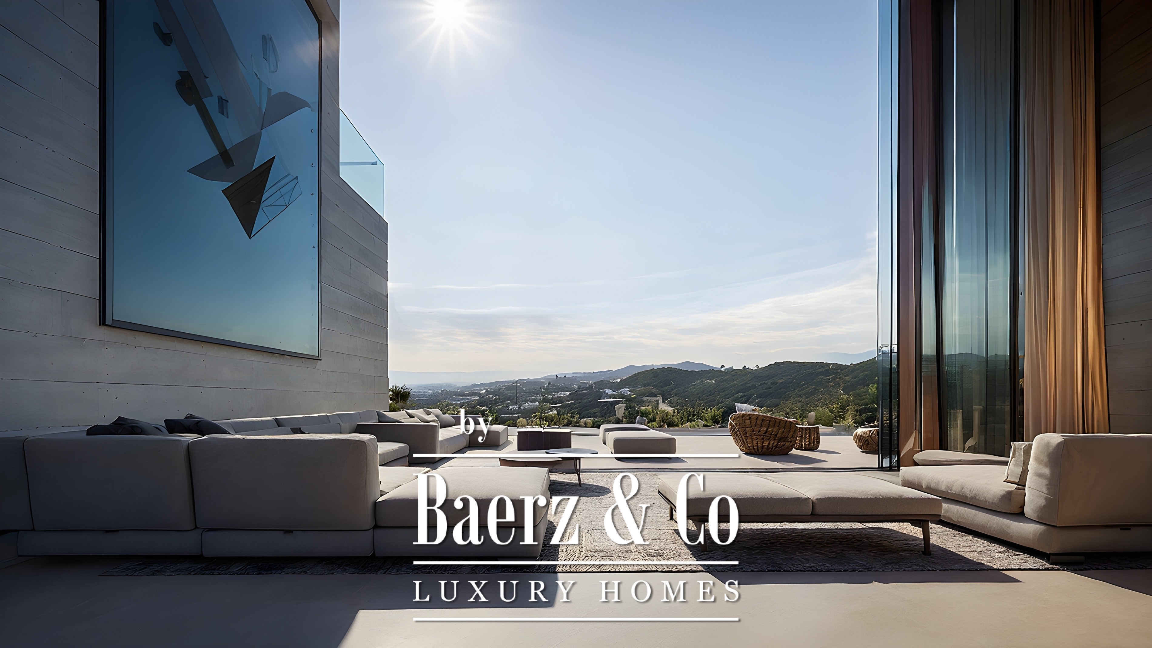 Upstairs, four bedrooms each offer en-suite baths and private terraces, affording open views and seclusion. Throughout, interior finishes reveal the quiet luxury of large-format ceramics, natural stone, and noble woods, while advanced systems such as aerothermal climate control, home automation, and photovoltaic panels ensure efficiency.