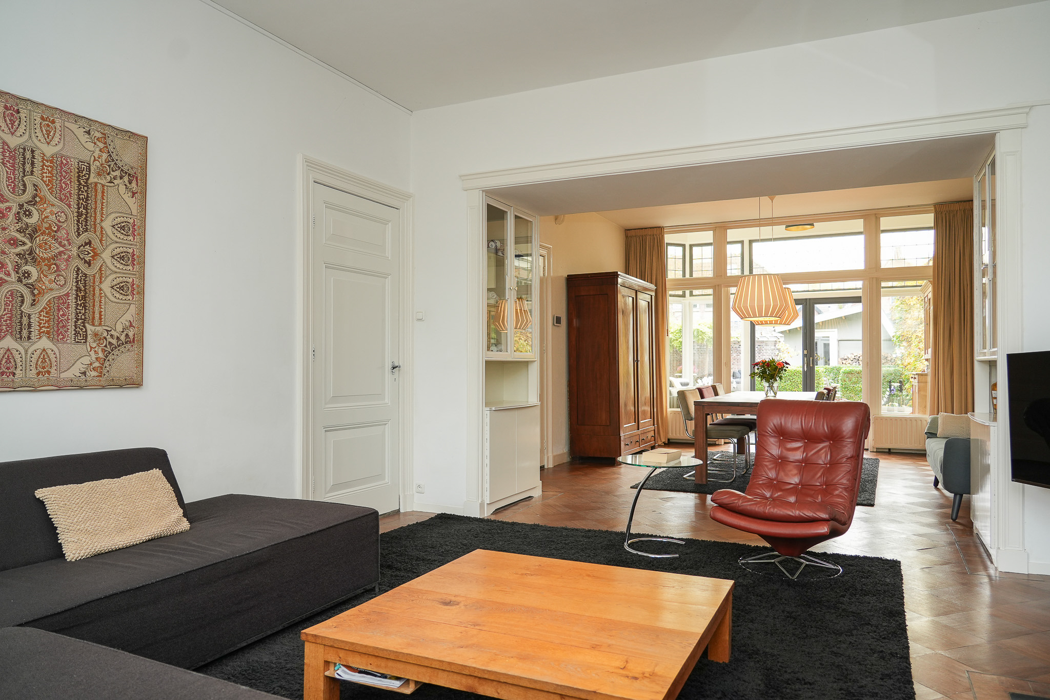 Behind the house lies a unique garden, 9.5 metres wide and 15 metres deep, facing east and south — offering both sunny and shaded spots throughout the day. In 2021, the owners were able to extend the plot, creating space for a large, tiled outbuilding (59 m²). This building is ideal for use as a garage for a classic car or boat, or as an artist’s studio. The double doors open onto the private parking area behind the house.