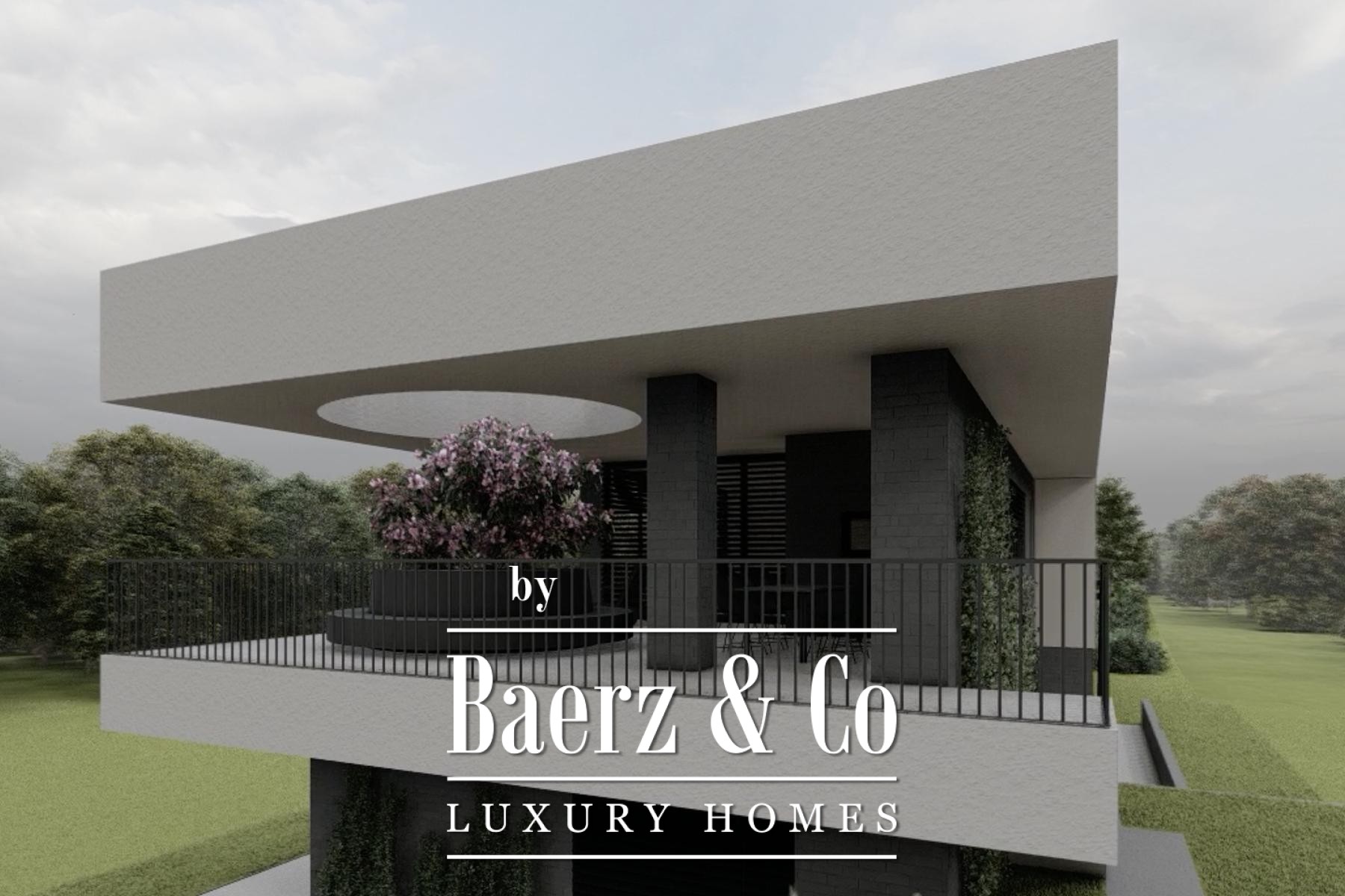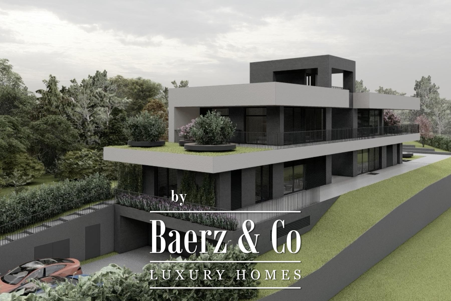 The villa’s layout unfolds across three spacious floors connected by an elevator. The lower ground floor provides a generous garage for three cars, dedicated storage rooms, a boiler room, and an indoor pool area envisioned for wellness, with space allocated for a sauna and bathroom. Opening onto a substantial terrace, this level merges seamlessly with the garden, extending the interior experience outdoors.
