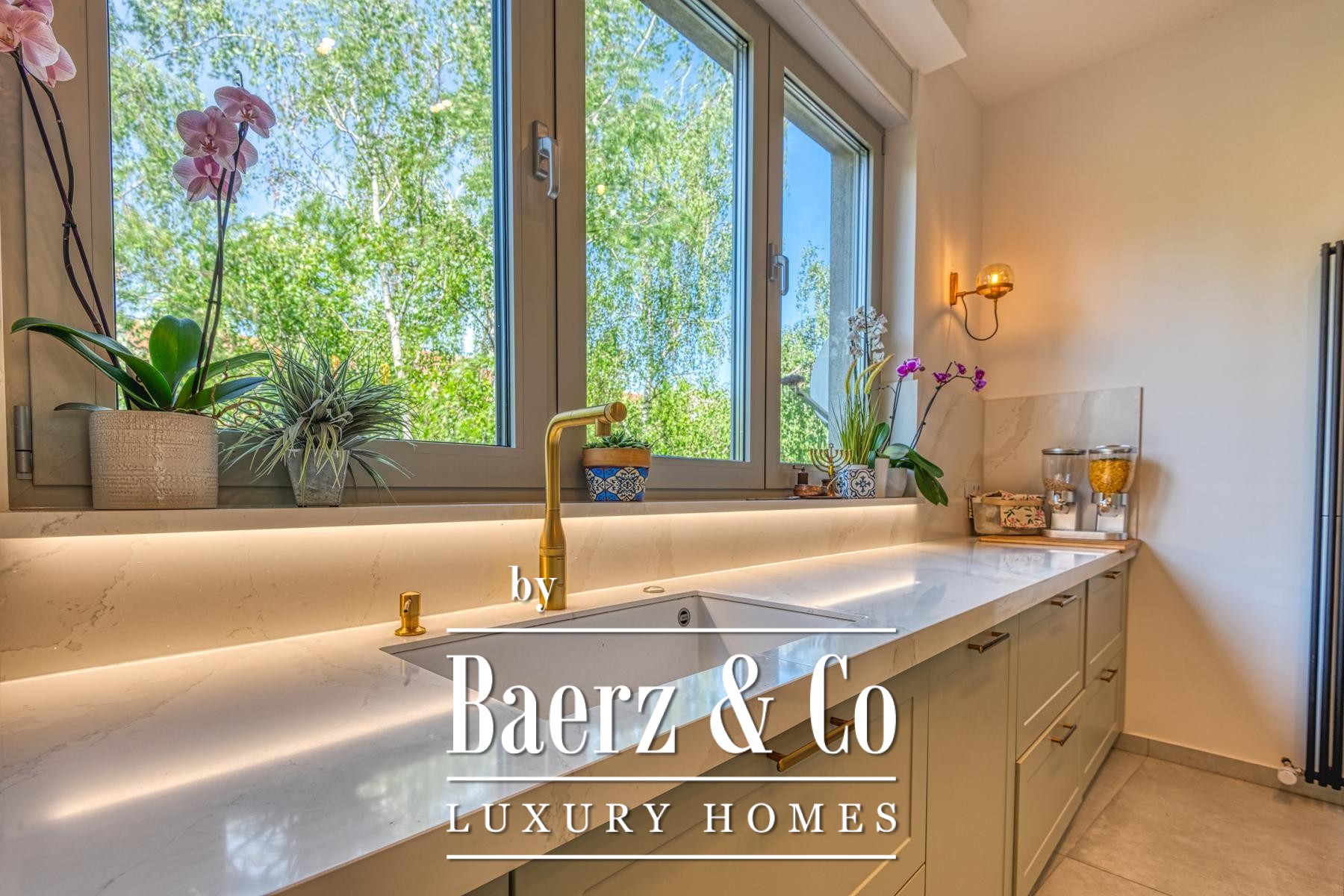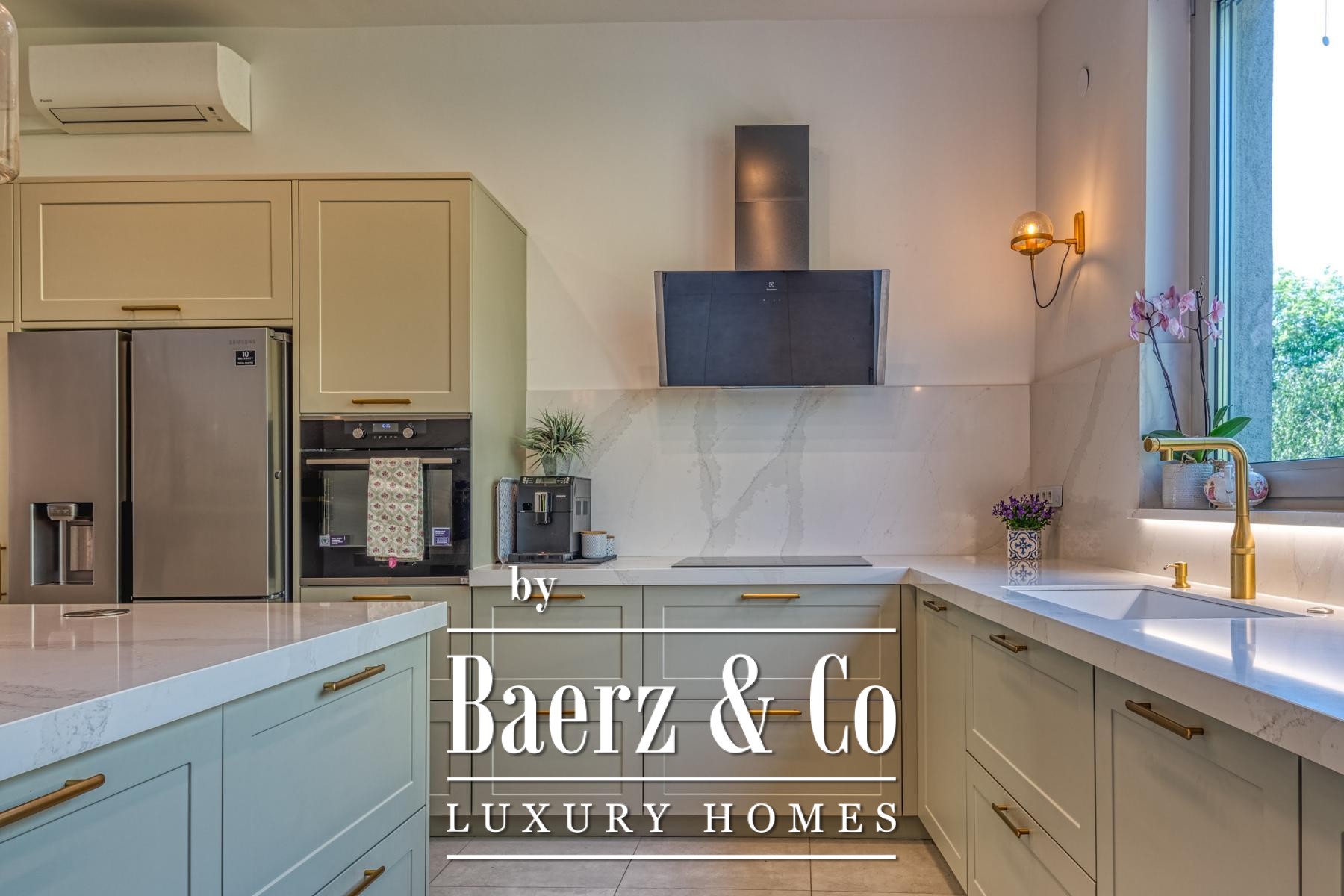 The private quarters occupy the second floor, delivering a master suite with direct terrace access, two further bedrooms opening onto an 11.42 m² terrace, and designer-equipped bathrooms enhanced by GROHE fixtures. Every detail reflects an unwavering commitment to quality — from aluminum joinery with triple glazing and A-class rustic flooring, to a custom kitchen and built-in wardrobes finished in neutral tones. Air conditioning, floor gas heating, a fireplace, and advanced Daikin climate systems ensure year-round comfort. Smart technology governs blinds and lighting with seamless integration by app or Amazon Alexa, complemented by a water purification system for elevated daily living.