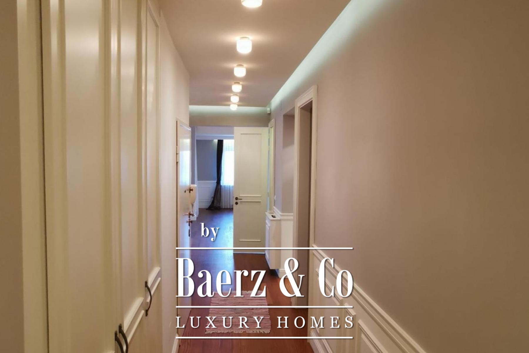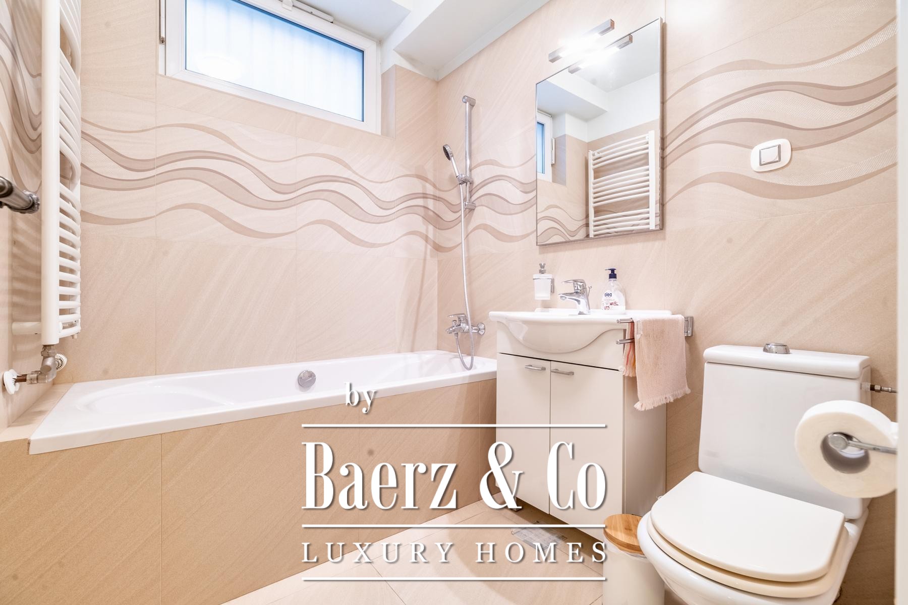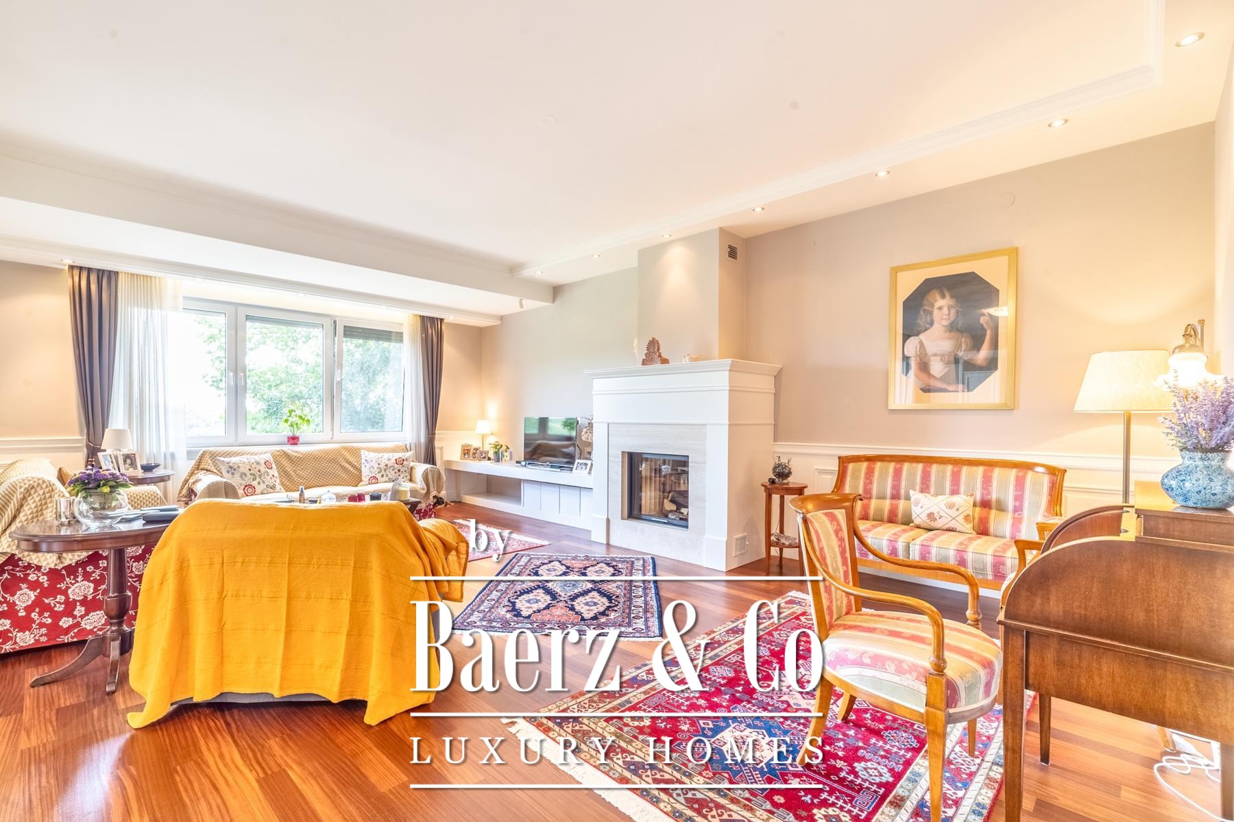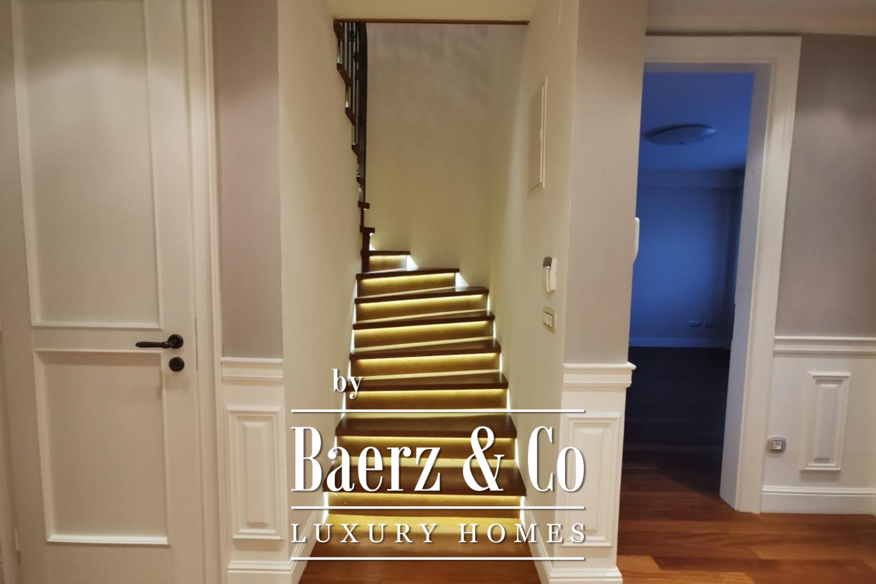 The lower level features two spacious bedrooms, both with walk-in closets and garden access, complemented by a further bathroom. Throughout, the apartment makes deliberate use of quality materials, new installations, and underfloor heating in bathrooms. The interior was renovated in 2019, with first-class parquet and considered finishes shaping every space.