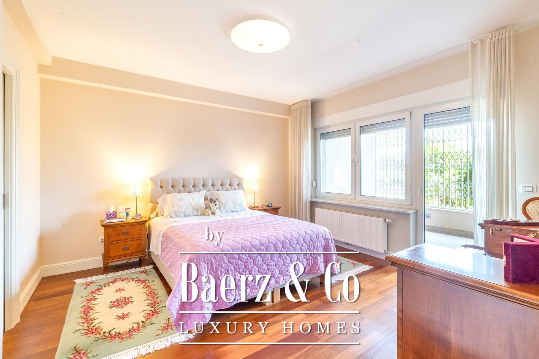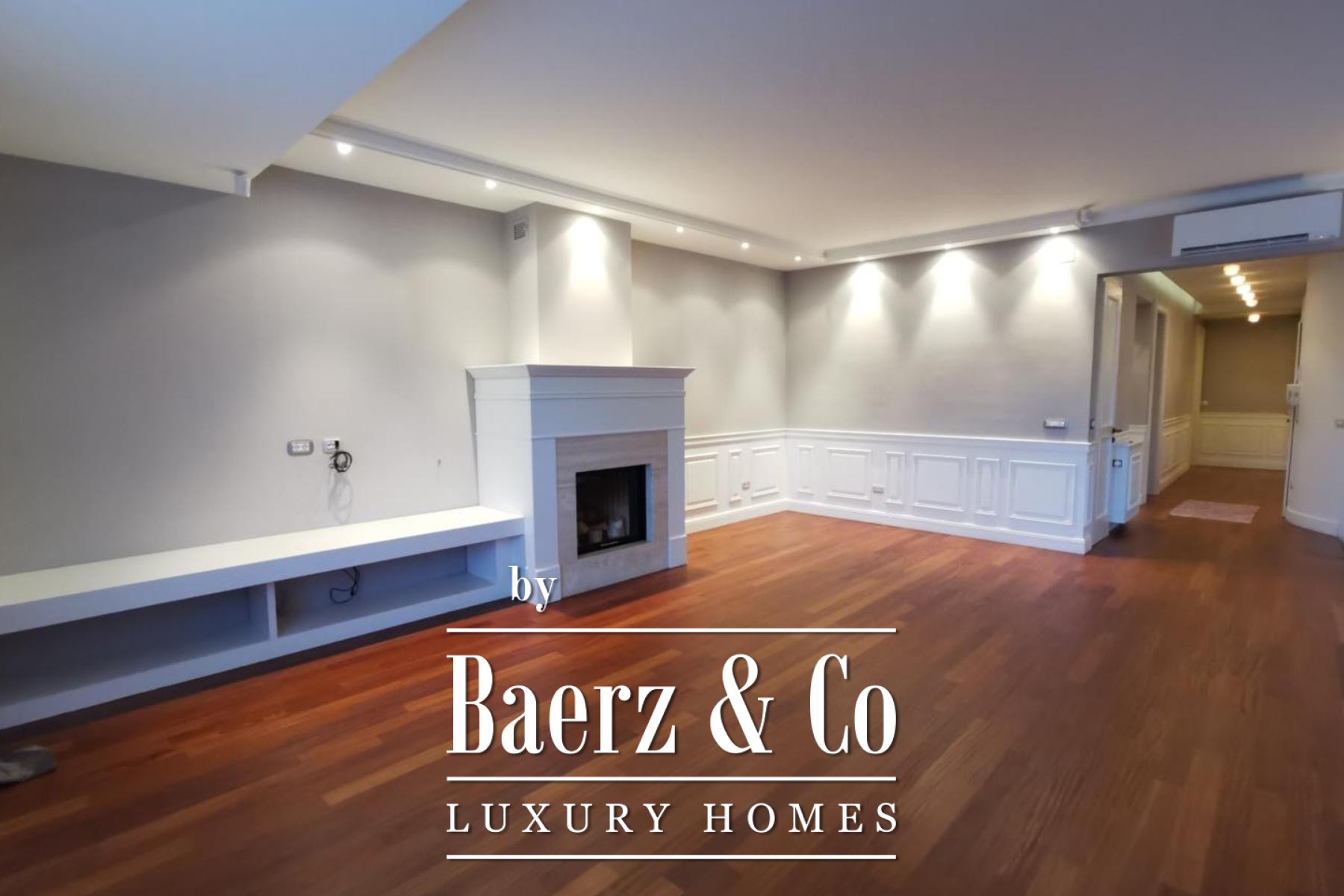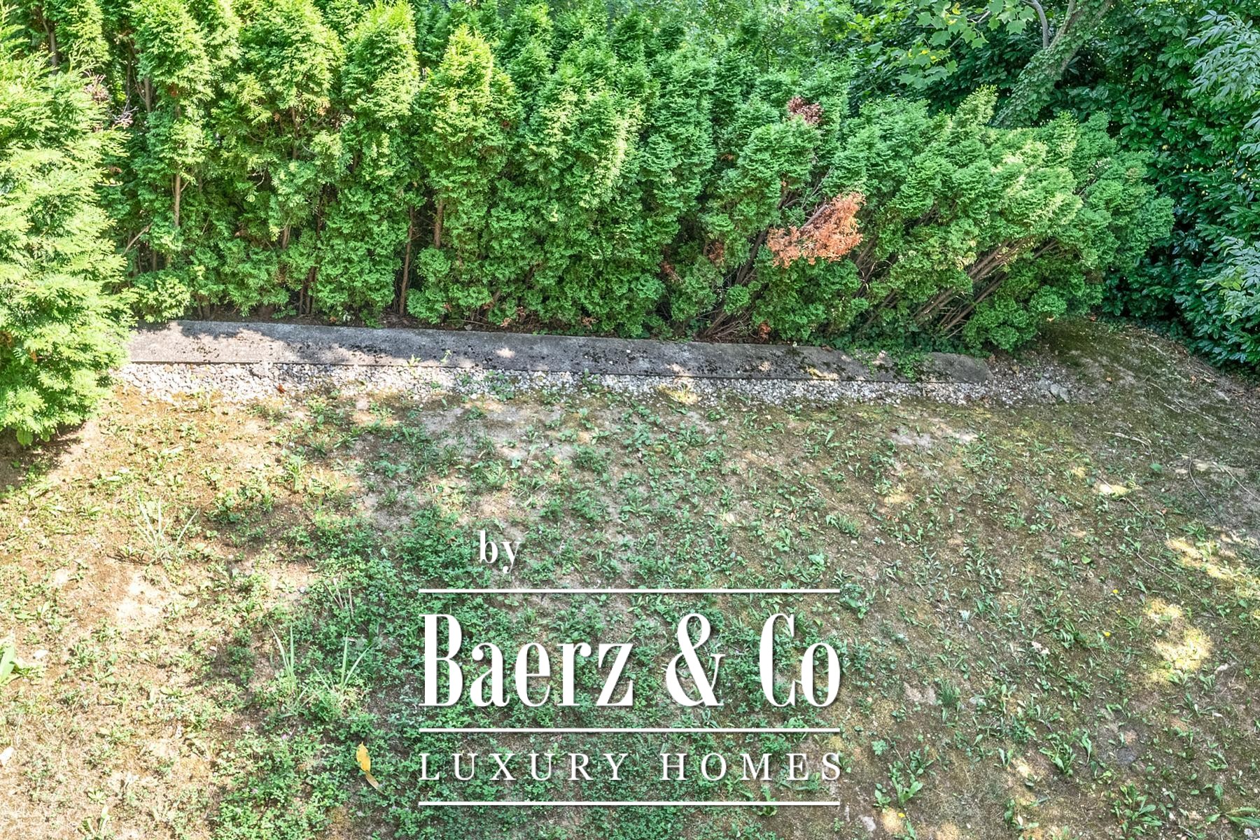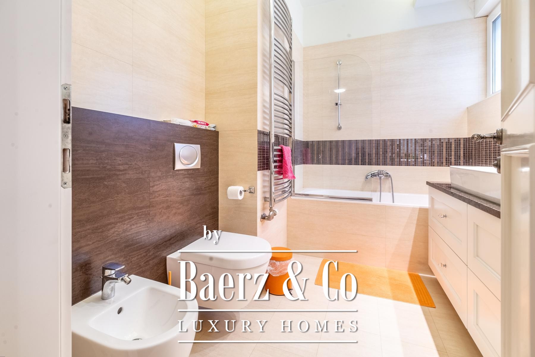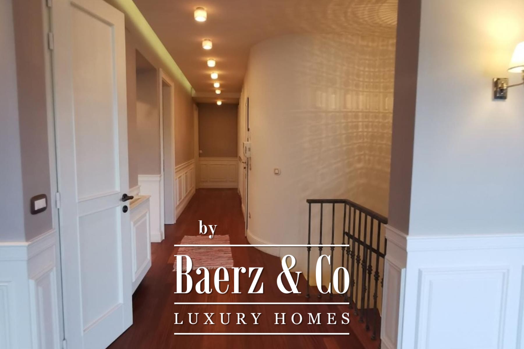 The lower level features two spacious bedrooms, both with walk-in closets and garden access, complemented by a further bathroom. Throughout, the apartment makes deliberate use of quality materials, new installations, and underfloor heating in bathrooms. The interior was renovated in 2019, with first-class parquet and considered finishes shaping every space.
