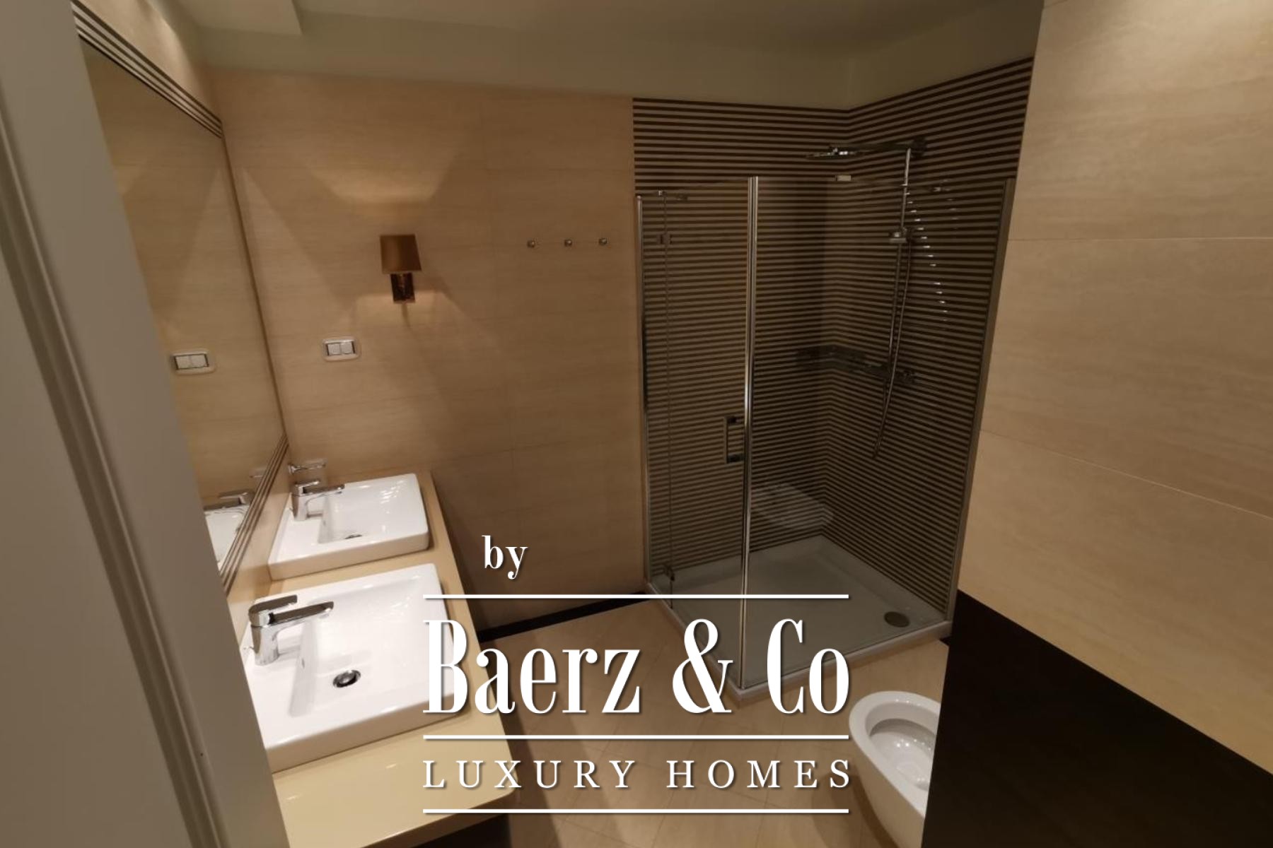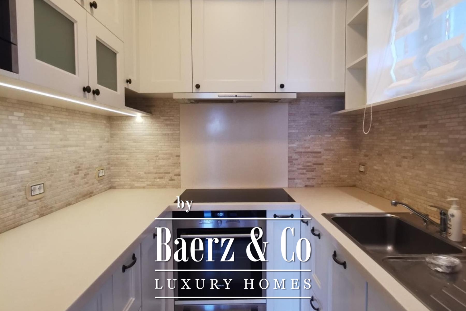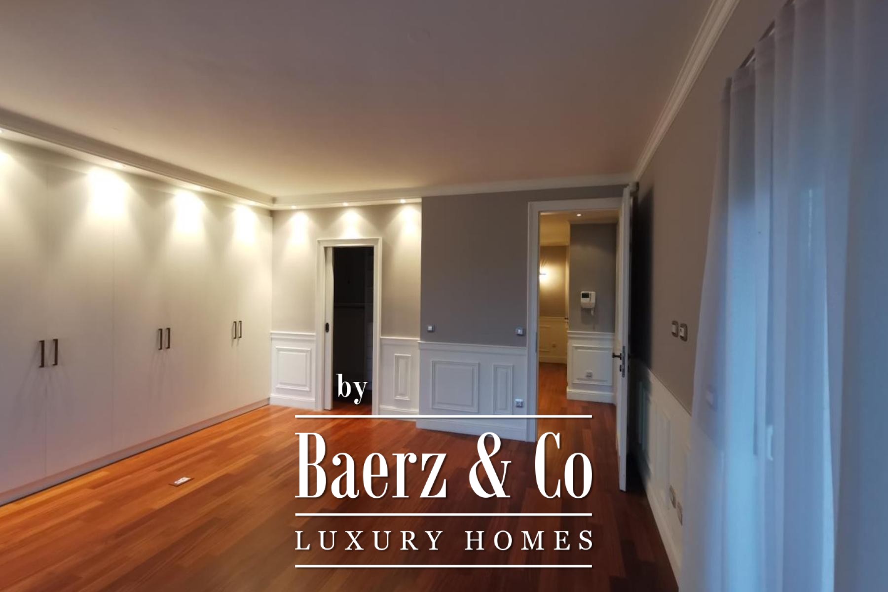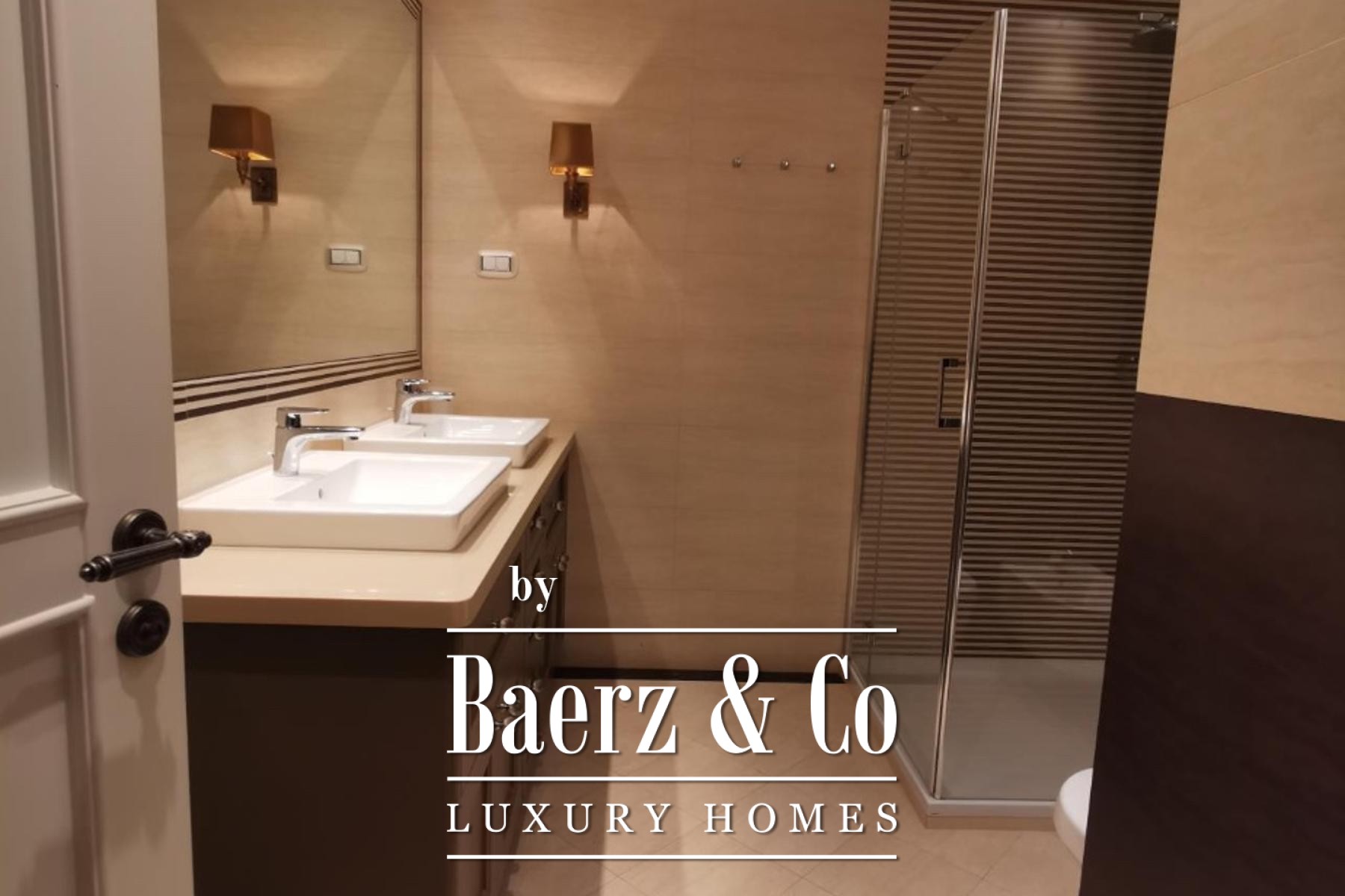 The lower level features two spacious bedrooms, both with walk-in closets and garden access, complemented by a further bathroom. Throughout, the apartment makes deliberate use of quality materials, new installations, and underfloor heating in bathrooms. The interior was renovated in 2019, with first-class parquet and considered finishes shaping every space.