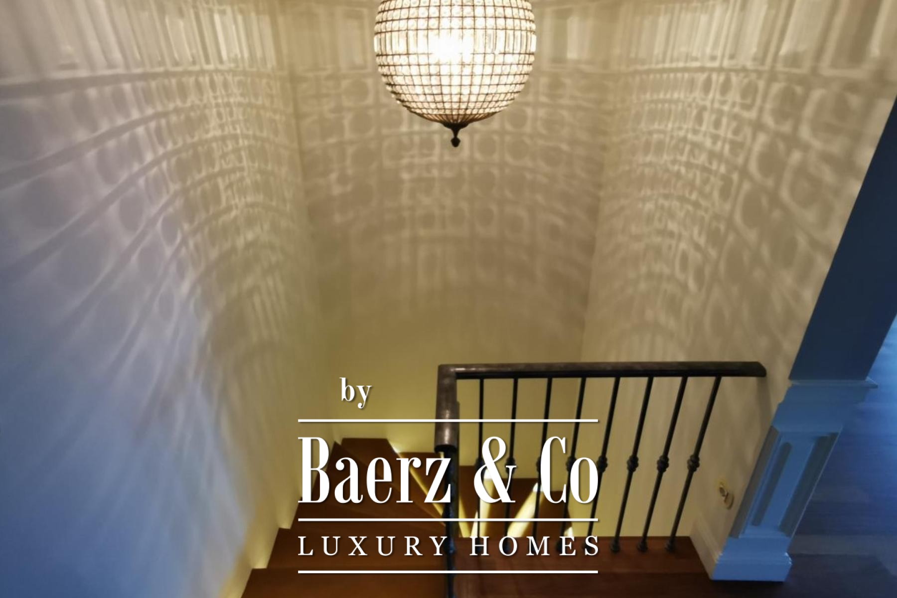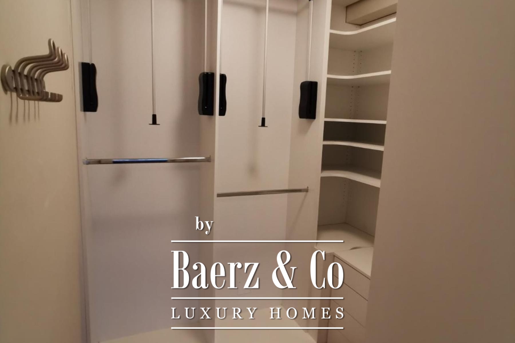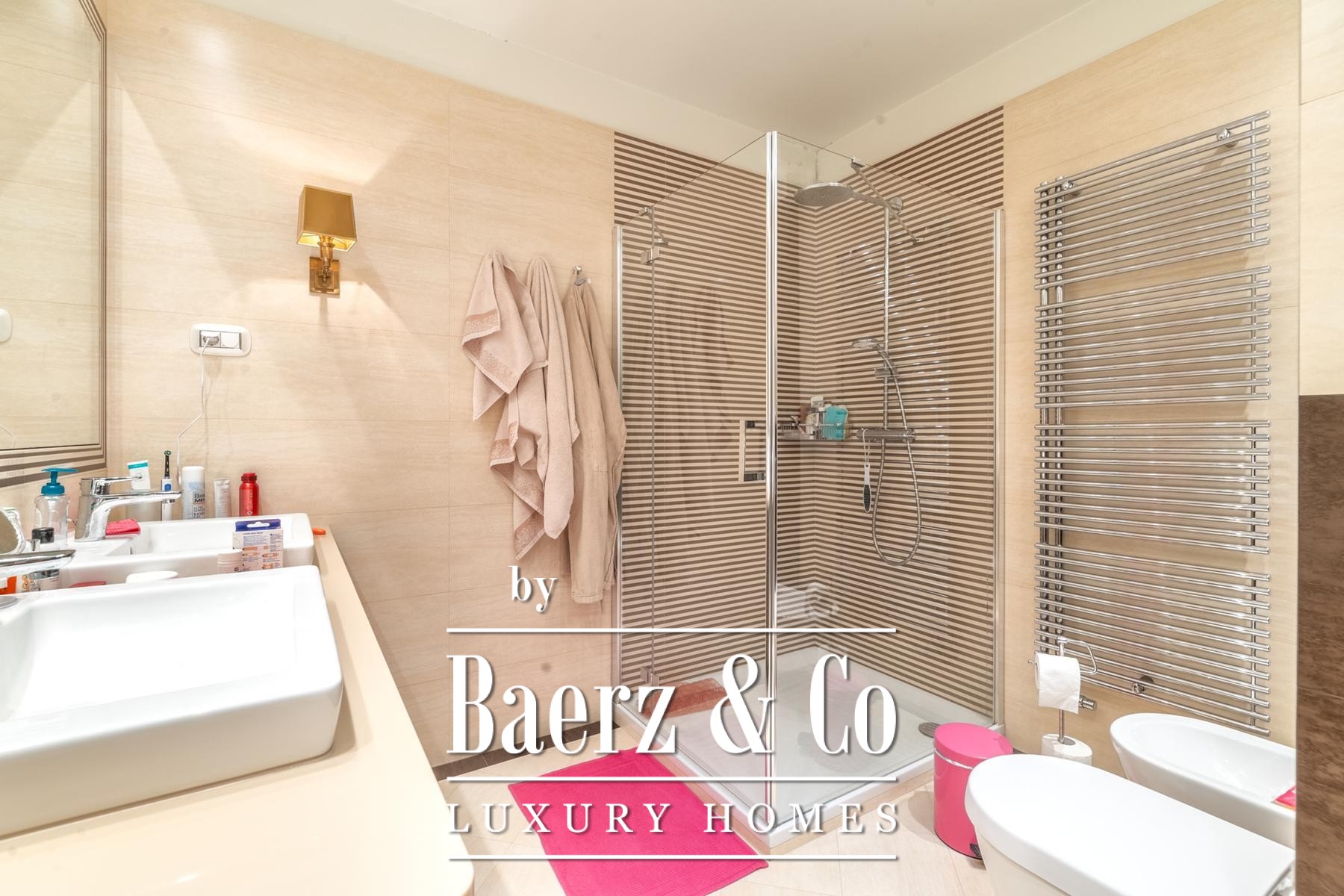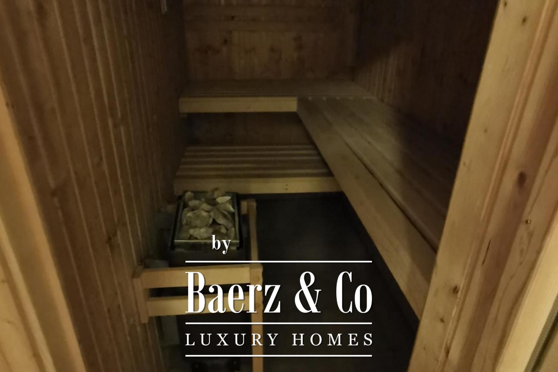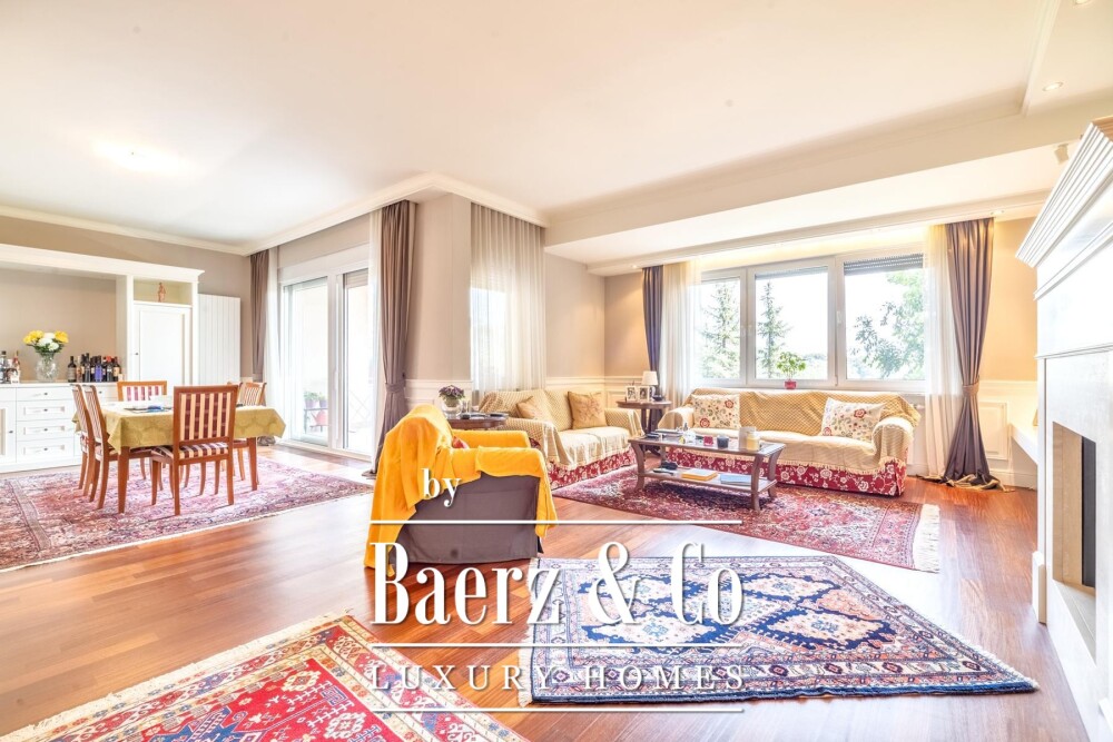 The lower level features two spacious bedrooms, both with walk-in closets and garden access, complemented by a further bathroom. Throughout, the apartment makes deliberate use of quality materials, new installations, and underfloor heating in bathrooms. The interior was renovated in 2019, with first-class parquet and considered finishes shaping every space.