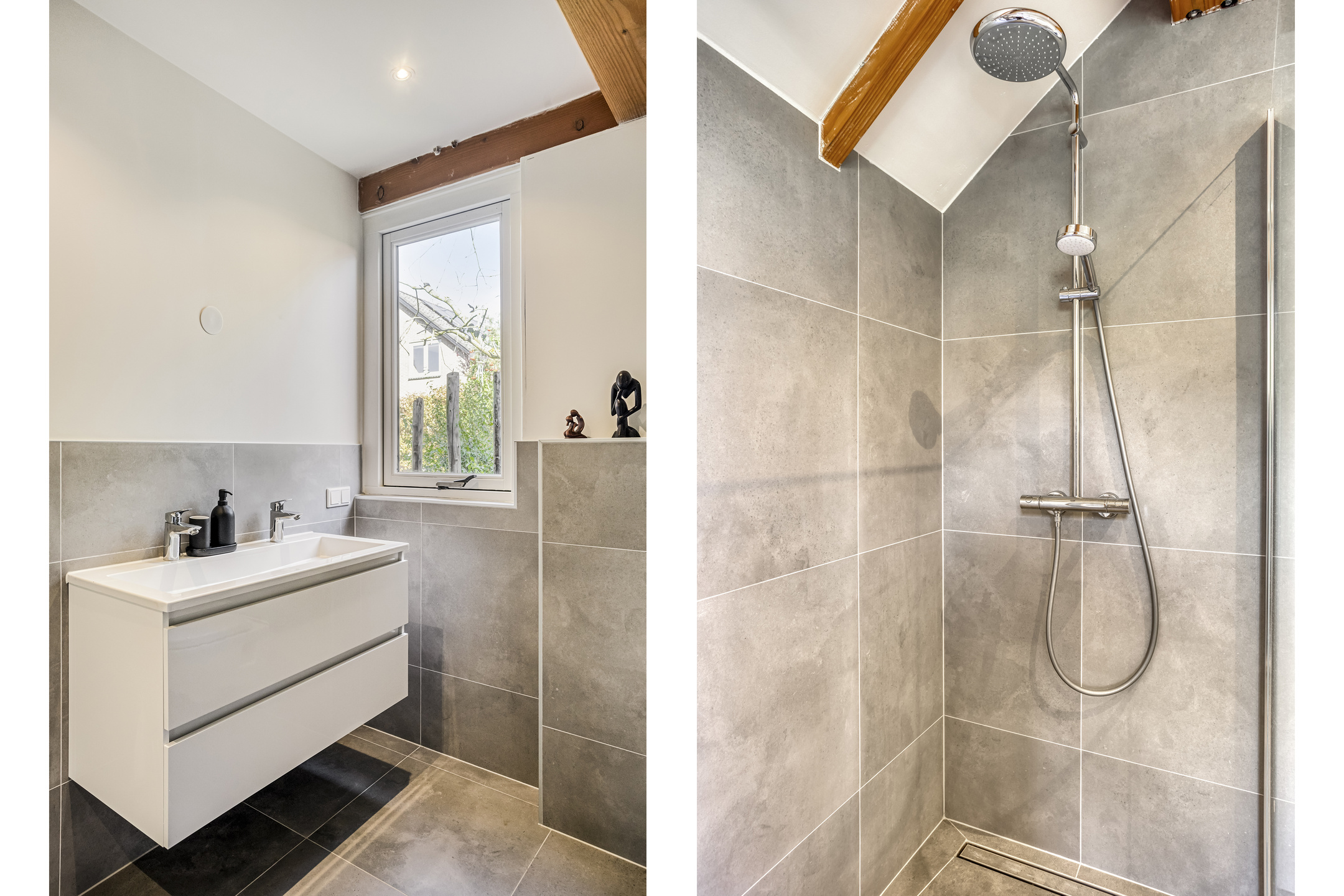 Bright and inviting, with French doors leading to the garden and a cozy wood-burning stove for winter nights. High ceilings and original exposed beams complete the picture. Part of the garage has been integrated into the living area, creating even more space! Planning an extension? The foundation is already in place.